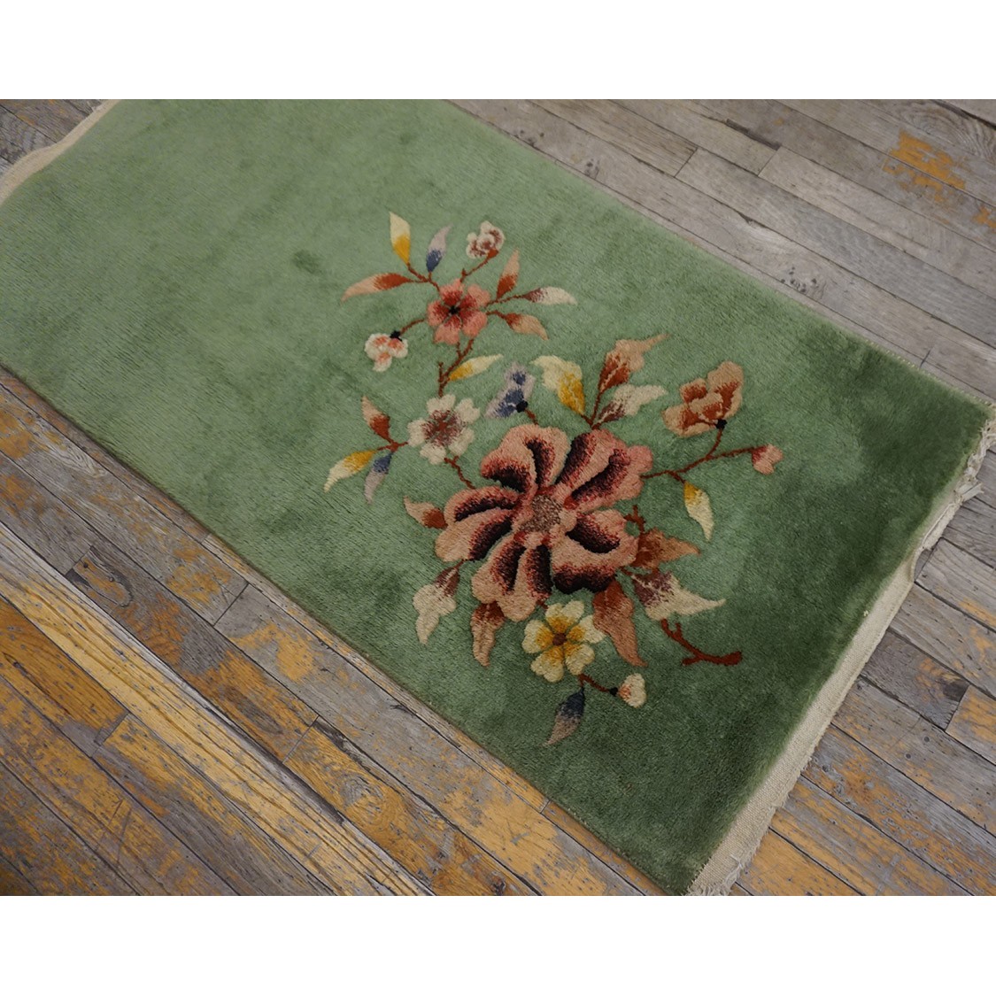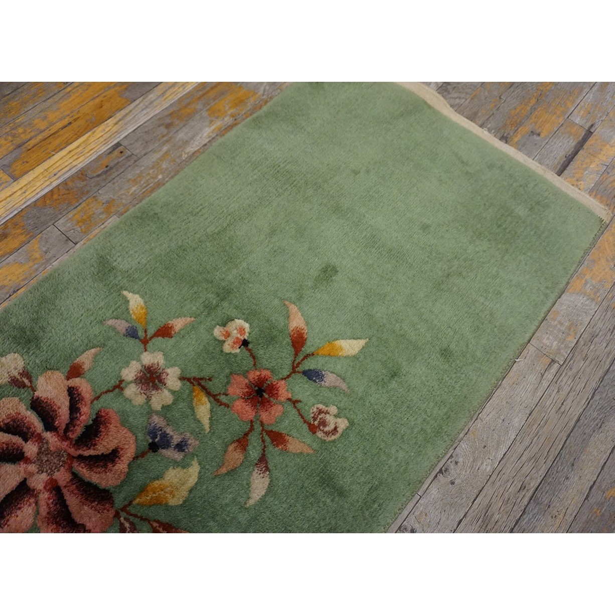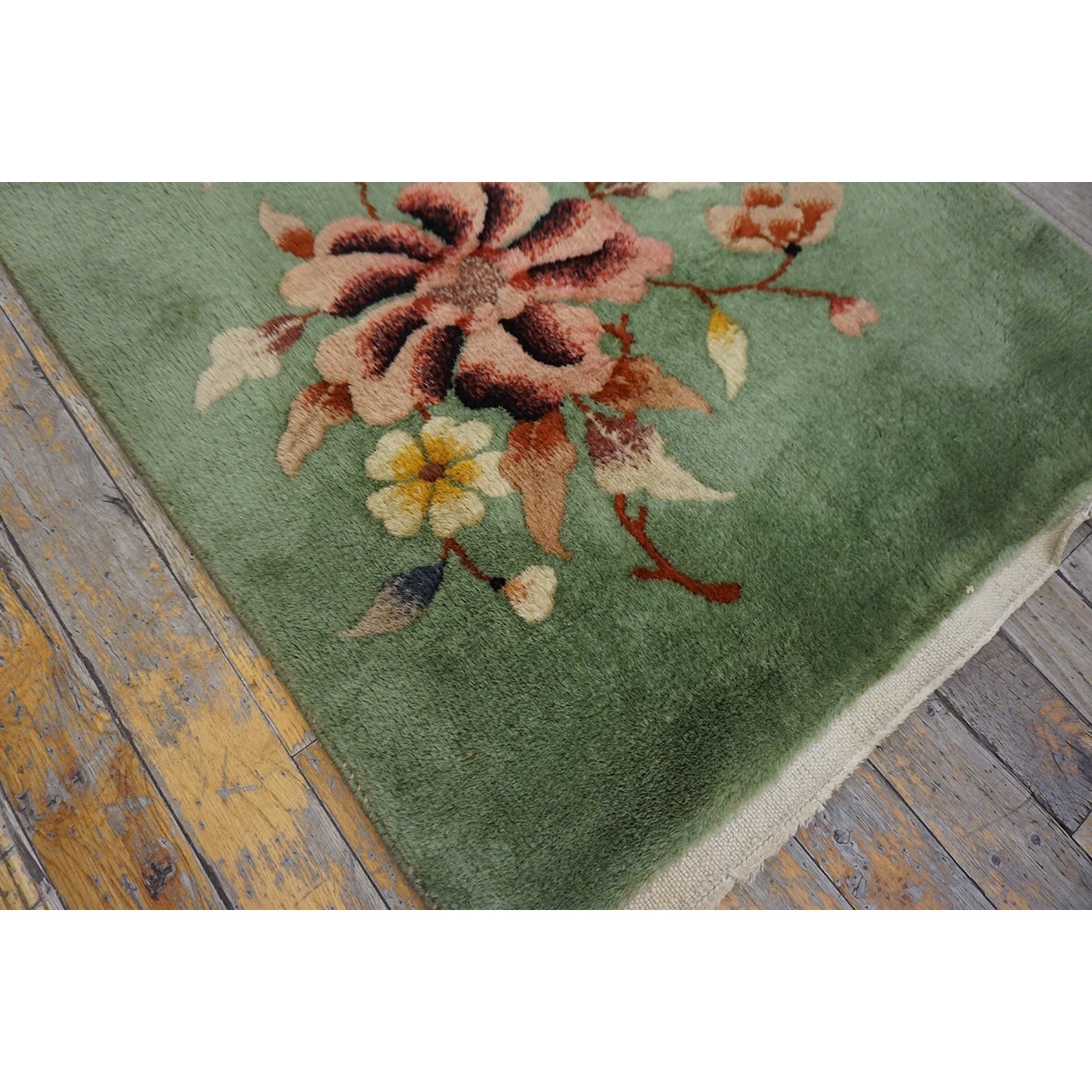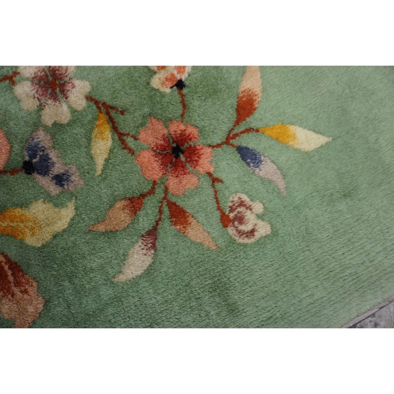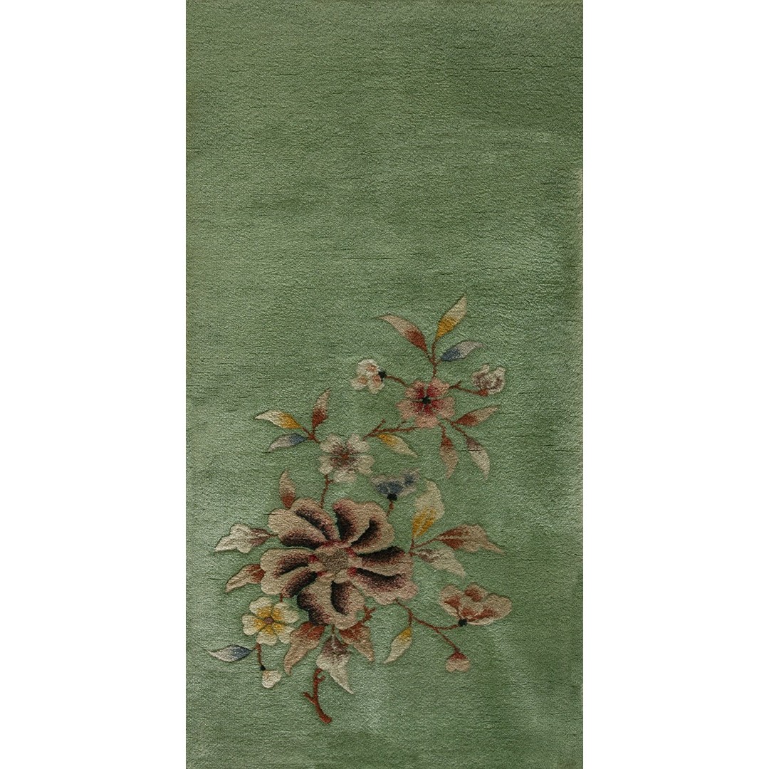 DescriptionChineseCarpets made in China proper. See entries Ningshia, Peking, Art Deco. Chinese - Art DecoAs the name implies, pieces woven between the wars for the Western market by mostly American owned firms especially Nichols and Fette, in thick heavy weaves using strong colors, asymmetric patterns and downplaying the Chinese-ness of the carpet. Nichols rugs are more strong toned than the pastel Fette. Most were woven in the coastal port city of Tientsin. Other lesser known workshops were also active. Some pieces are ultra-geometric and haute-Deco moderne in character: these are very rare. More frequent are pieces with bits of Chinese ornament: vases or other precious objects, paeonies, vines, fences, etc. Most common is the 9 x 12 size, in colors never found in mainstream Chinese rugs: backgrounds in black, mauve, purple, hot pink, orange, olive, employing the best synthetic chrome dyes of the period. Prices are still reasonable and carpets in top condition are available. | |