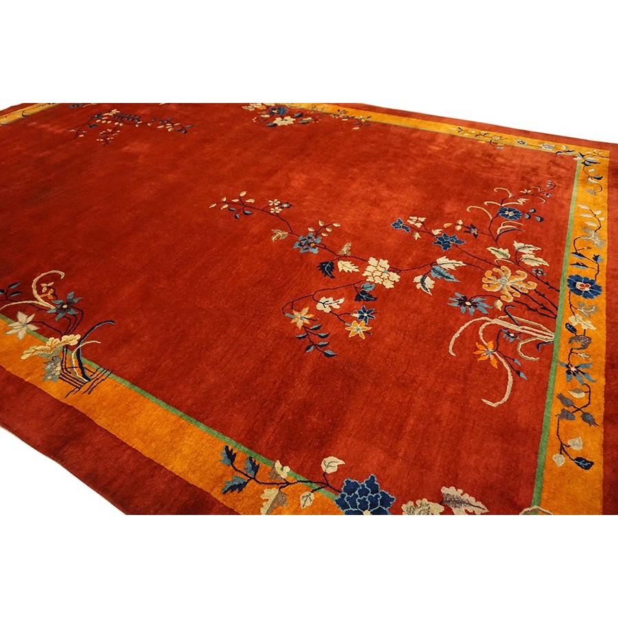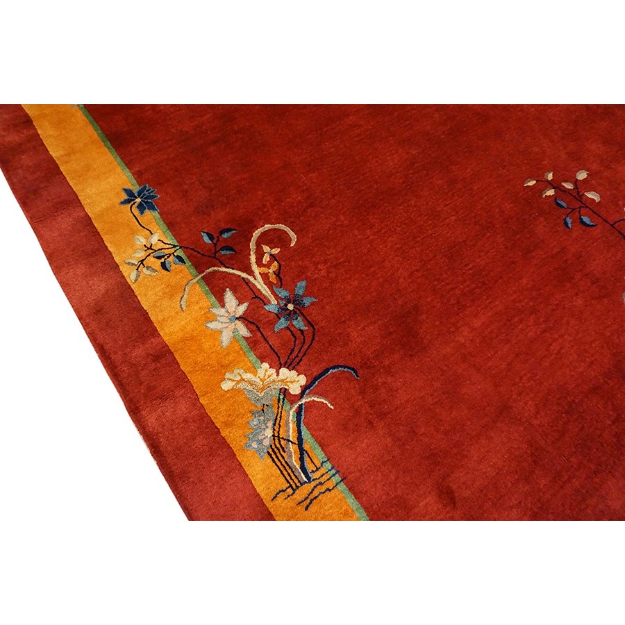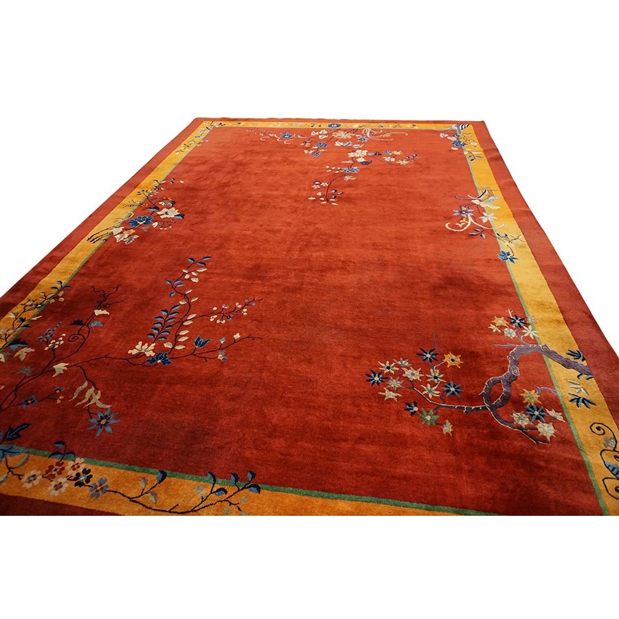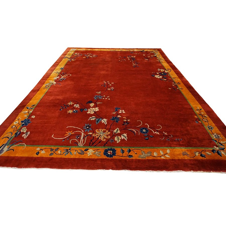 DescriptionChineseCarpets made in China proper. See entries Ningshia, Peking, Art Deco. Chinese - Art DecoAs the name implies, pieces woven between the wars for the Western market by mostly American owned firms especially Nichols and Fette, in thick heavy weaves using strong colors, asymmetric patterns and downplaying the Chinese-ness of the carpet. Nichols rugs are more strong toned than the pastel Fette. Most were woven in the coastal port city of Tientsin. Other lesser known workshops were also active. Some pieces are ultra-geometric and haute-Deco moderne in character: these are very rare. More frequent are pieces with bits of Chinese ornament: vases or other precious objects, paeonies, vines, fences, etc. Most common is the 9 x 12 size, in colors never found in mainstream Chinese rugs: backgrounds in black, mauve, purple, hot pink, orange, olive, employing the best synthetic chrome dyes of the period. Prices are still reasonable and carpets in top condition are available. | |