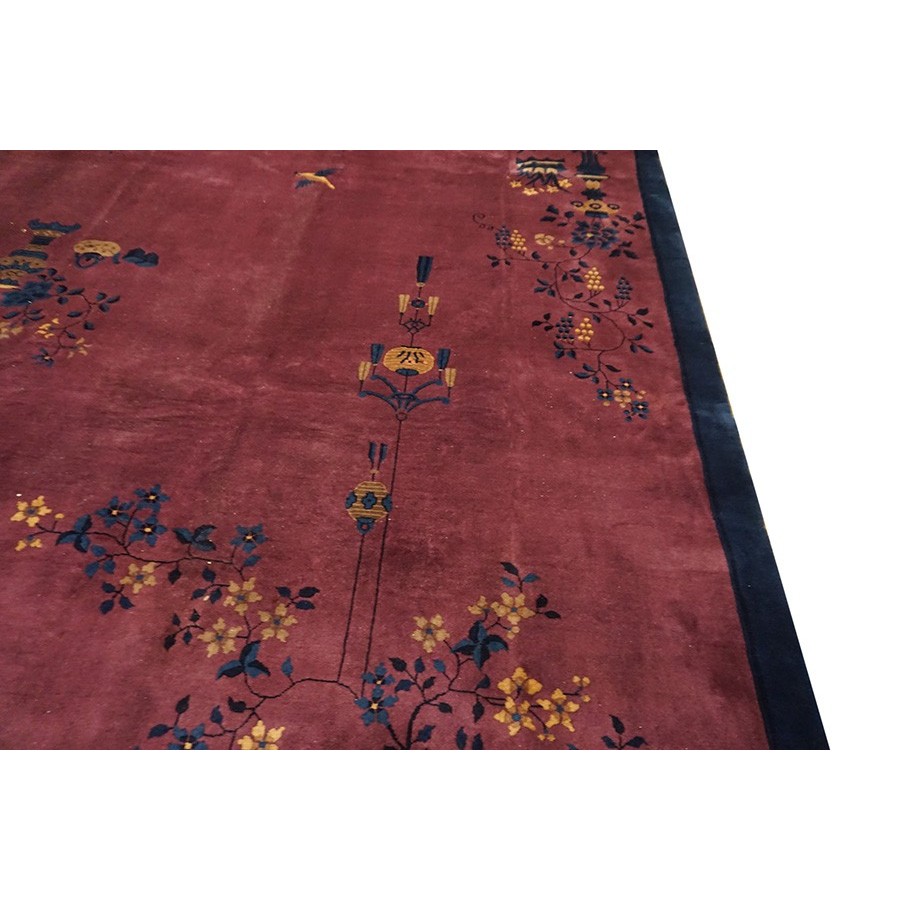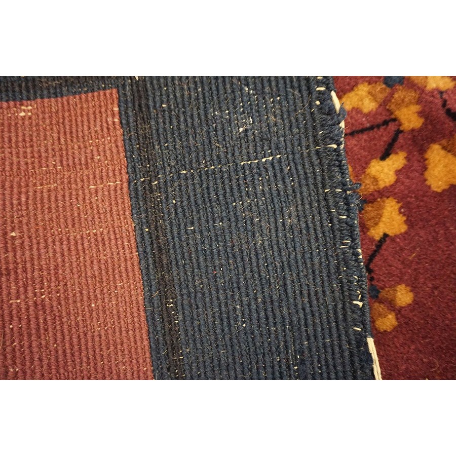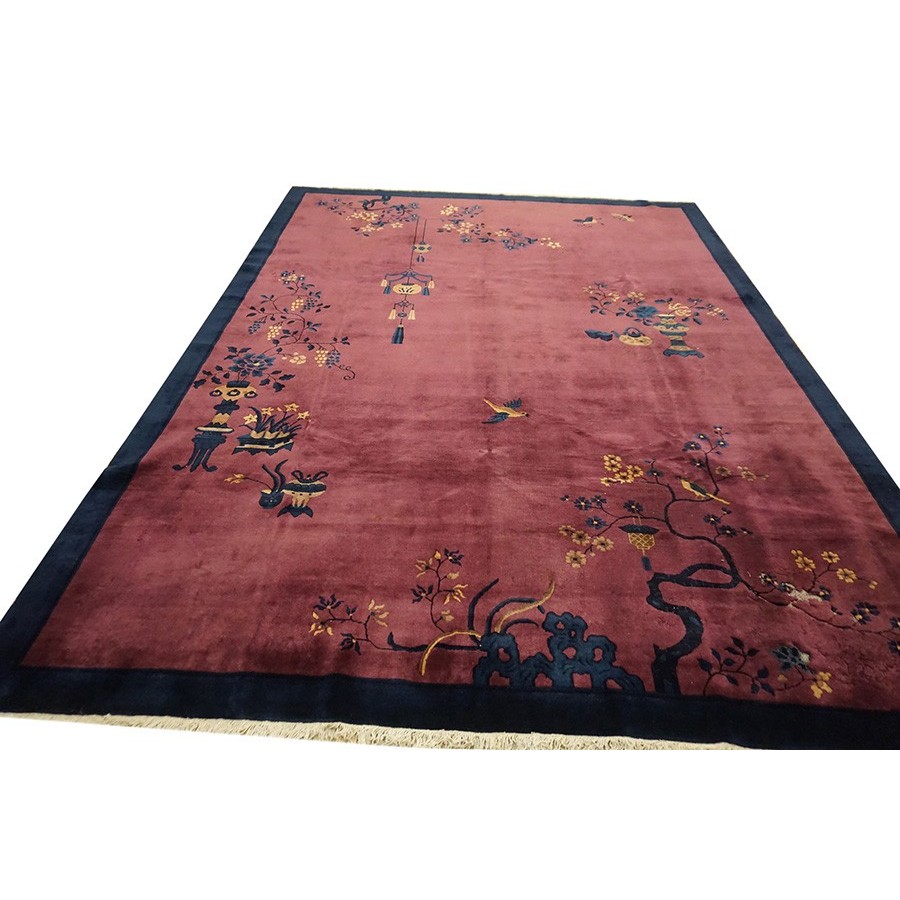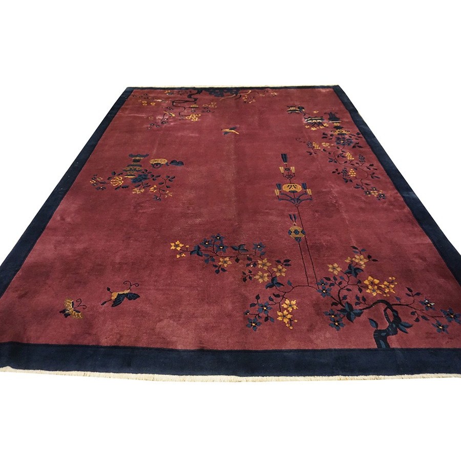 DescriptionChineseCarpets made in China proper. See entries Ningshia, Peking, Art Deco. Chinese - Art DecoAs the name implies, pieces woven between the wars for the Western market by mostly American owned firms especially Nichols and Fette, in thick heavy weaves using strong colors, asymmetric patterns and downplaying the Chinese-ness of the carpet. Nichols rugs are more strong toned than the pastel Fette. Most were woven in the coastal port city of Tientsin. Other lesser known workshops were also active. Some pieces are ultra-geometric and haute-Deco moderne in character: these are very rare. More frequent are pieces with bits of Chinese ornament: vases or other precious objects, paeonies, vines, fences, etc. Most common is the 9 x 12 size, in colors never found in mainstream Chinese rugs: backgrounds in black, mauve, purple, hot pink, orange, olive, employing the best synthetic chrome dyes of the period. Prices are still reasonable and carpets in top condition are available. | |