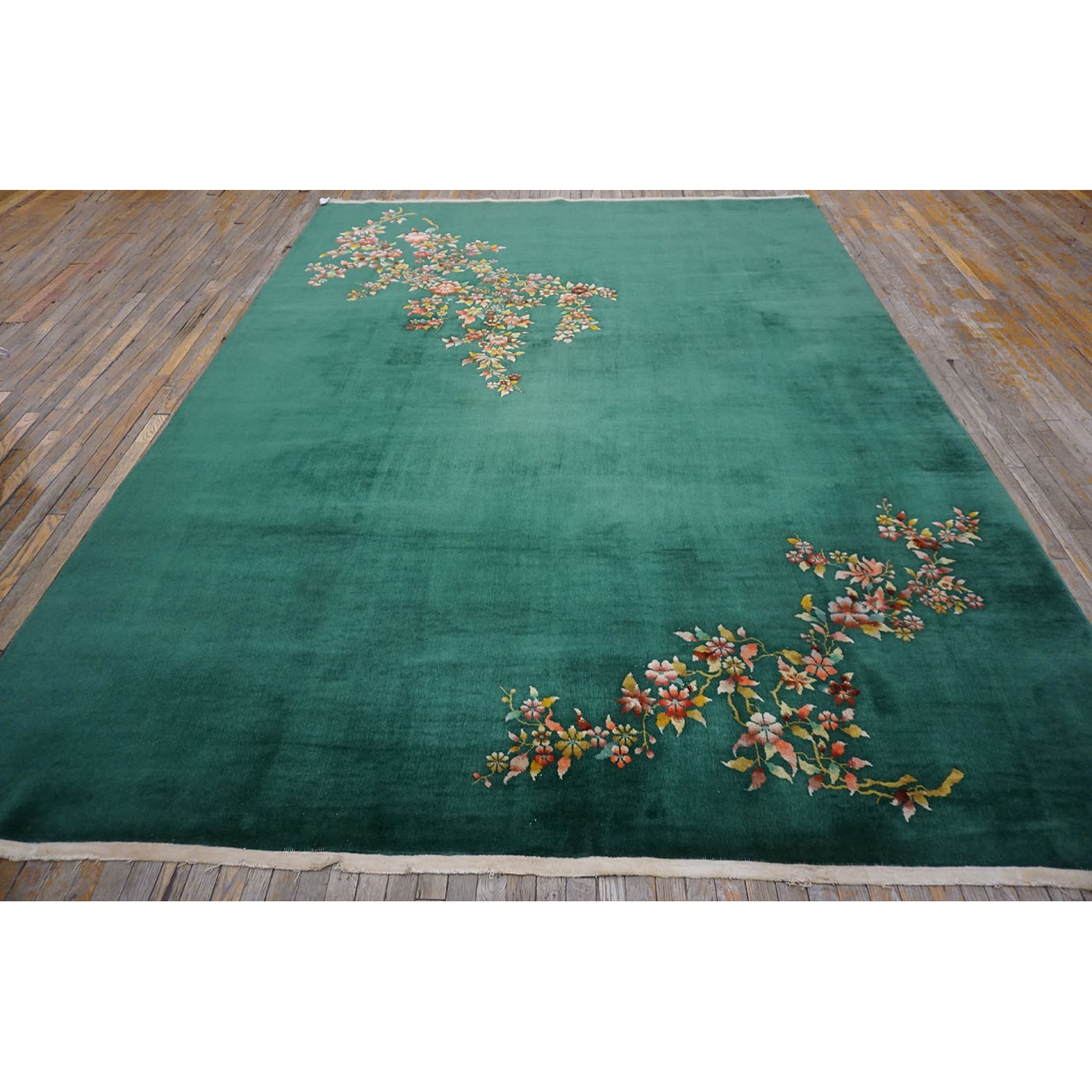 DescriptionChineseCarpets made in China proper. See entries Ningshia, Peking, Art Deco. Chinese - Art DecoAs the name implies, pieces woven between the wars for the Western market by mostly American owned firms especially Nichols and Fette, in thick heavy weaves using strong colors, asymmetric patterns and downplaying the Chinese-ness of the carpet. Nichols rugs are more strong toned than the pastel Fette. Most were woven in the coastal port city of Tientsin. Other lesser known workshops were also active. Some pieces are ultra-geometric and haute-Deco moderne in character: these are very rare. More frequent are pieces with bits of Chinese ornament: vases or other precious objects, paeonies, vines, fences, etc. Most common is the 9 x 12 size, in colors never found in mainstream Chinese rugs: backgrounds in black, mauve, purple, hot pink, orange, olive, employing the best synthetic chrome dyes of the period. Prices are still reasonable and carpets in top condition are available. | |
