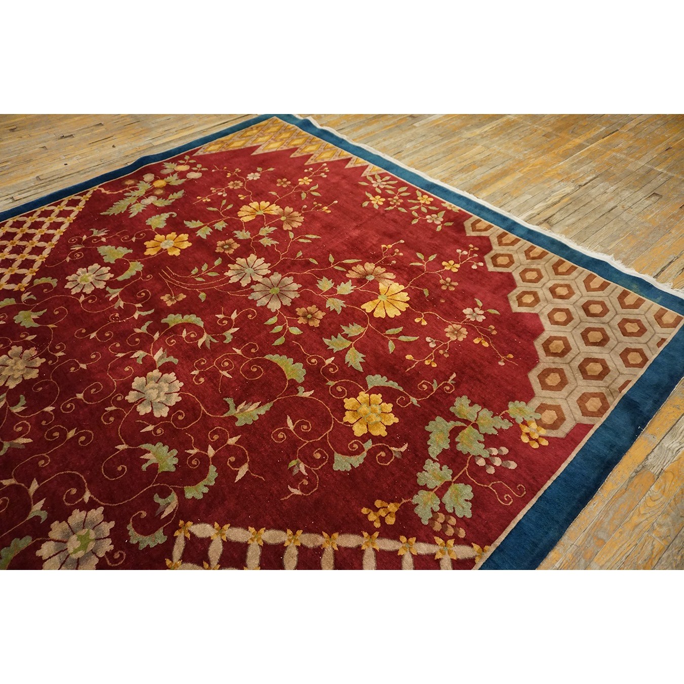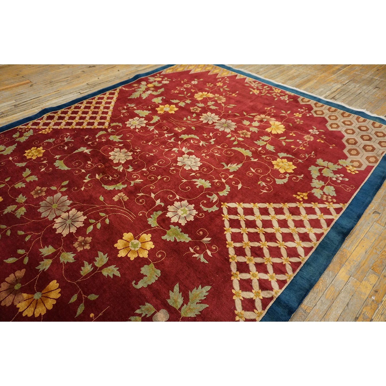 DescriptionChineseCarpets made in China proper. See entries Ningshia, Peking, Art Deco. Chinese - Art DecoAs the name implies, pieces woven between the wars for the Western market by mostly American owned firms especially Nichols and Fette, in thick heavy weaves using strong colors, asymmetric patterns and downplaying the Chinese-ness of the carpet. Nichols rugs are more strong toned than the pastel Fette. Most were woven in the coastal port city of Tientsin. Other lesser known workshops were also active. Some pieces are ultra-geometric and haute-Deco moderne in character: these are very rare. More frequent are pieces with bits of Chinese ornament: vases or other precious objects, paeonies, vines, fences, etc. Most common is the 9 x 12 size, in colors never found in mainstream Chinese rugs: backgrounds in black, mauve, purple, hot pink, orange, olive, employing the best synthetic chrome dyes of the period. Prices are still reasonable and carpets in top condition are available. | |