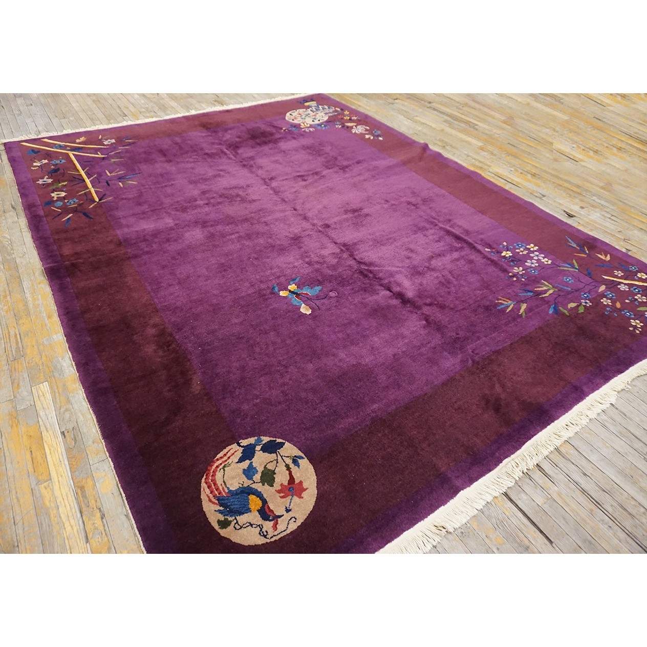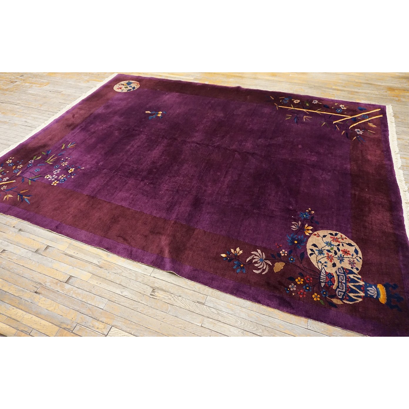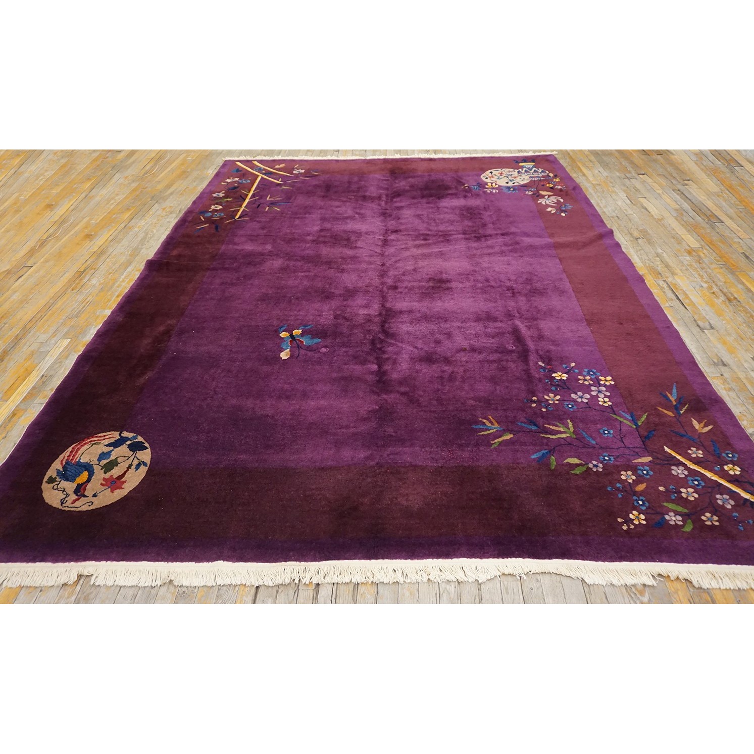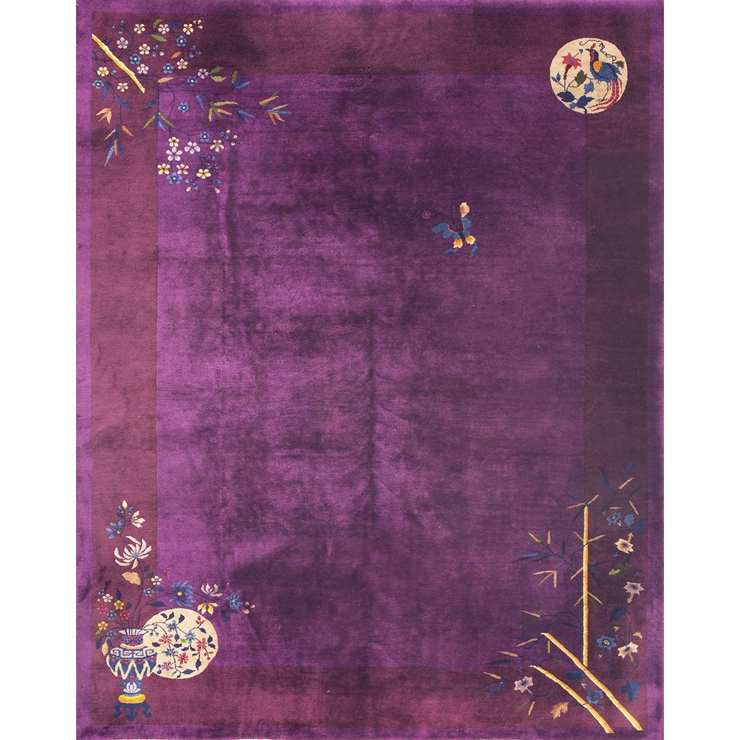 DescriptionChineseCarpets made in China proper. See entries Ningshia, Peking, Art Deco. Chinese - Art DecoAs the name implies, pieces woven between the wars for the Western market by mostly American owned firms especially Nichols and Fette, in thick heavy weaves using strong colors, asymmetric patterns and downplaying the Chinese-ness of the carpet. Nichols rugs are more strong toned than the pastel Fette. Most were woven in the coastal port city of Tientsin. Other lesser known workshops were also active. Some pieces are ultra-geometric and haute-Deco moderne in character: these are very rare. More frequent are pieces with bits of Chinese ornament: vases or other precious objects, paeonies, vines, fences, etc. Most common is the 9 x 12 size, in colors never found in mainstream Chinese rugs: backgrounds in black, mauve, purple, hot pink, orange, olive, employing the best synthetic chrome dyes of the period. Prices are still reasonable and carpets in top condition are available. | |