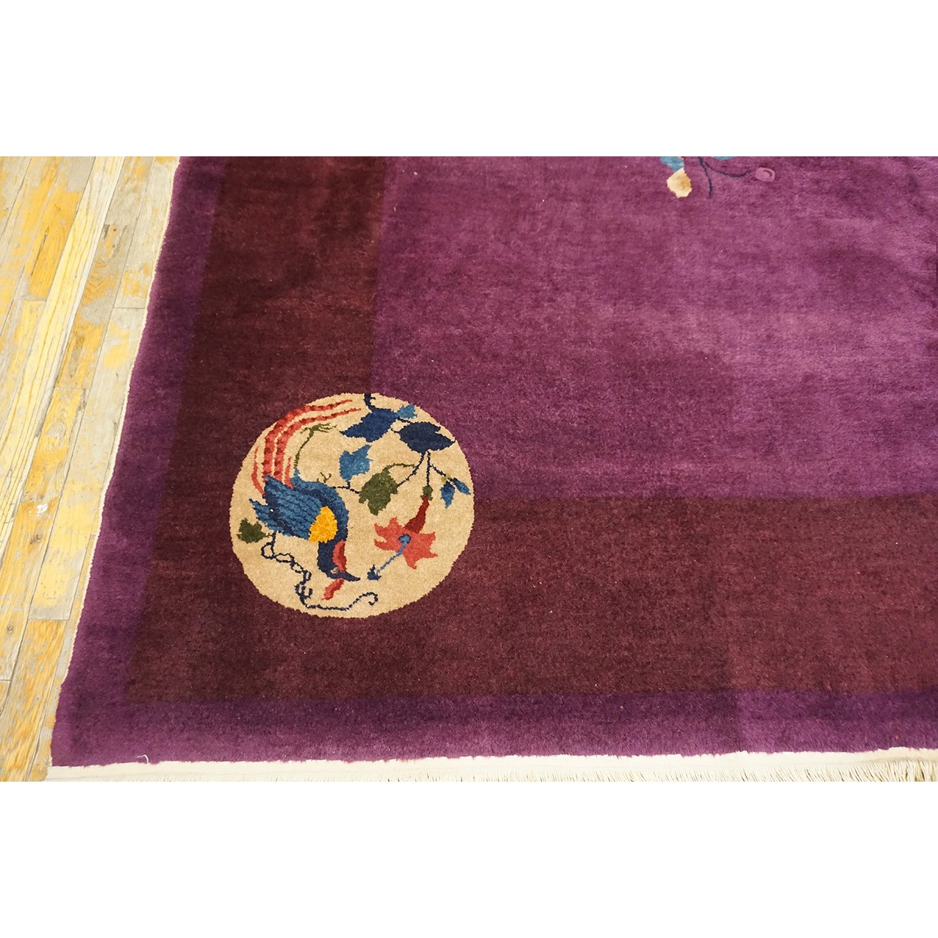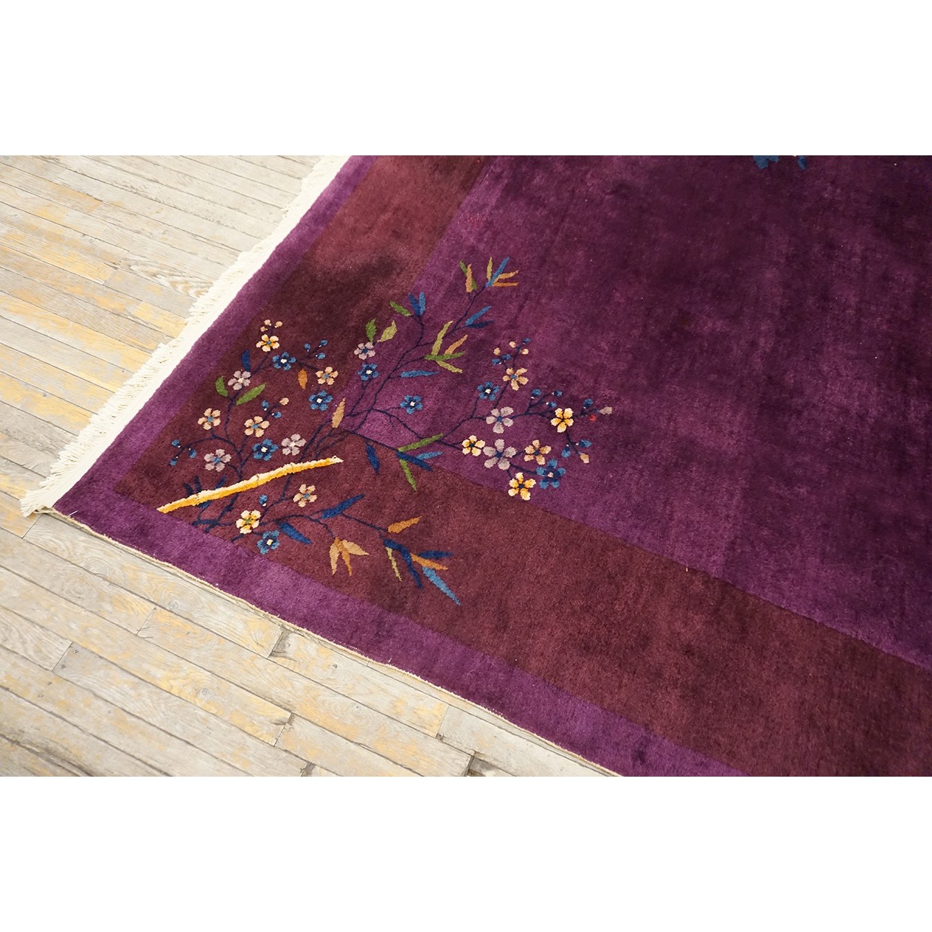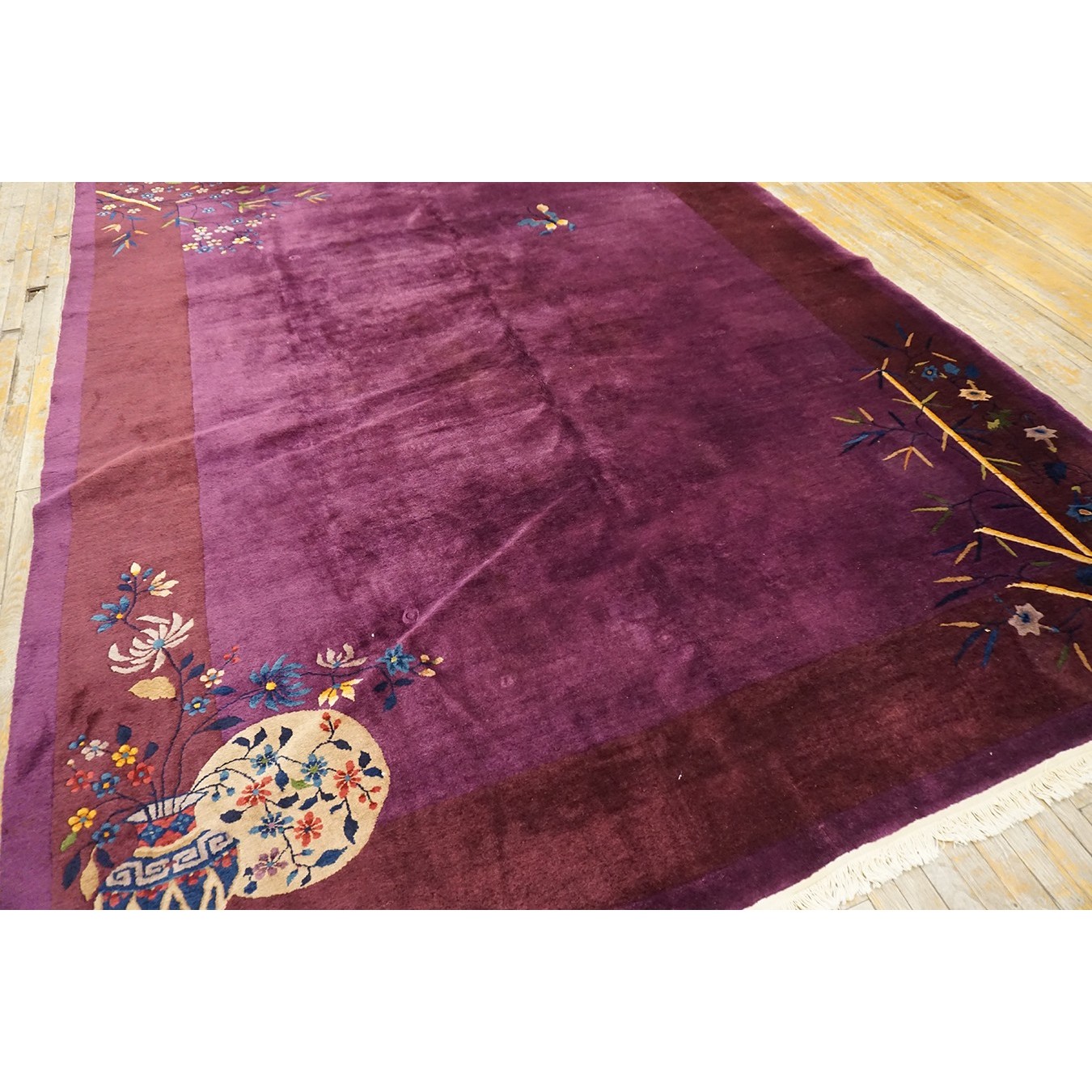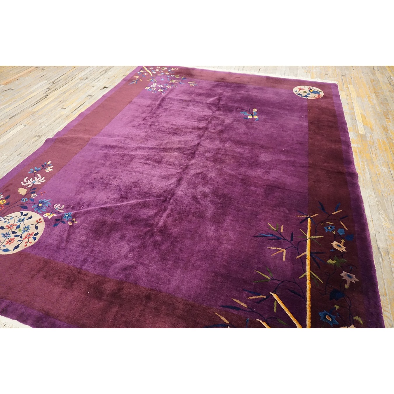 DescriptionChineseCarpets made in China proper. See entries Ningshia, Peking, Art Deco. Chinese - Art DecoAs the name implies, pieces woven between the wars for the Western market by mostly American owned firms especially Nichols and Fette, in thick heavy weaves using strong colors, asymmetric patterns and downplaying the Chinese-ness of the carpet. Nichols rugs are more strong toned than the pastel Fette. Most were woven in the coastal port city of Tientsin. Other lesser known workshops were also active. Some pieces are ultra-geometric and haute-Deco moderne in character: these are very rare. More frequent are pieces with bits of Chinese ornament: vases or other precious objects, paeonies, vines, fences, etc. Most common is the 9 x 12 size, in colors never found in mainstream Chinese rugs: backgrounds in black, mauve, purple, hot pink, orange, olive, employing the best synthetic chrome dyes of the period. Prices are still reasonable and carpets in top condition are available. | |