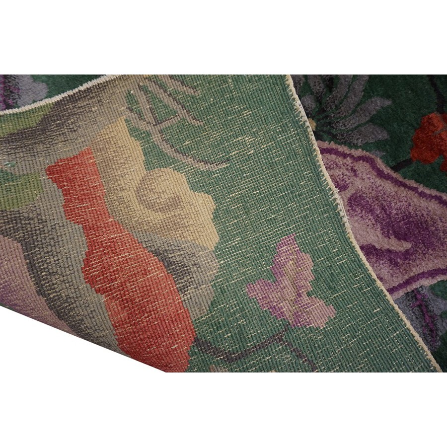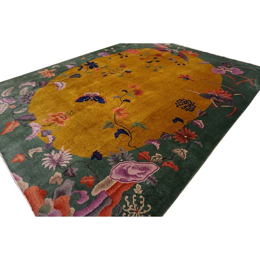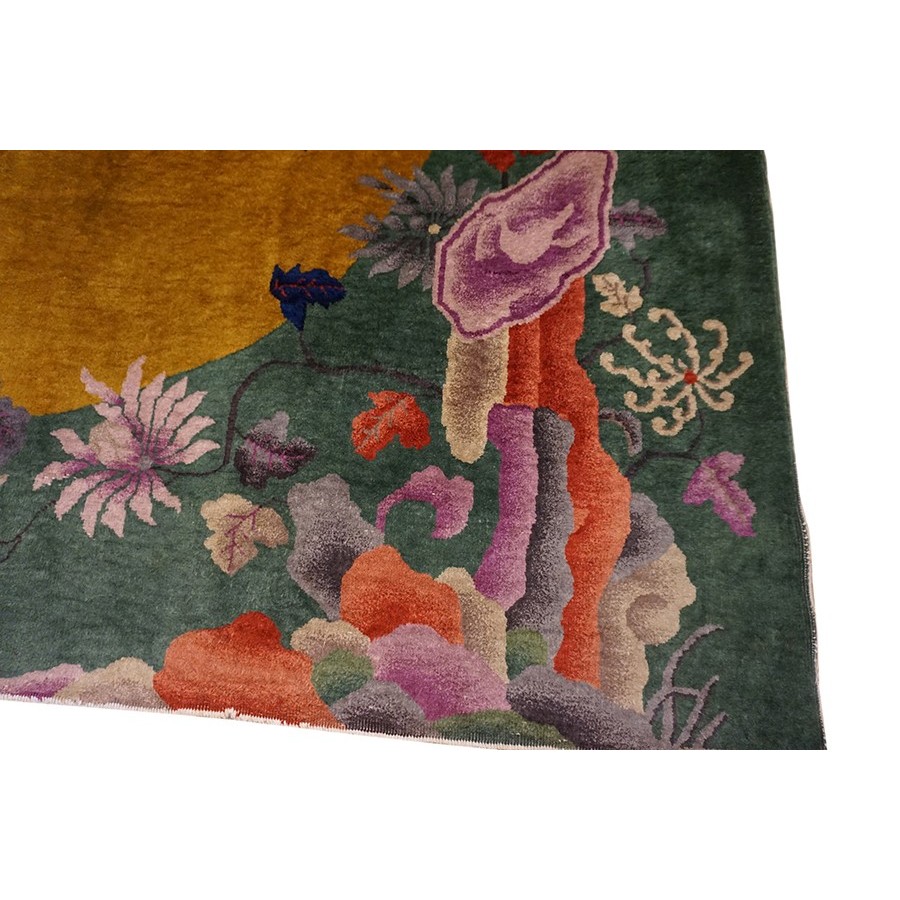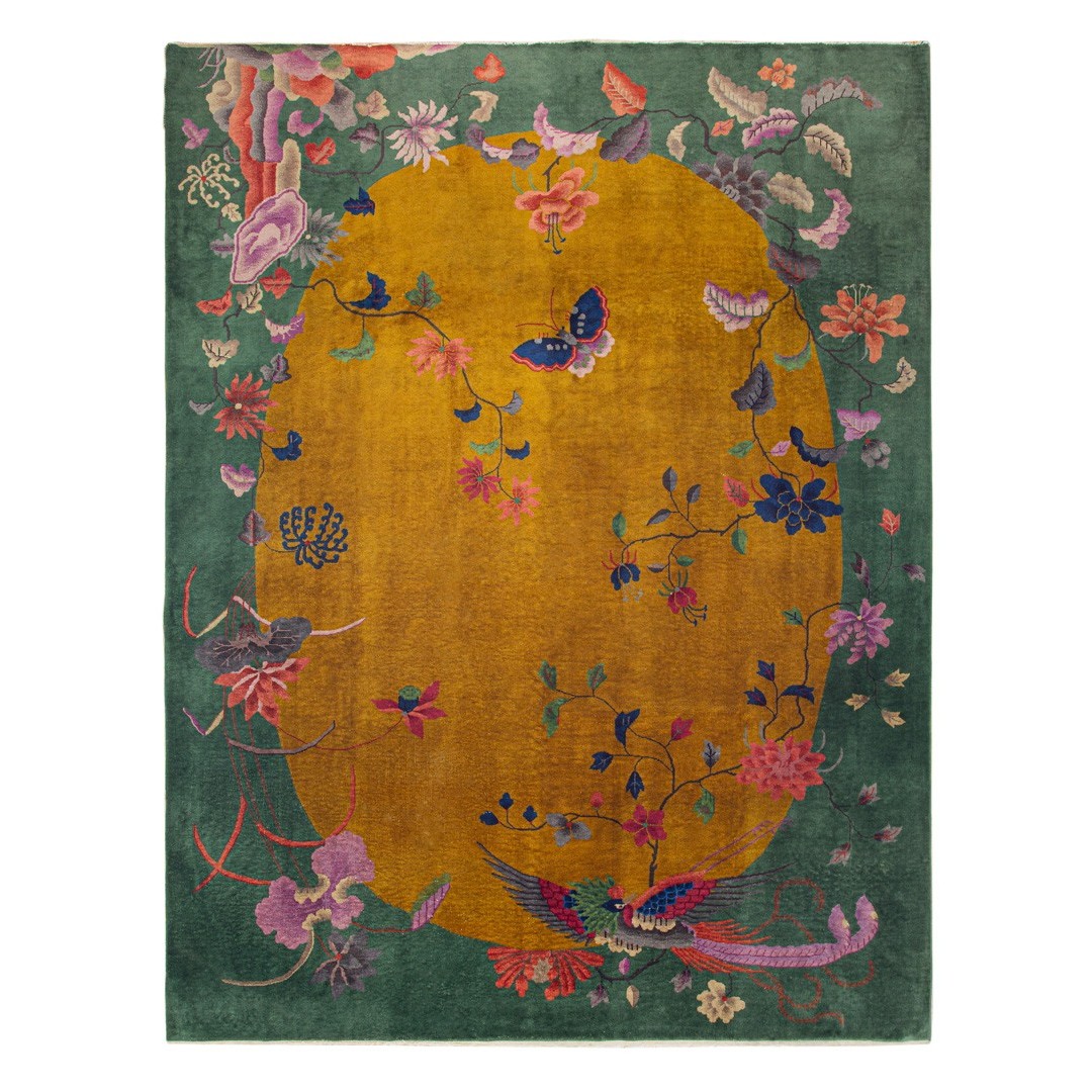 DescriptionChineseCarpets made in China proper. See entries Ningshia, Peking, Art Deco. Chinese - Art DecoAs the name implies, pieces woven between the wars for the Western market by mostly American owned firms especially Nichols and Fette, in thick heavy weaves using strong colors, asymmetric patterns and downplaying the Chinese-ness of the carpet. Nichols rugs are more strong toned than the pastel Fette. Most were woven in the coastal port city of Tientsin. Other lesser known workshops were also active. Some pieces are ultra-geometric and haute-Deco moderne in character: these are very rare. More frequent are pieces with bits of Chinese ornament: vases or other precious objects, paeonies, vines, fences, etc. Most common is the 9 x 12 size, in colors never found in mainstream Chinese rugs: backgrounds in black, mauve, purple, hot pink, orange, olive, employing the best synthetic chrome dyes of the period. Prices are still reasonable and carpets in top condition are available. | |