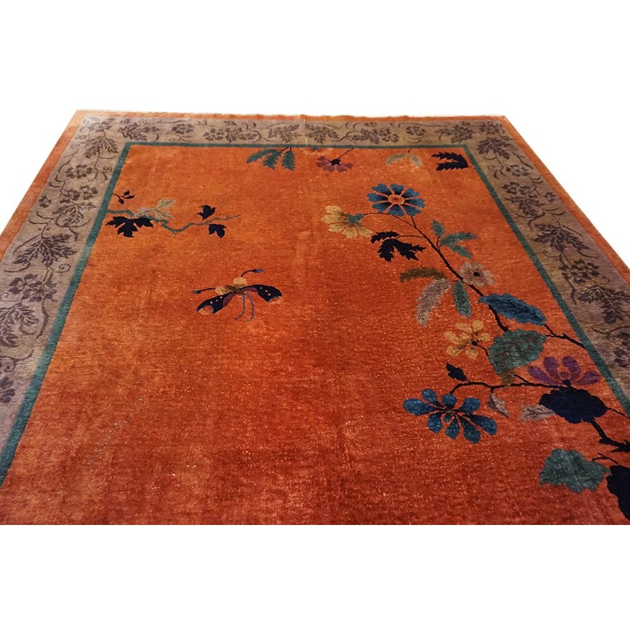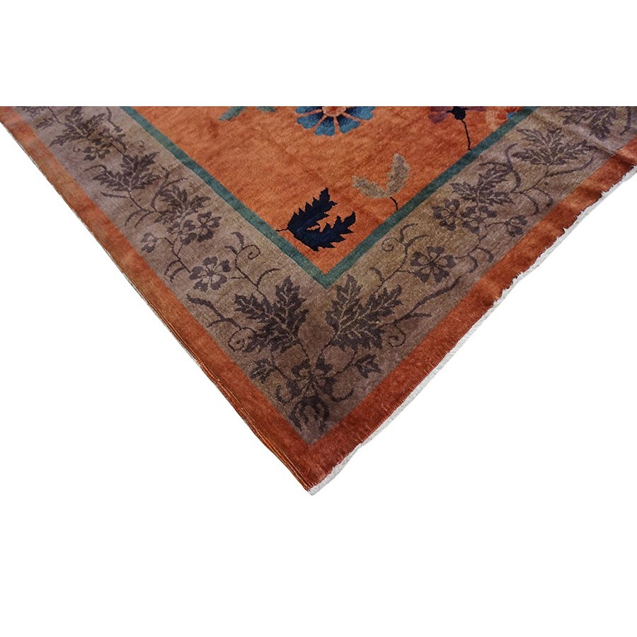 DescriptionChineseCarpets made in China proper. See entries Ningshia, Peking, Art Deco. Chinese - Art DecoAs the name implies, pieces woven between the wars for the Western market by mostly American owned firms especially Nichols and Fette, in thick heavy weaves using strong colors, asymmetric patterns and downplaying the Chinese-ness of the carpet. Nichols rugs are more strong toned than the pastel Fette. Most were woven in the coastal port city of Tientsin. Other lesser known workshops were also active. Some pieces are ultra-geometric and haute-Deco moderne in character: these are very rare. More frequent are pieces with bits of Chinese ornament: vases or other precious objects, paeonies, vines, fences, etc. Most common is the 9 x 12 size, in colors never found in mainstream Chinese rugs: backgrounds in black, mauve, purple, hot pink, orange, olive, employing the best synthetic chrome dyes of the period. Prices are still reasonable and carpets in top condition are available. | |