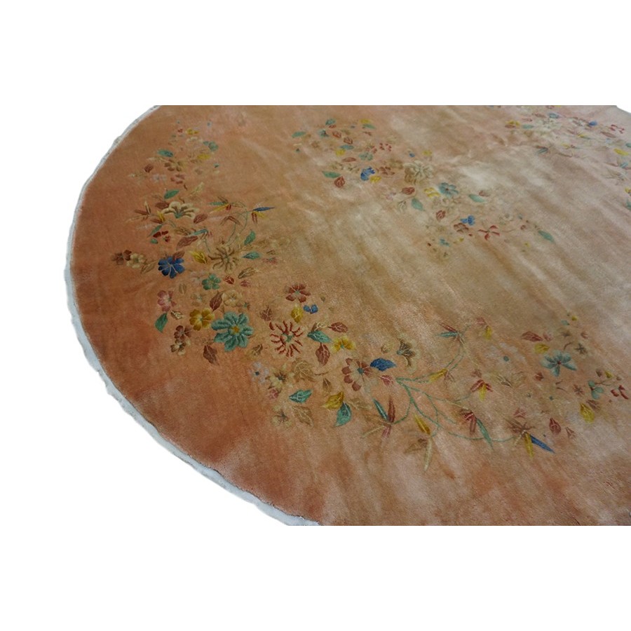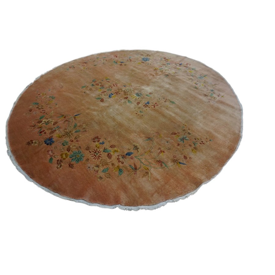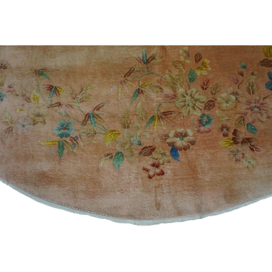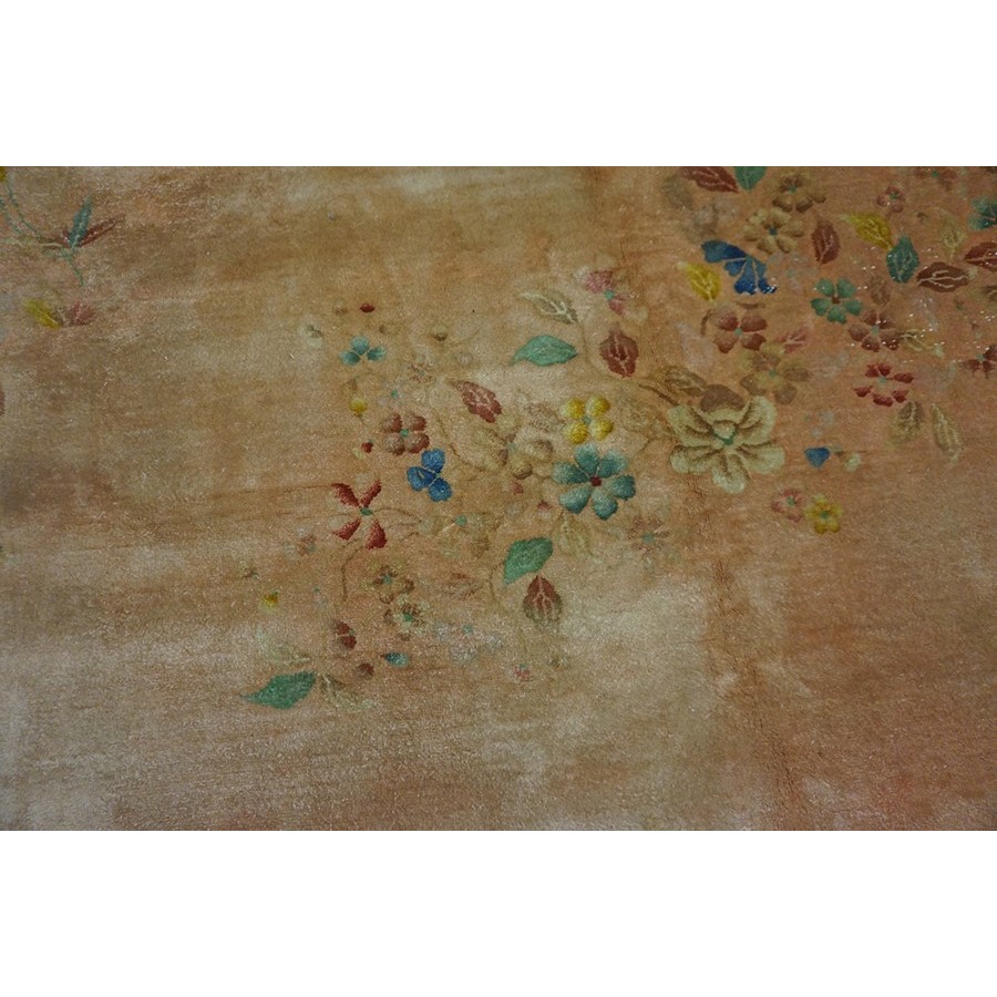DescriptionChineseCarpets made in China proper. See entries Ningshia, Peking, Art Deco. Chinese - Art DecoAs the name implies, pieces woven between the wars for the Western market by mostly American owned firms especially Nichols and Fette, in thick heavy weaves using strong colors, asymmetric patterns and downplaying the Chinese-ness of the carpet. Nichols rugs are more strong toned than the pastel Fette. Most were woven in the coastal port city of Tientsin. Other lesser known workshops were also active. Some pieces are ultra-geometric and haute-Deco moderne in character: these are very rare. More frequent are pieces with bits of Chinese ornament: vases or other precious objects, paeonies, vines, fences, etc. Most common is the 9 x 12 size, in colors never found in mainstream Chinese rugs: backgrounds in black, mauve, purple, hot pink, orange, olive, employing the best synthetic chrome dyes of the period. Prices are still reasonable and carpets in top condition are available. | |