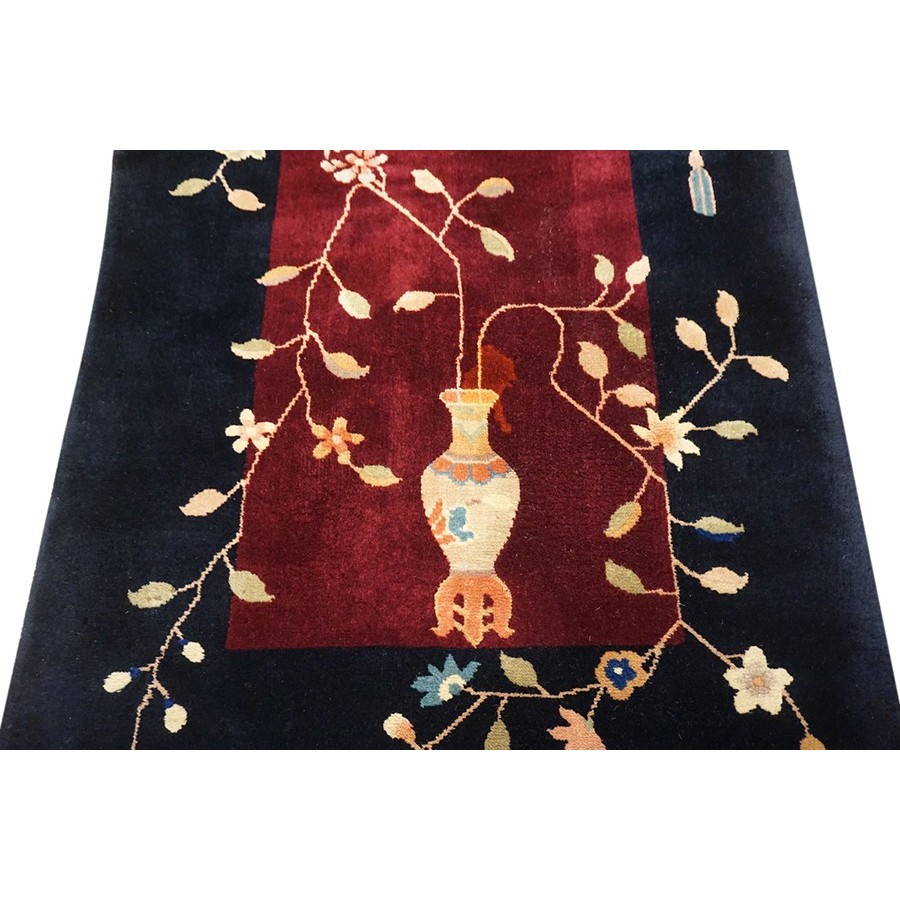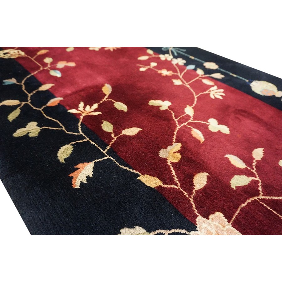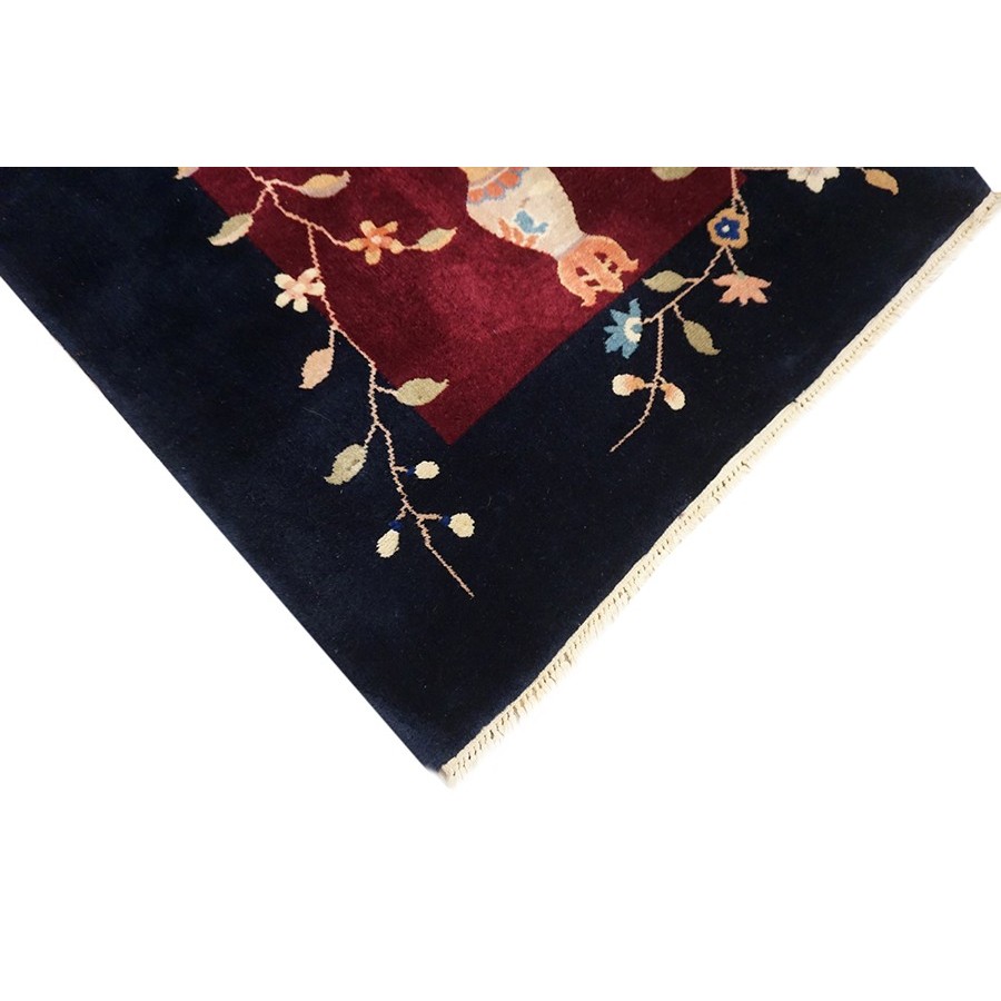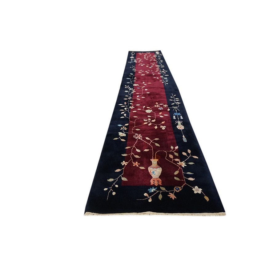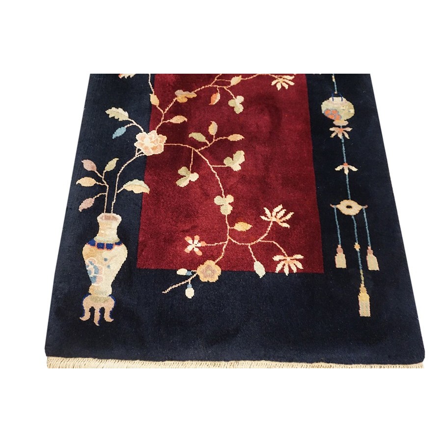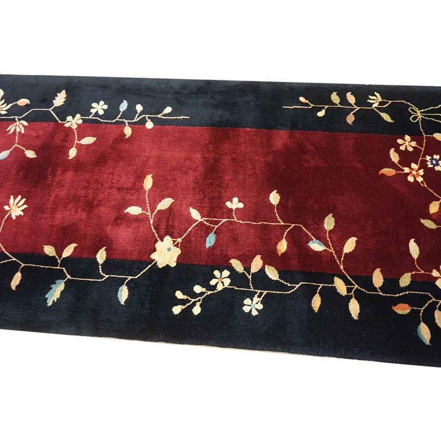 DescriptionChineseCarpets made in China proper. See entries Ningshia, Peking, Art Deco. Chinese - Art DecoAs the name implies, pieces woven between the wars for the Western market by mostly American owned firms especially Nichols and Fette, in thick heavy weaves using strong colors, asymmetric patterns and downplaying the Chinese-ness of the carpet. Nichols rugs are more strong toned than the pastel Fette. Most were woven in the coastal port city of Tientsin. Other lesser known workshops were also active. Some pieces are ultra-geometric and haute-Deco moderne in character: these are very rare. More frequent are pieces with bits of Chinese ornament: vases or other precious objects, paeonies, vines, fences, etc. Most common is the 9 x 12 size, in colors never found in mainstream Chinese rugs: backgrounds in black, mauve, purple, hot pink, orange, olive, employing the best synthetic chrome dyes of the period. Prices are still reasonable and carpets in top condition are available. | |