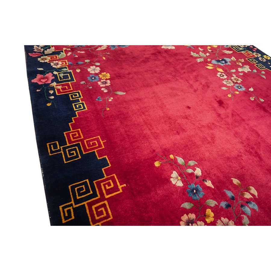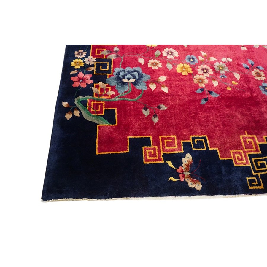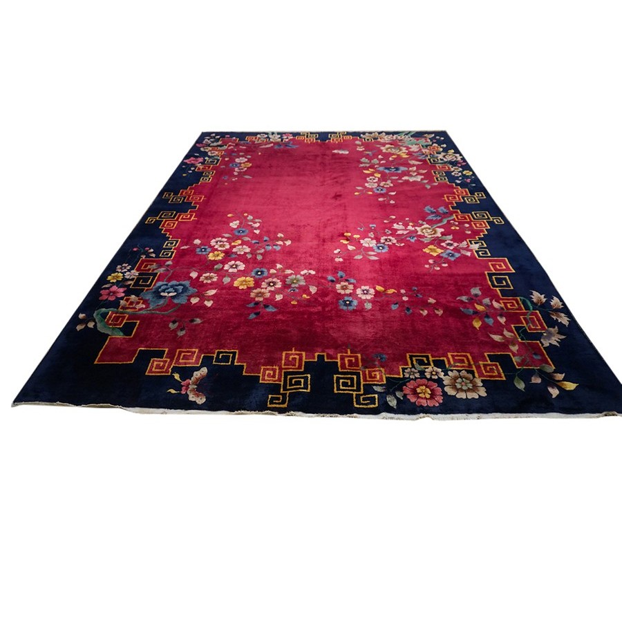 DescriptionChineseCarpets made in China proper. See entries Ningshia, Peking, Art Deco. Chinese - Art DecoAs the name implies, pieces woven between the wars for the Western market by mostly American owned firms especially Nichols and Fette, in thick heavy weaves using strong colors, asymmetric patterns and downplaying the Chinese-ness of the carpet. Nichols rugs are more strong toned than the pastel Fette. Most were woven in the coastal port city of Tientsin. Other lesser known workshops were also active. Some pieces are ultra-geometric and haute-Deco moderne in character: these are very rare. More frequent are pieces with bits of Chinese ornament: vases or other precious objects, paeonies, vines, fences, etc. Most common is the 9 x 12 size, in colors never found in mainstream Chinese rugs: backgrounds in black, mauve, purple, hot pink, orange, olive, employing the best synthetic chrome dyes of the period. Prices are still reasonable and carpets in top condition are available. | |
