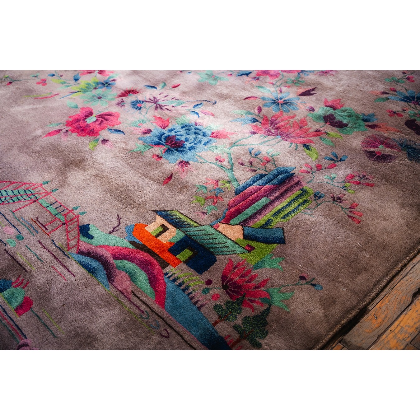 DescriptionChineseCarpets made in China proper. See entries Ningshia, Peking, Art Deco. Chinese - Art DecoAs the name implies, pieces woven between the wars for the Western market by mostly American owned firms especially Nichols and Fette, in thick heavy weaves using strong colors, asymmetric patterns and downplaying the Chinese-ness of the carpet. Nichols rugs are more strong toned than the pastel Fette. Most were woven in the coastal port city of Tientsin. Other lesser known workshops were also active. Some pieces are ultra-geometric and haute-Deco moderne in character: these are very rare. More frequent are pieces with bits of Chinese ornament: vases or other precious objects, paeonies, vines, fences, etc. Most common is the 9 x 12 size, in colors never found in mainstream Chinese rugs: backgrounds in black, mauve, purple, hot pink, orange, olive, employing the best synthetic chrome dyes of the period. Prices are still reasonable and carpets in top condition are available. | |