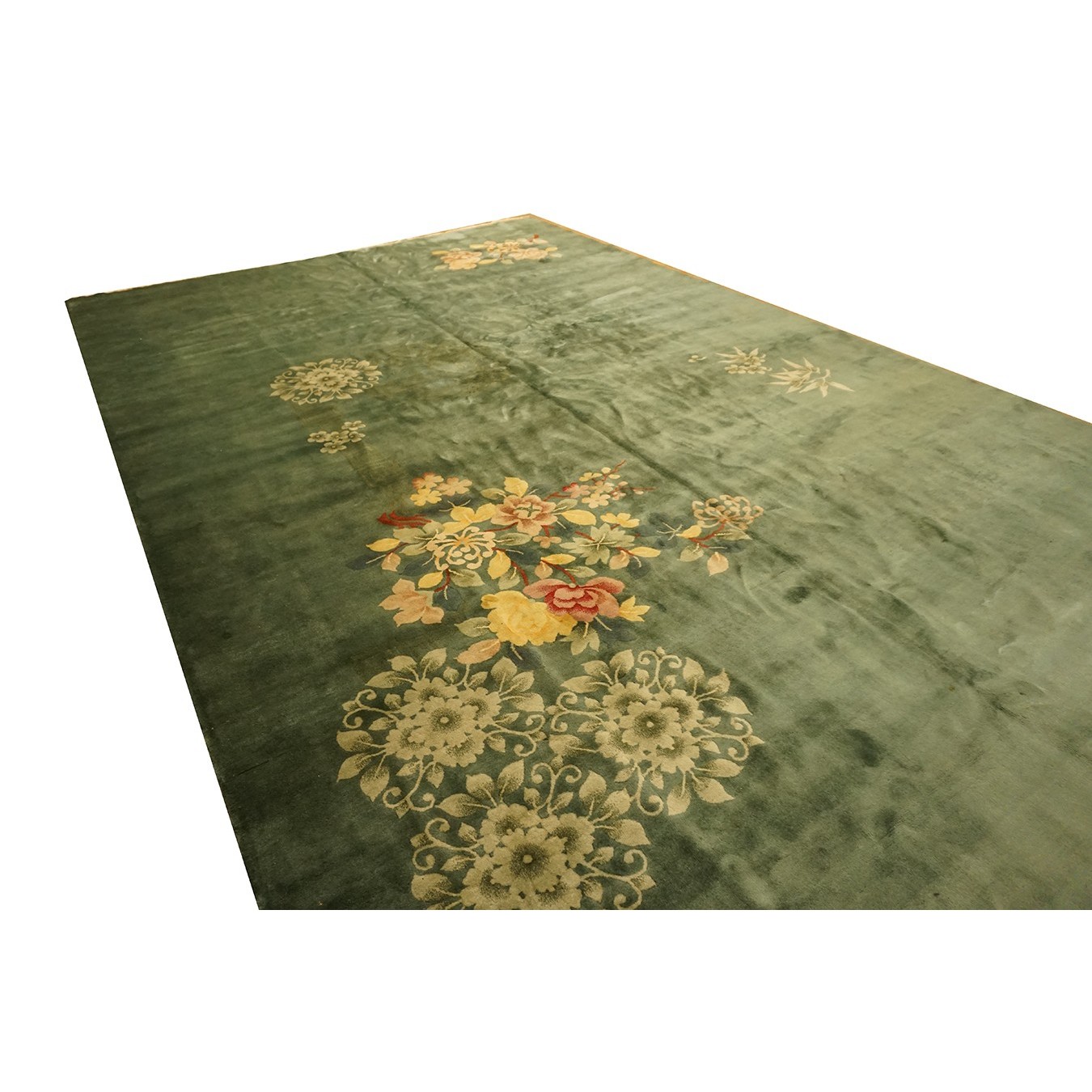 DescriptionChineseCarpets made in China proper. See entries Ningshia, Peking, Art Deco. Chinese - Art DecoAs the name implies, pieces woven between the wars for the Western market by mostly American owned firms especially Nichols and Fette, in thick heavy weaves using strong colors, asymmetric patterns and downplaying the Chinese-ness of the carpet. Nichols rugs are more strong toned than the pastel Fette. Most were woven in the coastal port city of Tientsin. Other lesser known workshops were also active. Some pieces are ultra-geometric and haute-Deco moderne in character: these are very rare. More frequent are pieces with bits of Chinese ornament: vases or other precious objects, paeonies, vines, fences, etc. Most common is the 9 x 12 size, in colors never found in mainstream Chinese rugs: backgrounds in black, mauve, purple, hot pink, orange, olive, employing the best synthetic chrome dyes of the period. Prices are still reasonable and carpets in top condition are available. | |