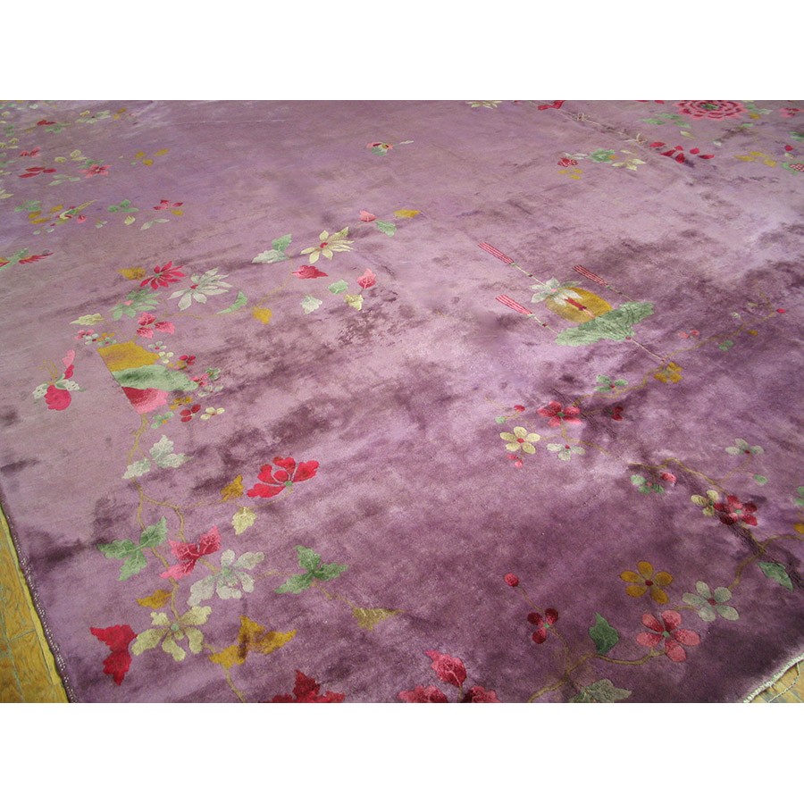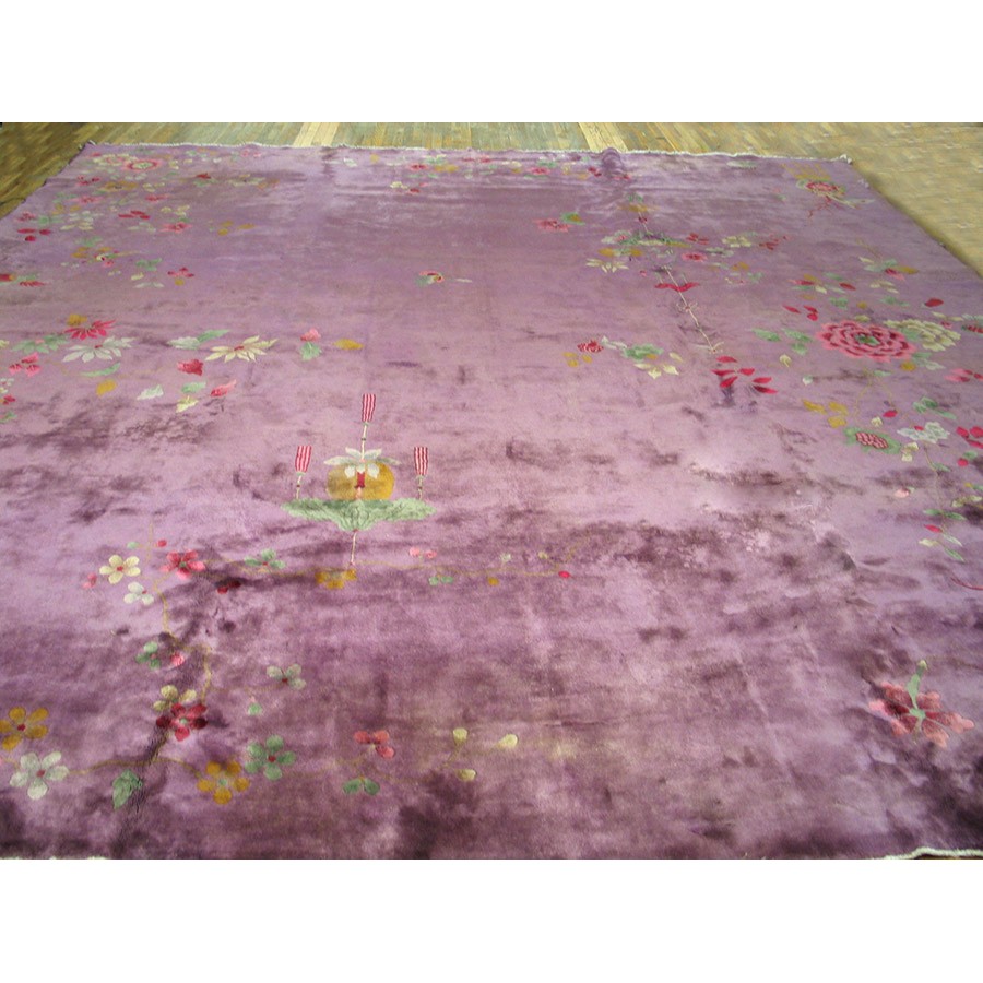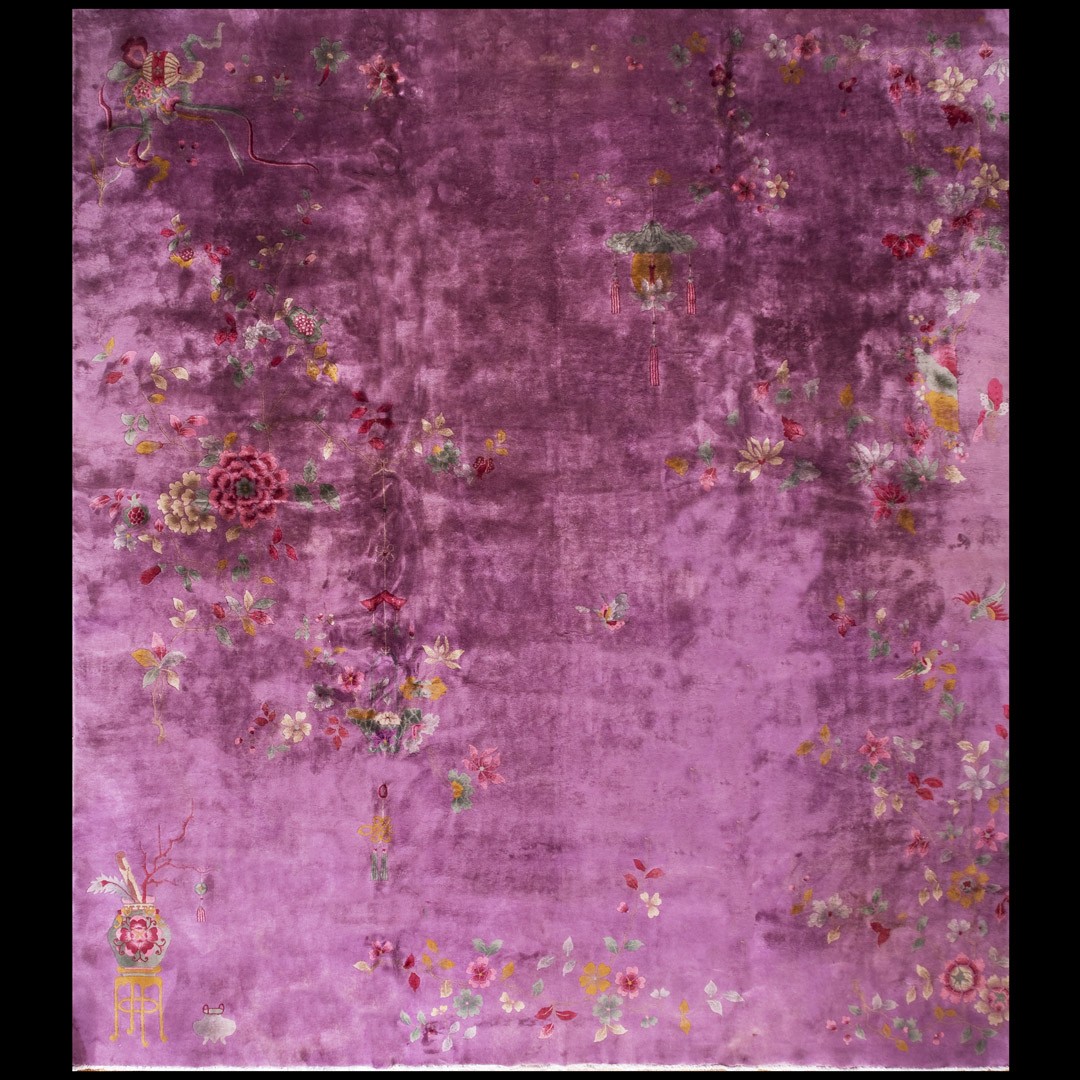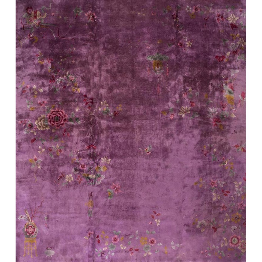 DescriptionChineseCarpets made in China proper. See entries Ningshia, Peking, Art Deco. Chinese - Art DecoAs the name implies, pieces woven between the wars for the Western market by mostly American owned firms especially Nichols and Fette, in thick heavy weaves using strong colors, asymmetric patterns and downplaying the Chinese-ness of the carpet. Nichols rugs are more strong toned than the pastel Fette. Most were woven in the coastal port city of Tientsin. Other lesser known workshops were also active. Some pieces are ultra-geometric and haute-Deco moderne in character: these are very rare. More frequent are pieces with bits of Chinese ornament: vases or other precious objects, paeonies, vines, fences, etc. Most common is the 9 x 12 size, in colors never found in mainstream Chinese rugs: backgrounds in black, mauve, purple, hot pink, orange, olive, employing the best synthetic chrome dyes of the period. Prices are still reasonable and carpets in top condition are available. | |