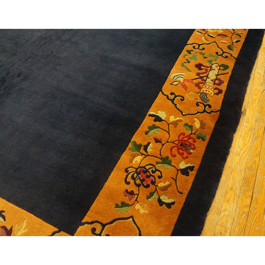 DescriptionChineseCarpets made in China proper. See entries Ningshia, Peking, Art Deco. Chinese - Art DecoAs the name implies, pieces woven between the wars for the Western market by mostly American owned firms especially Nichols and Fette, in thick heavy weaves using strong colors, asymmetric patterns and downplaying the Chinese-ness of the carpet. Nichols rugs are more strong toned than the pastel Fette. Most were woven in the coastal port city of Tientsin. Other lesser known workshops were also active. Some pieces are ultra-geometric and haute-Deco moderne in character: these are very rare. More frequent are pieces with bits of Chinese ornament: vases or other precious objects, paeonies, vines, fences, etc. Most common is the 9 x 12 size, in colors never found in mainstream Chinese rugs: backgrounds in black, mauve, purple, hot pink, orange, olive, employing the best synthetic chrome dyes of the period. Prices are still reasonable and carpets in top condition are available. | |