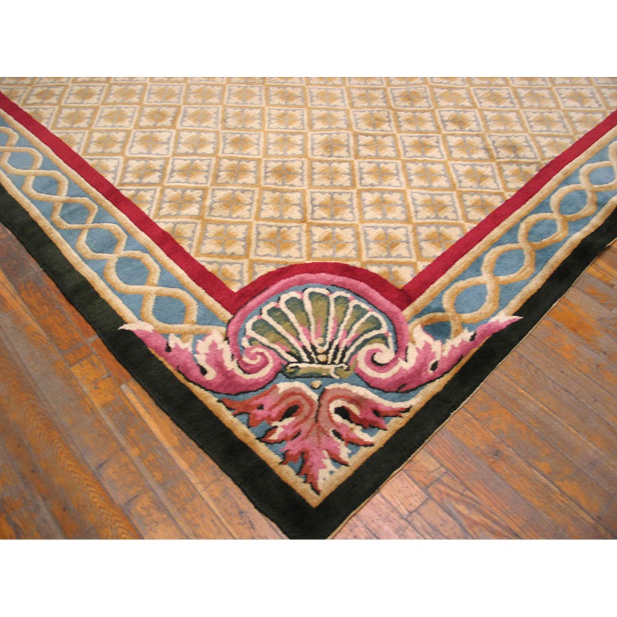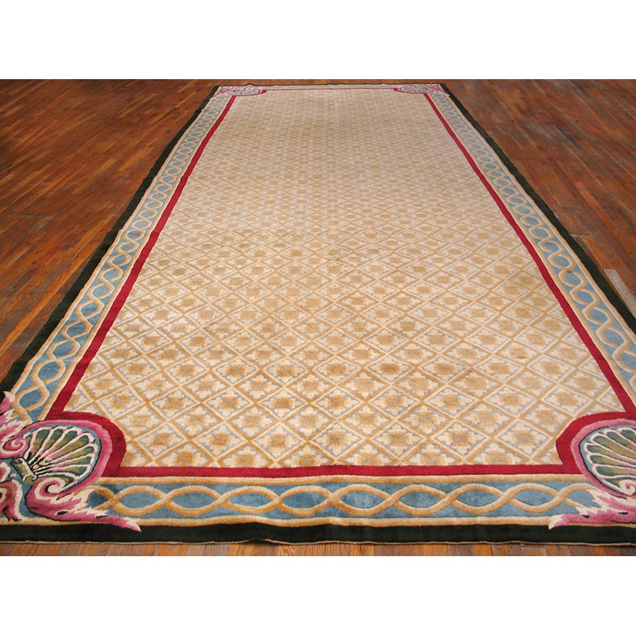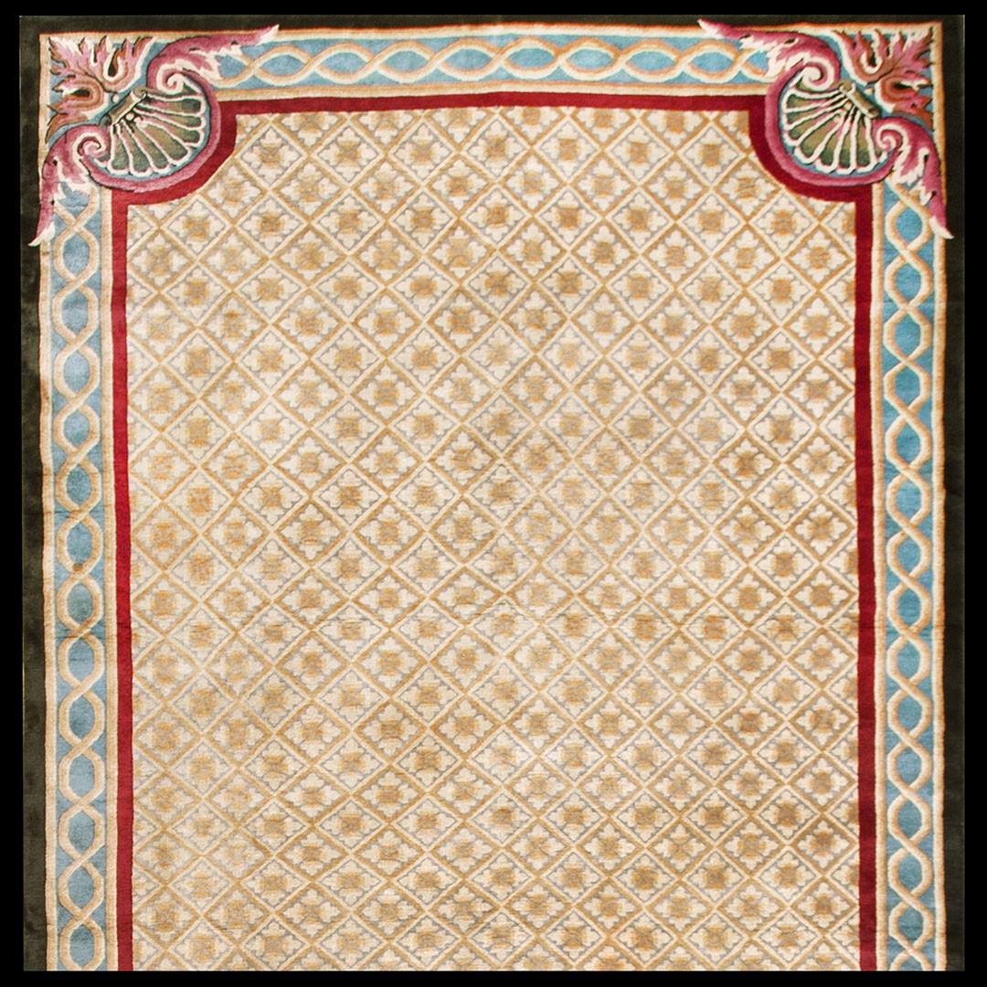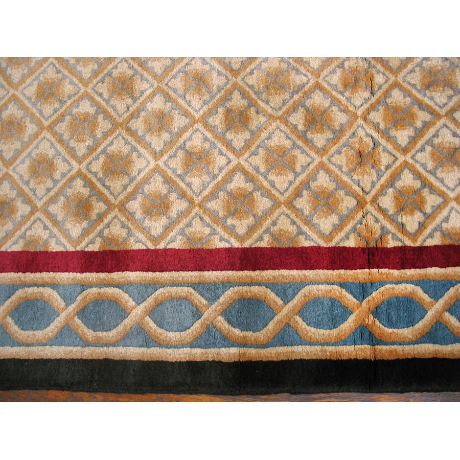 DescriptionChineseCarpets made in China proper. See entries Ningshia, Peking, Art Deco. Chinese - Art DecoAs the name implies, pieces woven between the wars for the Western market by mostly American owned firms especially Nichols and Fette, in thick heavy weaves using strong colors, asymmetric patterns and downplaying the Chinese-ness of the carpet. Nichols rugs are more strong toned than the pastel Fette. Most were woven in the coastal port city of Tientsin. Other lesser known workshops were also active. Some pieces are ultra-geometric and haute-Deco moderne in character: these are very rare. More frequent are pieces with bits of Chinese ornament: vases or other precious objects, paeonies, vines, fences, etc. Most common is the 9 x 12 size, in colors never found in mainstream Chinese rugs: backgrounds in black, mauve, purple, hot pink, orange, olive, employing the best synthetic chrome dyes of the period. Prices are still reasonable and carpets in top condition are available. | |