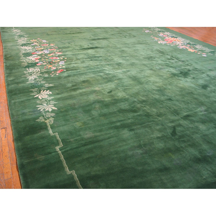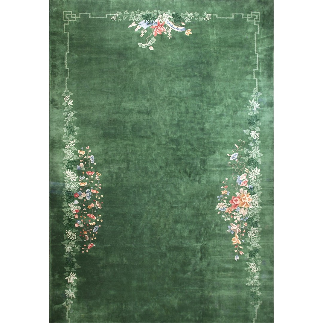 As the name implies, pieces woven between the wars for the Western market by mostly American owned firms especially Nichols and Fette, in thick heavy weaves using strong colors, asymmetric patterns and downplaying the Chinese-ness of the carpet. Nichols rugs are more strong toned than the pastel Fette. Most were woven in the coastal port city of Tientsin. Other lesser known workshops were also active. Some pieces are ultra-geometric and haute-Deco moderne in character: these are very rare. More frequent are pieces with bits of Chinese ornament: vases or other precious objects, paeonies, vines, fences, etc. Most common is the 9’ x 12’ size, in colors never found in mainstream Chinese rugs: backgrounds in black, mauve, purple, hot pink, orange, olive, employing the best synthetic chrome dyes of the period. Prices are still reasonable and carpets in top condition are available.