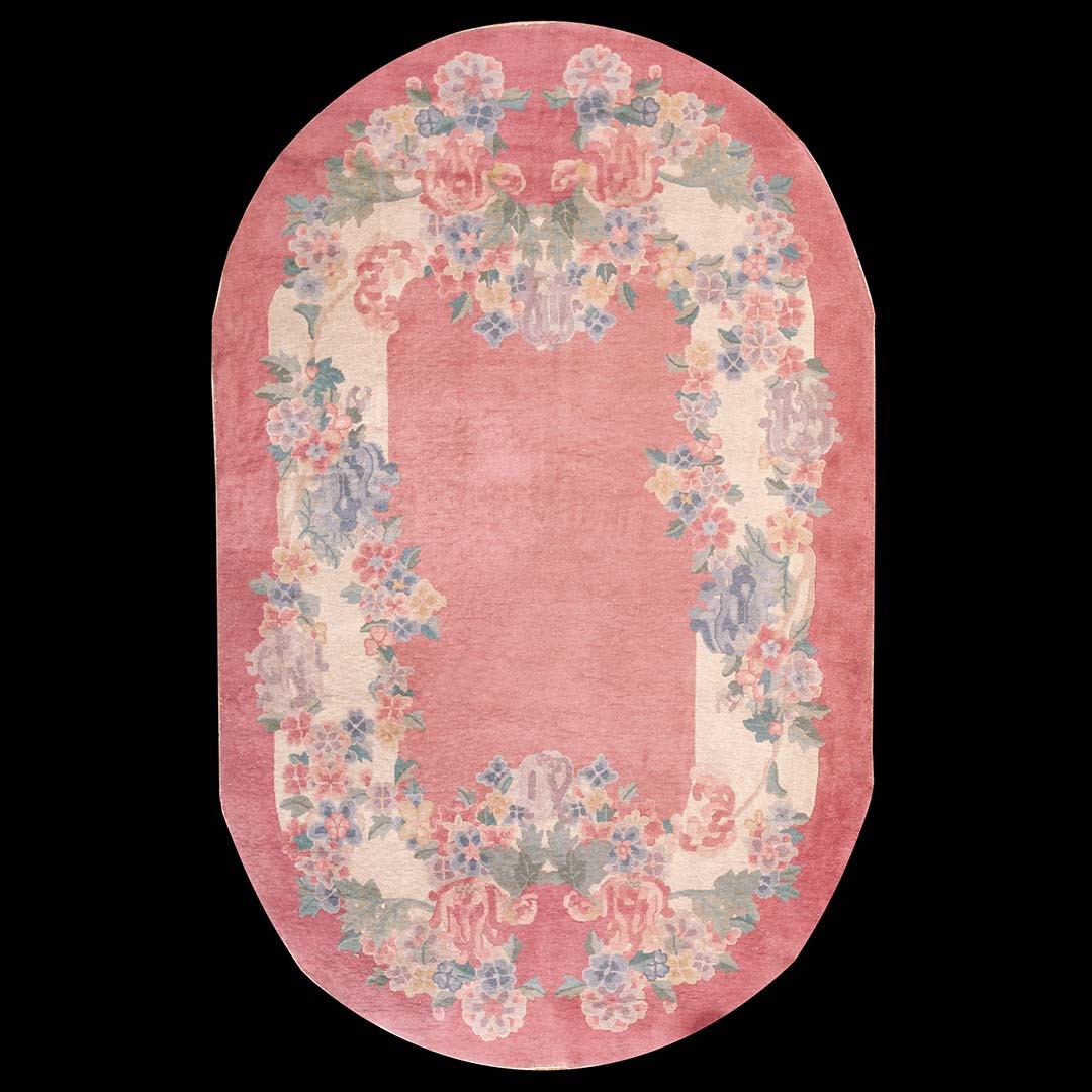 DescriptionChineseCarpets made in China proper. See entries Ningshia, Peking, Art Deco. Chinese - Art DecoAs the name implies, pieces woven between the wars for the Western market by mostly American owned firms especially Nichols and Fette, in thick heavy weaves using strong colors, asymmetric patterns and downplaying the Chinese-ness of the carpet. Nichols rugs are more strong toned than the pastel Fette. Most were woven in the coastal port city of Tientsin. Other lesser known workshops were also active. Some pieces are ultra-geometric and haute-Deco moderne in character: these are very rare. More frequent are pieces with bits of Chinese ornament: vases or other precious objects, paeonies, vines, fences, etc. Most common is the 9 x 12 size, in colors never found in mainstream Chinese rugs: backgrounds in black, mauve, purple, hot pink, orange, olive, employing the best synthetic chrome dyes of the period. Prices are still reasonable and carpets in top condition are available. | |