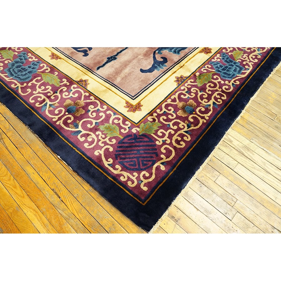 As the name implies, pieces woven between the wars for the Western market by mostly American owned firms especially Nichols and Fette, in thick heavy weaves using strong colors, asymmetric patterns and downplaying the Chinese-ness of the carpet. Nichols rugs are more strong toned than the pastel Fette. Most were woven in the coastal port city of Tientsin. Other lesser known workshops were also active. Some pieces are ultra-geometric and haute-Deco moderne in character: these are very rare. More frequent are pieces with bits of Chinese ornament: vases or other precious objects, paeonies, vines, fences, etc. Most common is the 9’ x 12’ size, in colors never found in mainstream Chinese rugs: backgrounds in black, mauve, purple, hot pink, orange, olive, employing the best synthetic chrome dyes of the period. Prices are still reasonable and carpets in top condition are available.