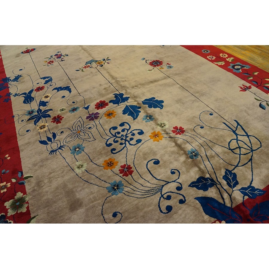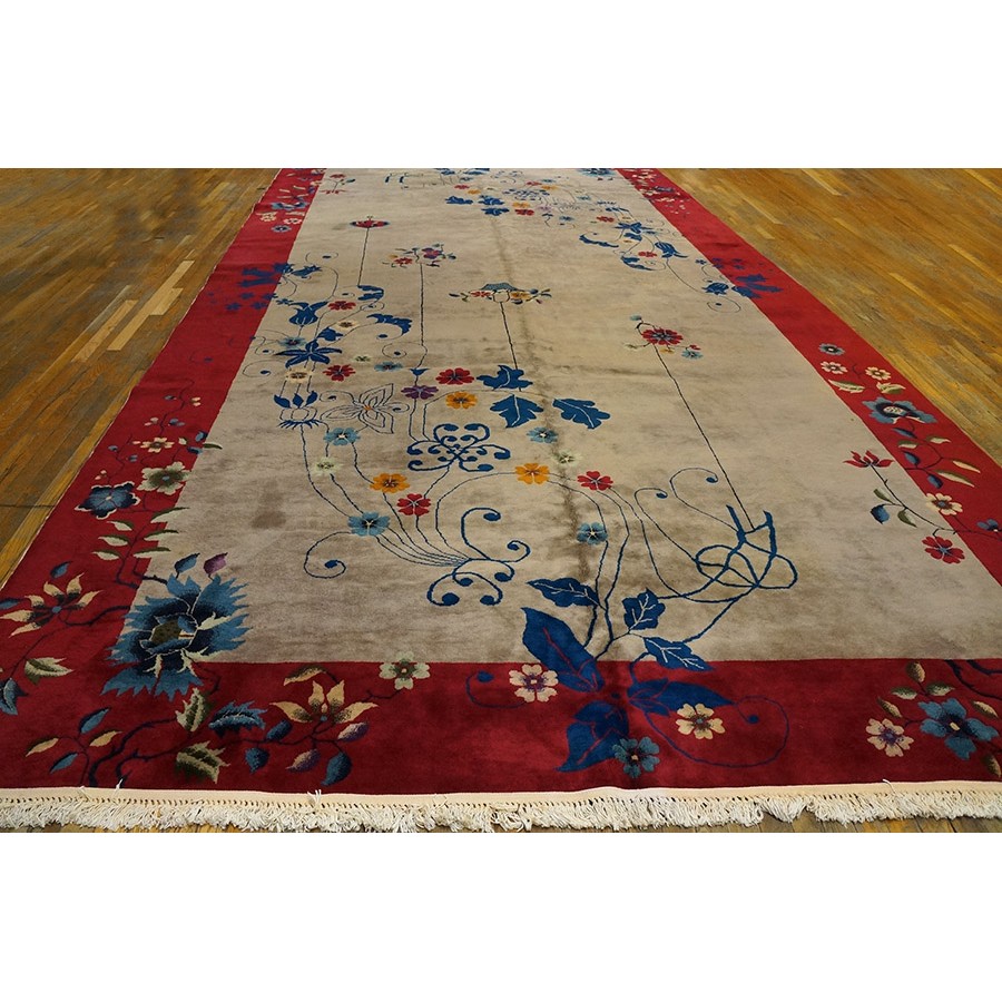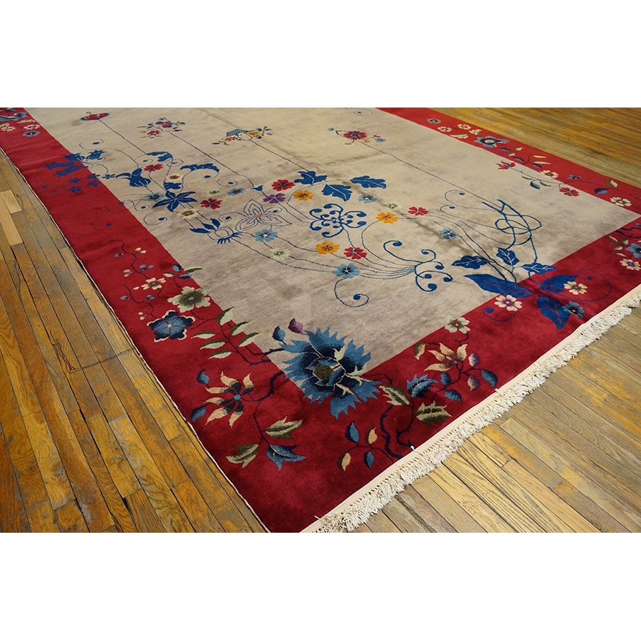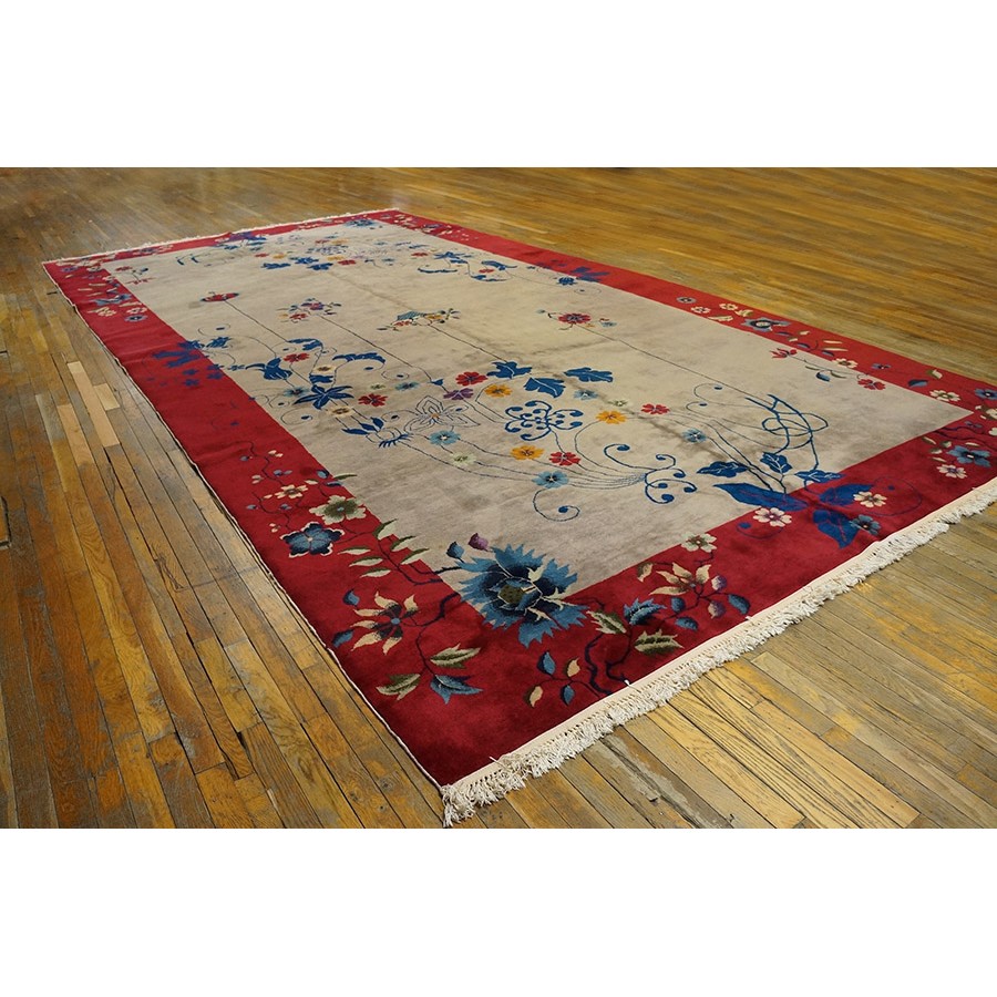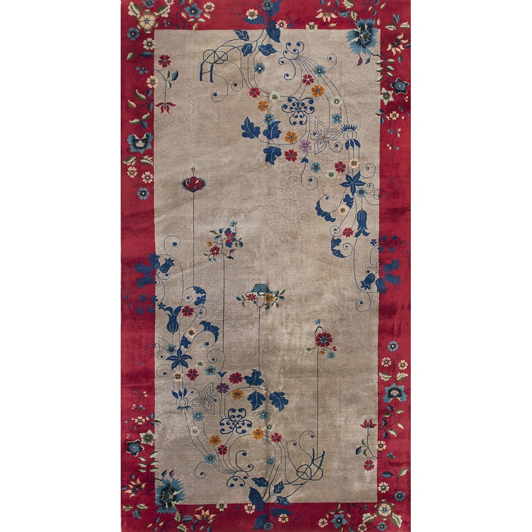 DescriptionChineseCarpets made in China proper. See entries Ningshia, Peking, Art Deco. Chinese - Art DecoAs the name implies, pieces woven between the wars for the Western market by mostly American owned firms especially Nichols and Fette, in thick heavy weaves using strong colors, asymmetric patterns and downplaying the Chinese-ness of the carpet. Nichols rugs are more strong toned than the pastel Fette. Most were woven in the coastal port city of Tientsin. Other lesser known workshops were also active. Some pieces are ultra-geometric and haute-Deco moderne in character: these are very rare. More frequent are pieces with bits of Chinese ornament: vases or other precious objects, paeonies, vines, fences, etc. Most common is the 9 x 12 size, in colors never found in mainstream Chinese rugs: backgrounds in black, mauve, purple, hot pink, orange, olive, employing the best synthetic chrome dyes of the period. Prices are still reasonable and carpets in top condition are available. | |