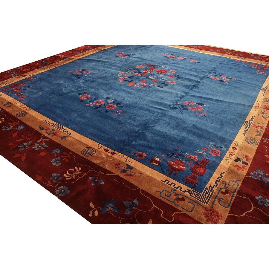 DescriptionChineseCarpets made in China proper. See entries Ningshia, Peking, Art Deco. Chinese - Art DecoAs the name implies, pieces woven between the wars for the Western market by mostly American owned firms especially Nichols and Fette, in thick heavy weaves using strong colors, asymmetric patterns and downplaying the Chinese-ness of the carpet. Nichols rugs are more strong toned than the pastel Fette. Most were woven in the coastal port city of Tientsin. Other lesser known workshops were also active. Some pieces are ultra-geometric and haute-Deco moderne in character: these are very rare. More frequent are pieces with bits of Chinese ornament: vases or other precious objects, paeonies, vines, fences, etc. Most common is the 9 x 12 size, in colors never found in mainstream Chinese rugs: backgrounds in black, mauve, purple, hot pink, orange, olive, employing the best synthetic chrome dyes of the period. Prices are still reasonable and carpets in top condition are available. | |