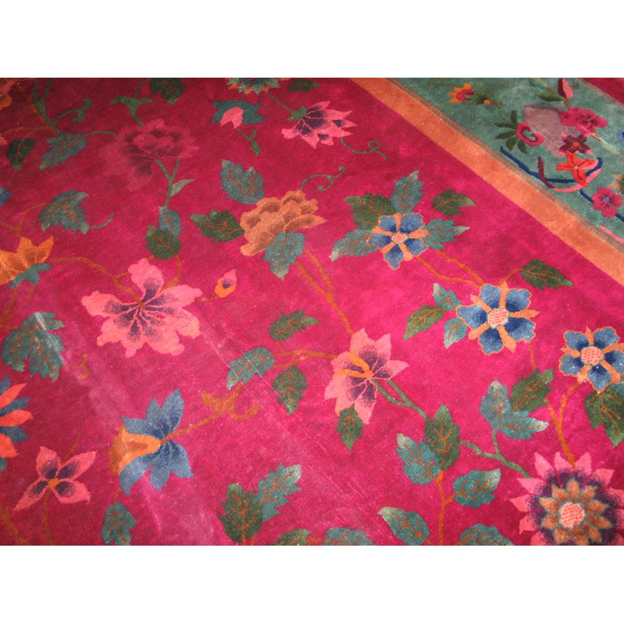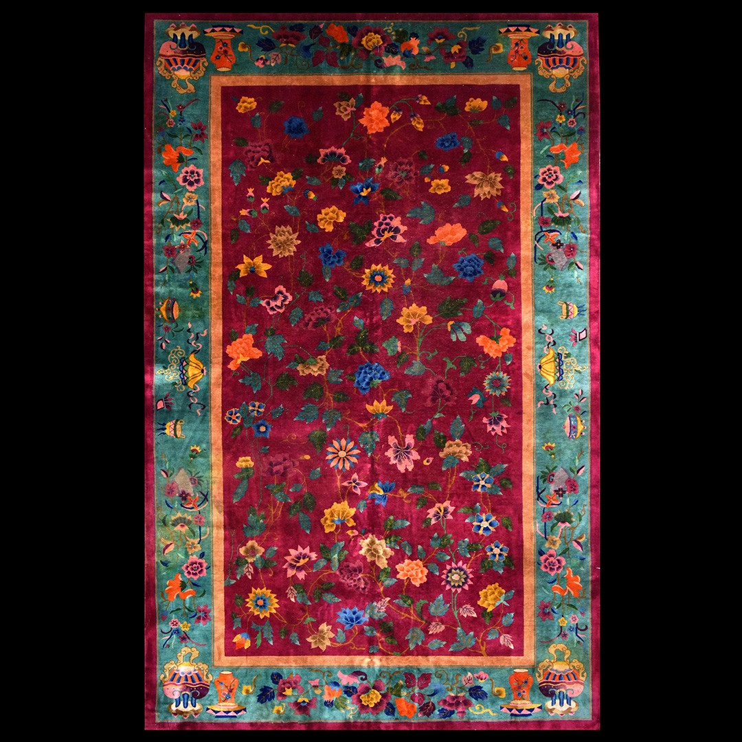 DescriptionChineseCarpets made in China proper. See entries Ningshia, Peking, Art Deco. Chinese - Art DecoAs the name implies, pieces woven between the wars for the Western market by mostly American owned firms especially Nichols and Fette, in thick heavy weaves using strong colors, asymmetric patterns and downplaying the Chinese-ness of the carpet. Nichols rugs are more strong toned than the pastel Fette. Most were woven in the coastal port city of Tientsin. Other lesser known workshops were also active. Some pieces are ultra-geometric and haute-Deco moderne in character: these are very rare. More frequent are pieces with bits of Chinese ornament: vases or other precious objects, paeonies, vines, fences, etc. Most common is the 9 x 12 size, in colors never found in mainstream Chinese rugs: backgrounds in black, mauve, purple, hot pink, orange, olive, employing the best synthetic chrome dyes of the period. Prices are still reasonable and carpets in top condition are available. | |