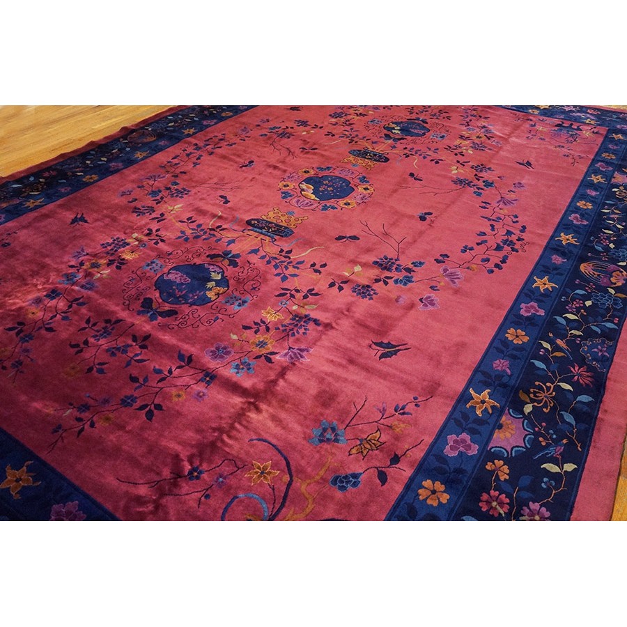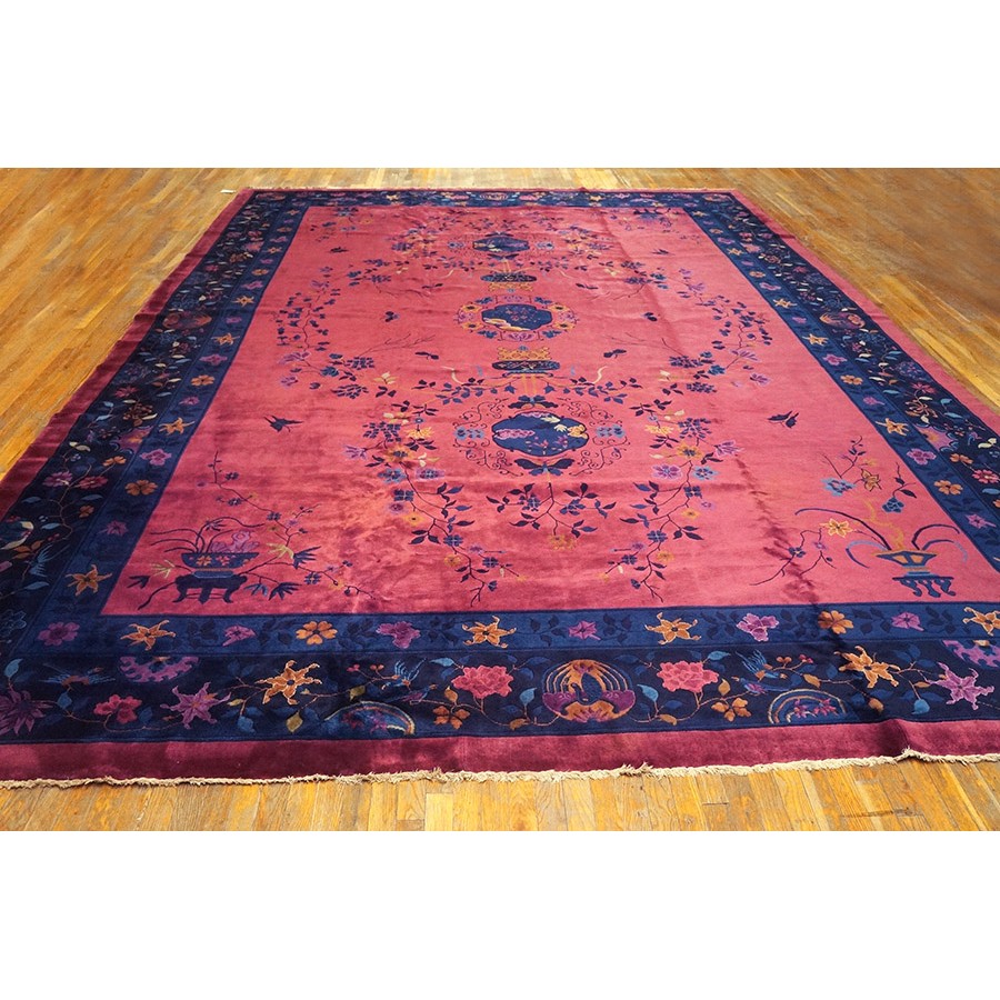 DescriptionChineseCarpets made in China proper. See entries Ningshia, Peking, Art Deco. Chinese - Art DecoAs the name implies, pieces woven between the wars for the Western market by mostly American owned firms especially Nichols and Fette, in thick heavy weaves using strong colors, asymmetric patterns and downplaying the Chinese-ness of the carpet. Nichols rugs are more strong toned than the pastel Fette. Most were woven in the coastal port city of Tientsin. Other lesser known workshops were also active. Some pieces are ultra-geometric and haute-Deco moderne in character: these are very rare. More frequent are pieces with bits of Chinese ornament: vases or other precious objects, paeonies, vines, fences, etc. Most common is the 9 x 12 size, in colors never found in mainstream Chinese rugs: backgrounds in black, mauve, purple, hot pink, orange, olive, employing the best synthetic chrome dyes of the period. Prices are still reasonable and carpets in top condition are available. | |