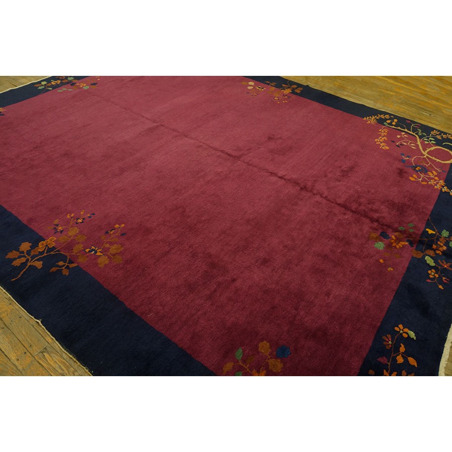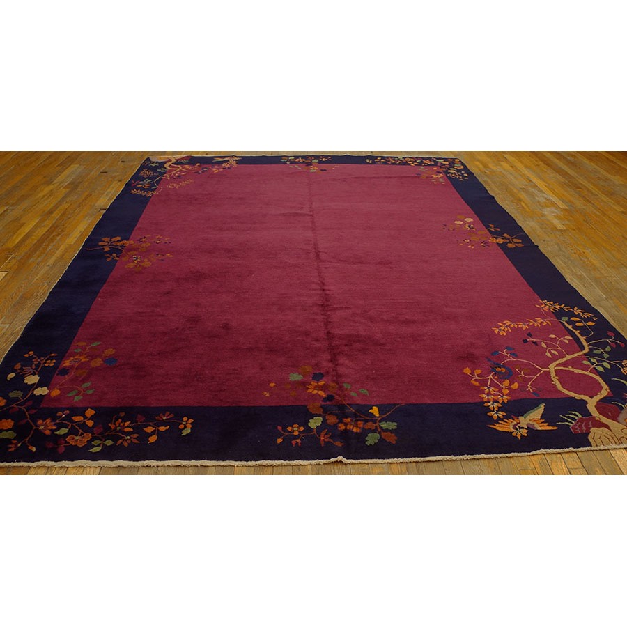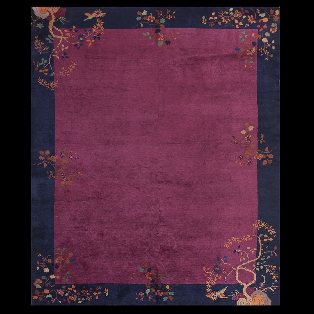 DescriptionChineseCarpets made in China proper. See entries Ningshia, Peking, Art Deco. Chinese - Art DecoAs the name implies, pieces woven between the wars for the Western market by mostly American owned firms especially Nichols and Fette, in thick heavy weaves using strong colors, asymmetric patterns and downplaying the Chinese-ness of the carpet. Nichols rugs are more strong toned than the pastel Fette. Most were woven in the coastal port city of Tientsin. Other lesser known workshops were also active. Some pieces are ultra-geometric and haute-Deco moderne in character: these are very rare. More frequent are pieces with bits of Chinese ornament: vases or other precious objects, paeonies, vines, fences, etc. Most common is the 9 x 12 size, in colors never found in mainstream Chinese rugs: backgrounds in black, mauve, purple, hot pink, orange, olive, employing the best synthetic chrome dyes of the period. Prices are still reasonable and carpets in top condition are available. | |