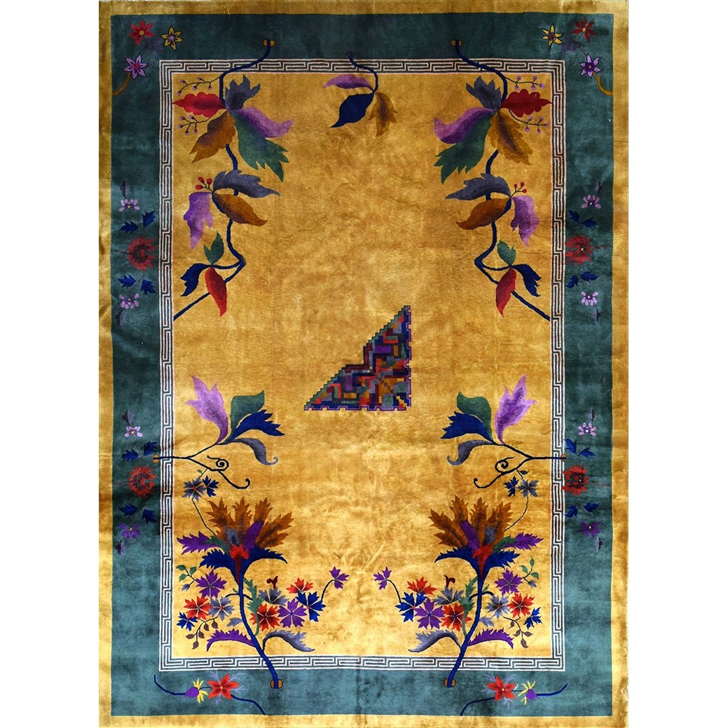 DescriptionChineseCarpets made in China proper. See entries Ningshia, Peking, Art Deco. Chinese - Art DecoAs the name implies, pieces woven between the wars for the Western market by mostly American owned firms especially Nichols and Fette, in thick heavy weaves using strong colors, asymmetric patterns and downplaying the Chinese-ness of the carpet. Nichols rugs are more strong toned than the pastel Fette. Most were woven in the coastal port city of Tientsin. Other lesser known workshops were also active. Some pieces are ultra-geometric and haute-Deco moderne in character: these are very rare. More frequent are pieces with bits of Chinese ornament: vases or other precious objects, paeonies, vines, fences, etc. Most common is the 9 x 12 size, in colors never found in mainstream Chinese rugs: backgrounds in black, mauve, purple, hot pink, orange, olive, employing the best synthetic chrome dyes of the period. Prices are still reasonable and carpets in top condition are available. | |