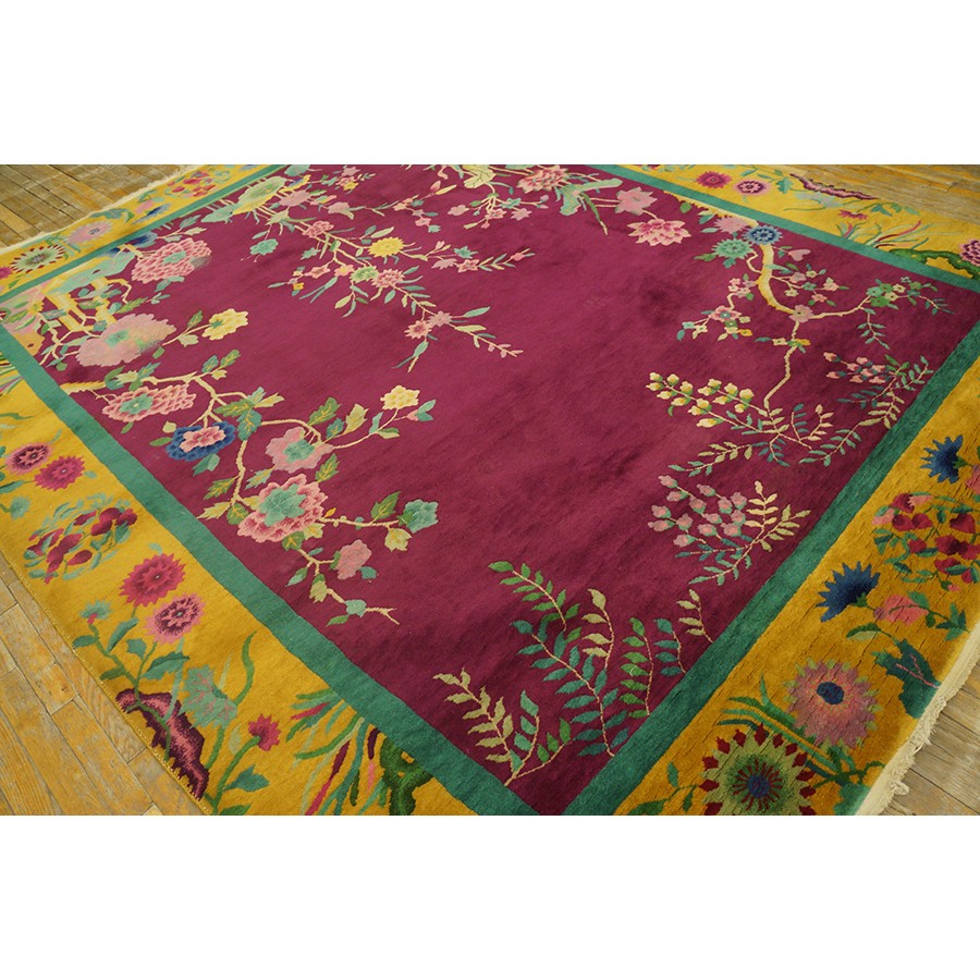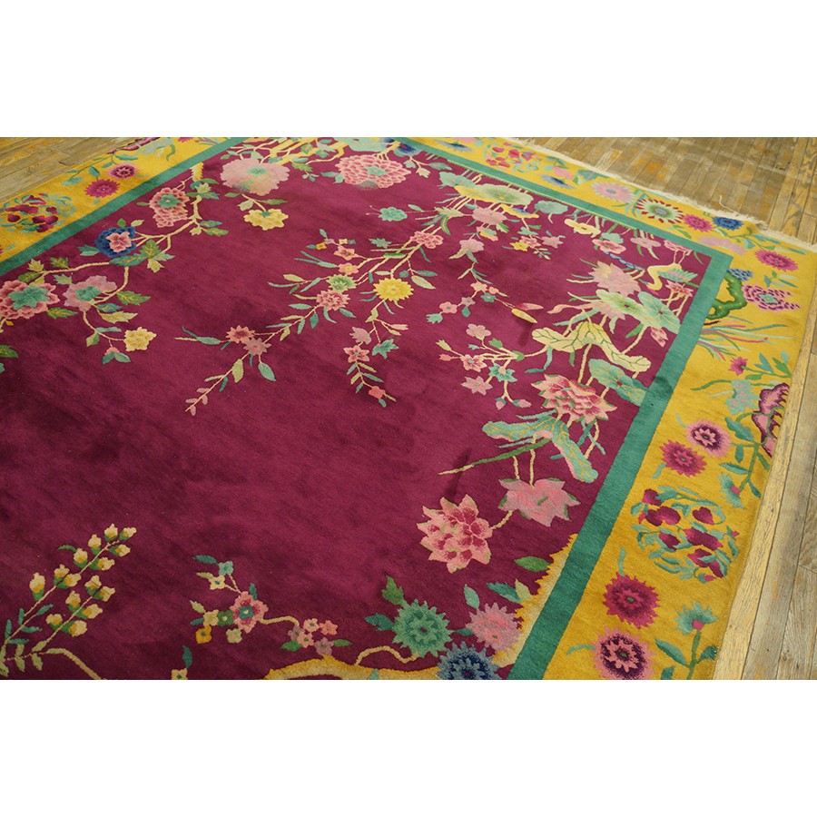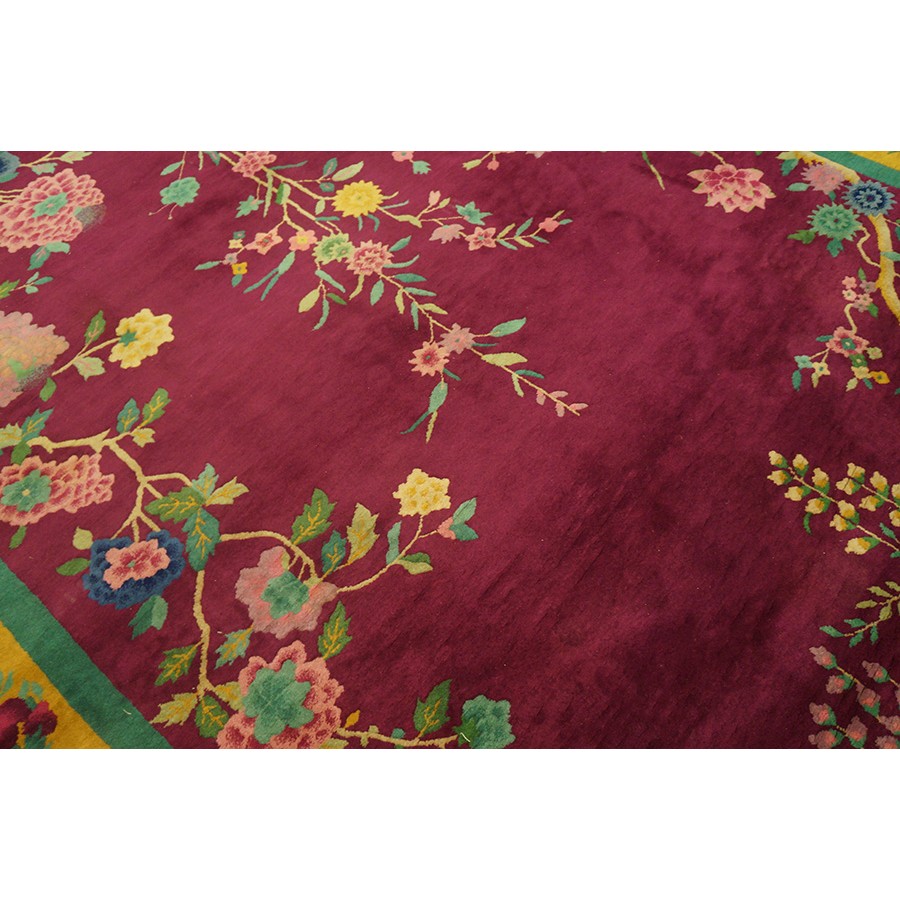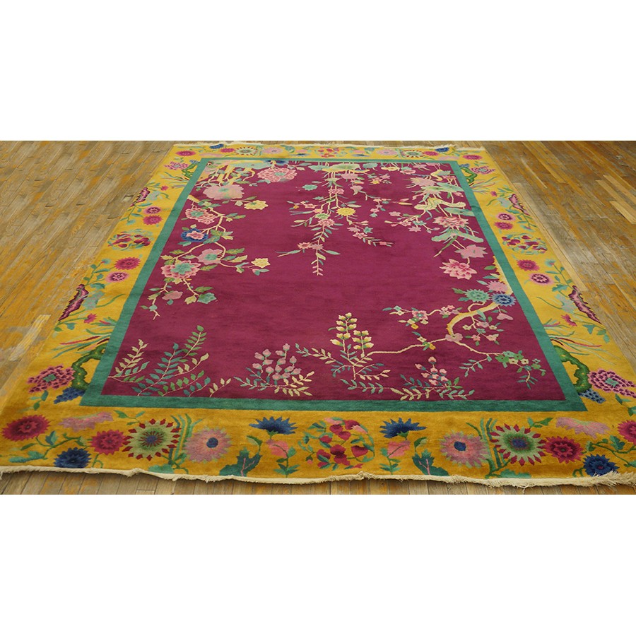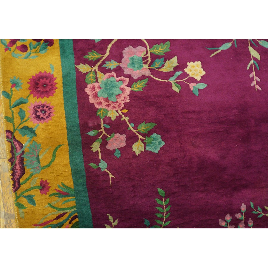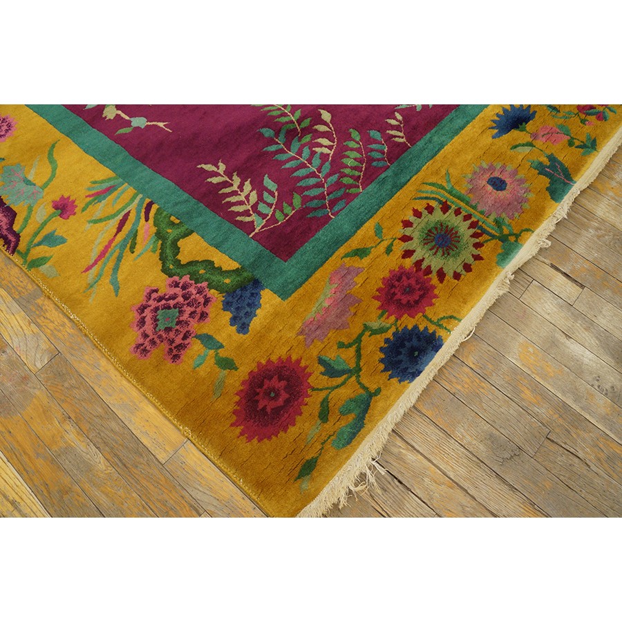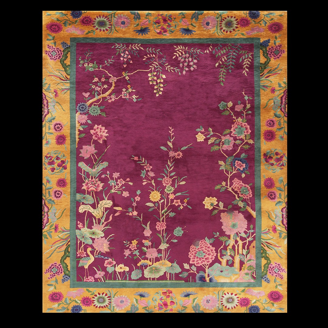 DescriptionChineseCarpets made in China proper. See entries Ningshia, Peking, Art Deco. Chinese - Art DecoAs the name implies, pieces woven between the wars for the Western market by mostly American owned firms especially Nichols and Fette, in thick heavy weaves using strong colors, asymmetric patterns and downplaying the Chinese-ness of the carpet. Nichols rugs are more strong toned than the pastel Fette. Most were woven in the coastal port city of Tientsin. Other lesser known workshops were also active. Some pieces are ultra-geometric and haute-Deco moderne in character: these are very rare. More frequent are pieces with bits of Chinese ornament: vases or other precious objects, paeonies, vines, fences, etc. Most common is the 9 x 12 size, in colors never found in mainstream Chinese rugs: backgrounds in black, mauve, purple, hot pink, orange, olive, employing the best synthetic chrome dyes of the period. Prices are still reasonable and carpets in top condition are available. | |