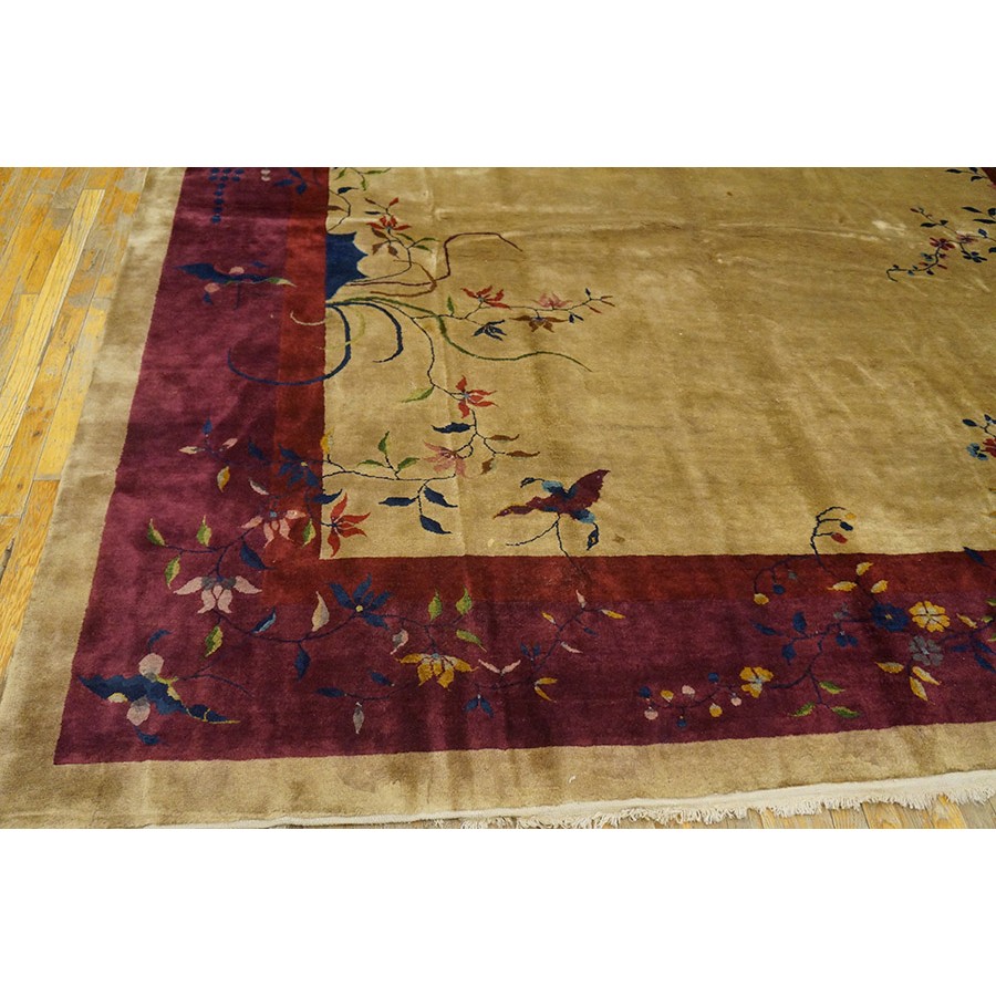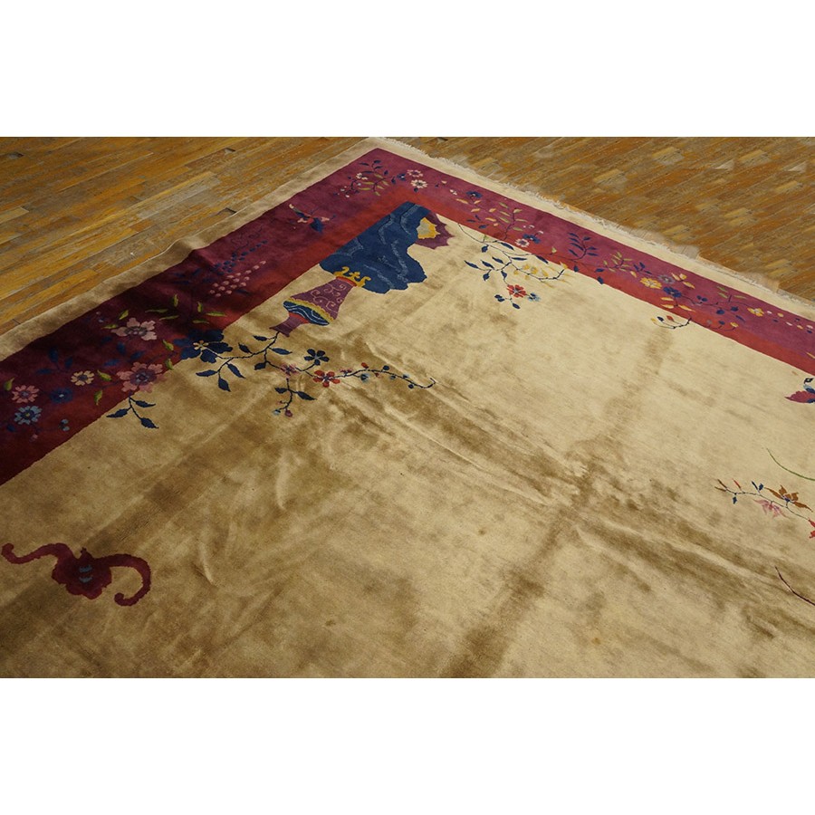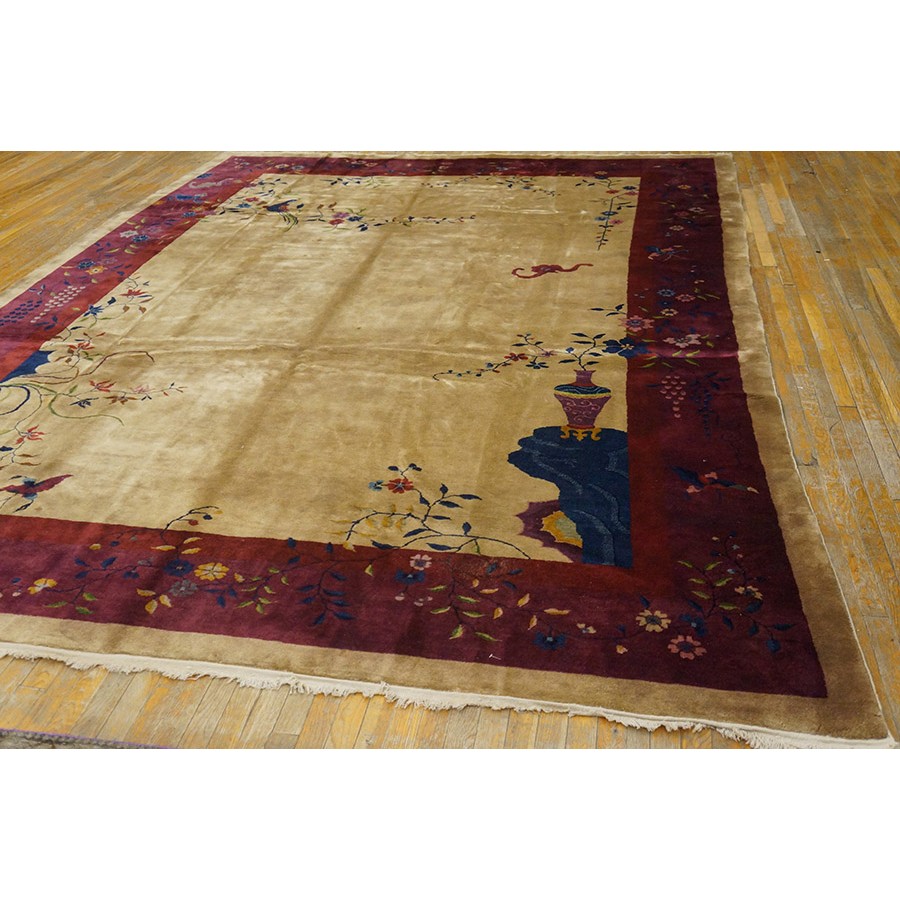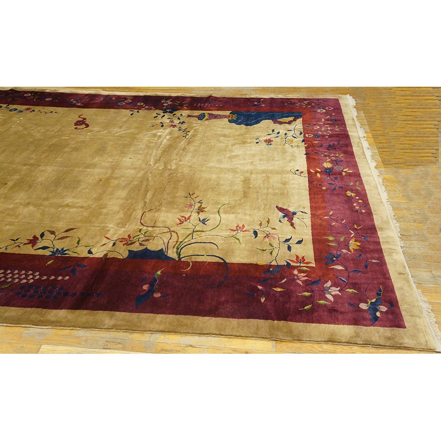 DescriptionChineseCarpets made in China proper. See entries Ningshia, Peking, Art Deco. Chinese - Art DecoAs the name implies, pieces woven between the wars for the Western market by mostly American owned firms especially Nichols and Fette, in thick heavy weaves using strong colors, asymmetric patterns and downplaying the Chinese-ness of the carpet. Nichols rugs are more strong toned than the pastel Fette. Most were woven in the coastal port city of Tientsin. Other lesser known workshops were also active. Some pieces are ultra-geometric and haute-Deco moderne in character: these are very rare. More frequent are pieces with bits of Chinese ornament: vases or other precious objects, paeonies, vines, fences, etc. Most common is the 9 x 12 size, in colors never found in mainstream Chinese rugs: backgrounds in black, mauve, purple, hot pink, orange, olive, employing the best synthetic chrome dyes of the period. Prices are still reasonable and carpets in top condition are available. | |