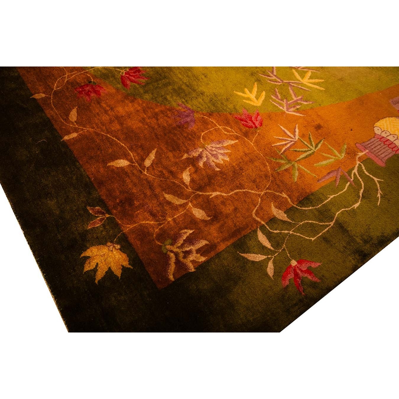 DescriptionChineseCarpets made in China proper. See entries Ningshia, Peking, Art Deco. Chinese - Art DecoAs the name implies, pieces woven between the wars for the Western market by mostly American owned firms especially Nichols and Fette, in thick heavy weaves using strong colors, asymmetric patterns and downplaying the Chinese-ness of the carpet. Nichols rugs are more strong toned than the pastel Fette. Most were woven in the coastal port city of Tientsin. Other lesser known workshops were also active. Some pieces are ultra-geometric and haute-Deco moderne in character: these are very rare. More frequent are pieces with bits of Chinese ornament: vases or other precious objects, paeonies, vines, fences, etc. Most common is the 9 x 12 size, in colors never found in mainstream Chinese rugs: backgrounds in black, mauve, purple, hot pink, orange, olive, employing the best synthetic chrome dyes of the period. Prices are still reasonable and carpets in top condition are available. | |