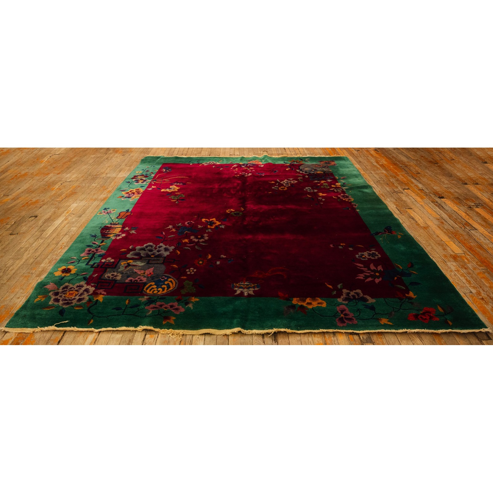 DescriptionChineseCarpets made in China proper. See entries Ningshia, Peking, Art Deco. Chinese - Art DecoAs the name implies, pieces woven between the wars for the Western market by mostly American owned firms especially Nichols and Fette, in thick heavy weaves using strong colors, asymmetric patterns and downplaying the Chinese-ness of the carpet. Nichols rugs are more strong toned than the pastel Fette. Most were woven in the coastal port city of Tientsin. Other lesser known workshops were also active. Some pieces are ultra-geometric and haute-Deco moderne in character: these are very rare. More frequent are pieces with bits of Chinese ornament: vases or other precious objects, paeonies, vines, fences, etc. Most common is the 9 x 12 size, in colors never found in mainstream Chinese rugs: backgrounds in black, mauve, purple, hot pink, orange, olive, employing the best synthetic chrome dyes of the period. Prices are still reasonable and carpets in top condition are available. | |