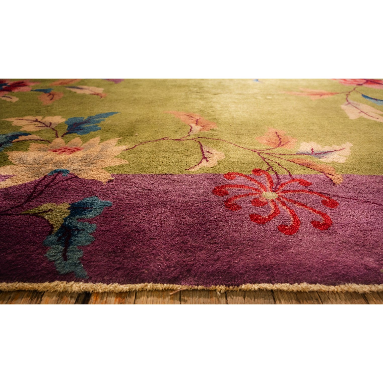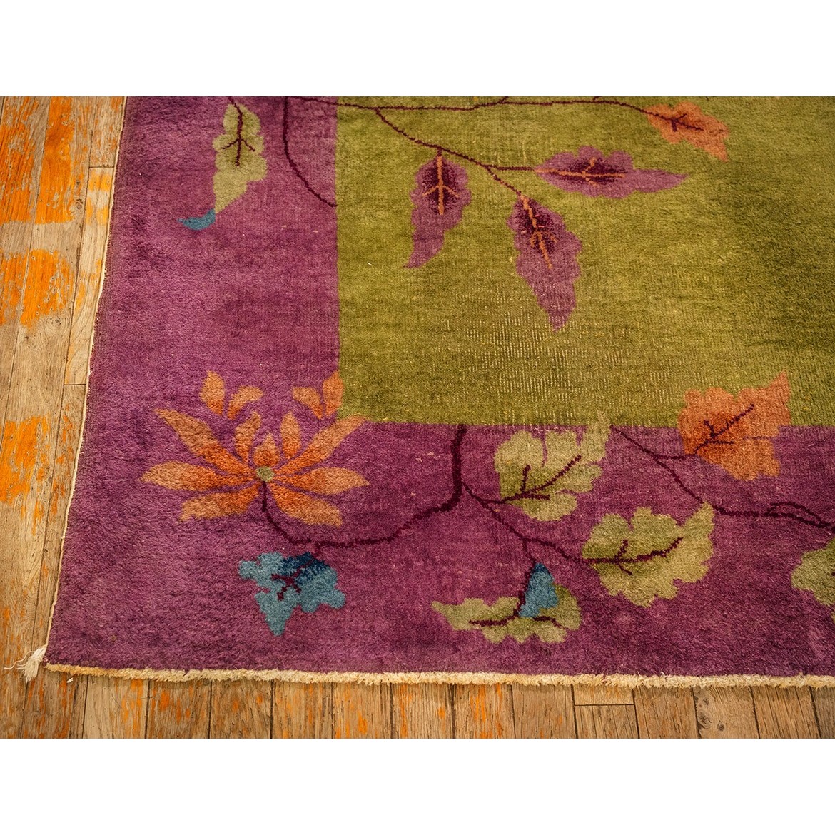 DescriptionChineseCarpets made in China proper. See entries Ningshia, Peking, Art Deco. Chinese - Art DecoAs the name implies, pieces woven between the wars for the Western market by mostly American owned firms especially Nichols and Fette, in thick heavy weaves using strong colors, asymmetric patterns and downplaying the Chinese-ness of the carpet. Nichols rugs are more strong toned than the pastel Fette. Most were woven in the coastal port city of Tientsin. Other lesser known workshops were also active. Some pieces are ultra-geometric and haute-Deco moderne in character: these are very rare. More frequent are pieces with bits of Chinese ornament: vases or other precious objects, paeonies, vines, fences, etc. Most common is the 9 x 12 size, in colors never found in mainstream Chinese rugs: backgrounds in black, mauve, purple, hot pink, orange, olive, employing the best synthetic chrome dyes of the period. Prices are still reasonable and carpets in top condition are available. | |