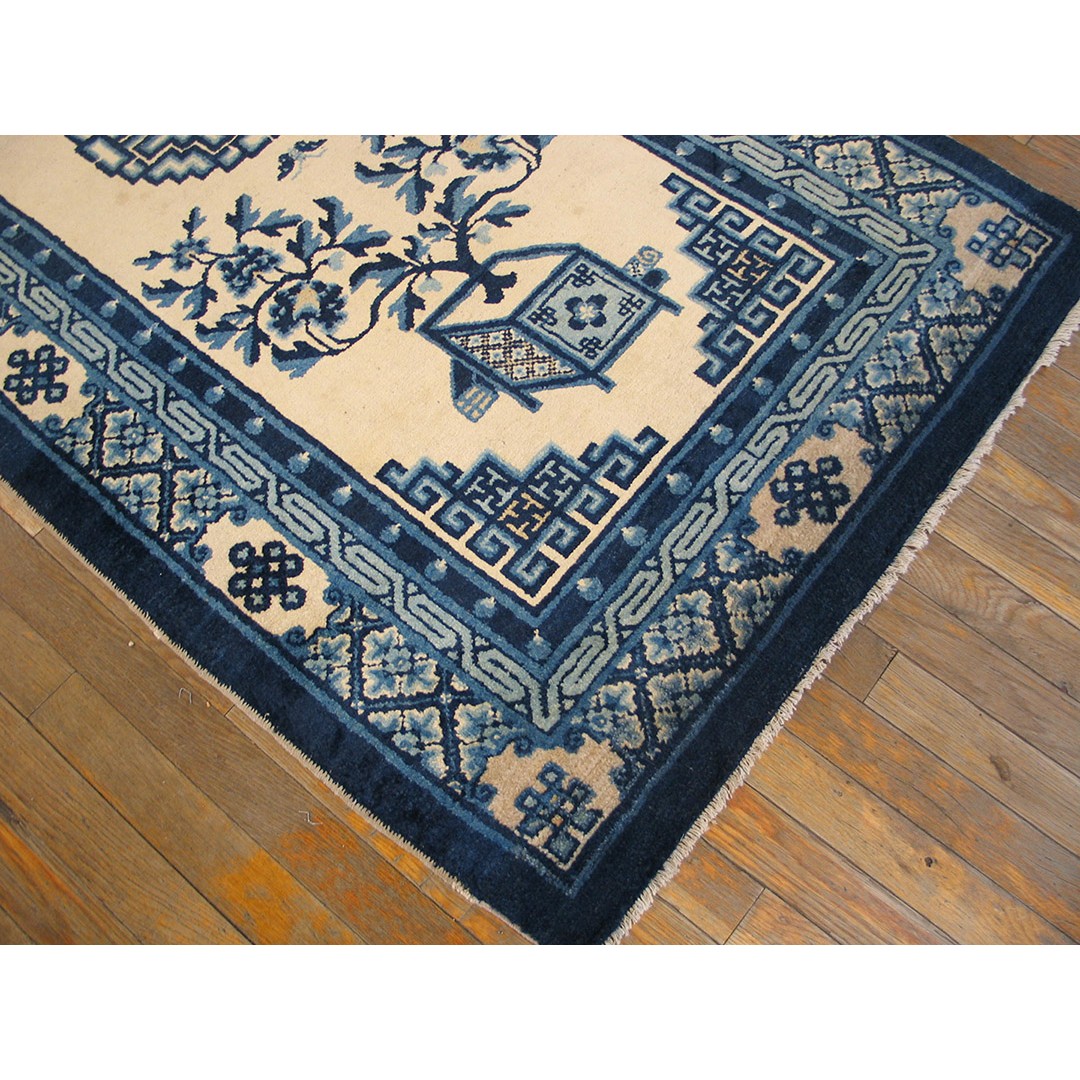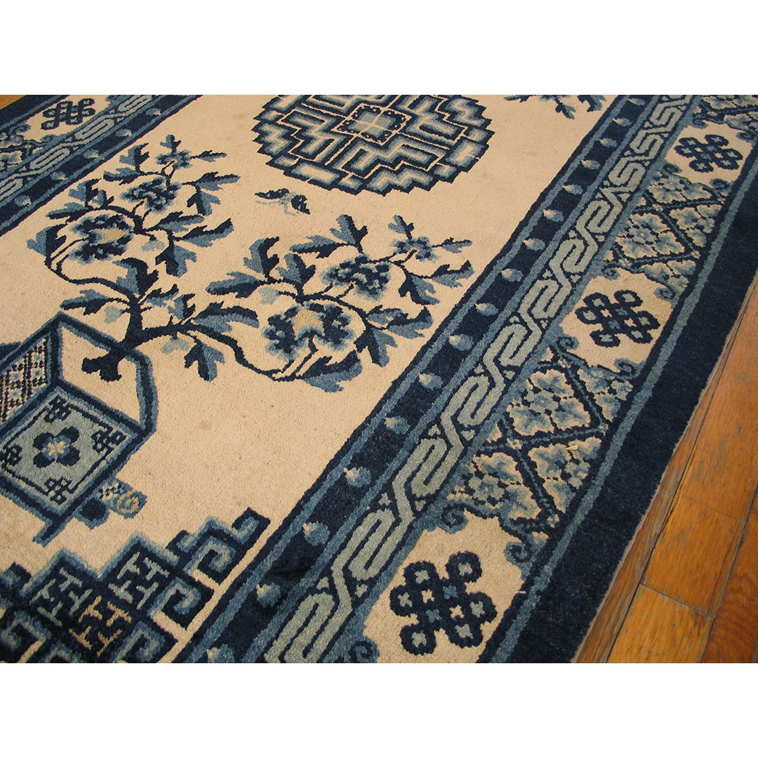 Blue and white palette with central fret medallion and split tree peony bushes growing from square vases above and below, framed by fret corners. The main border is in a knot and textile pattern with wave and pearl inner borders.