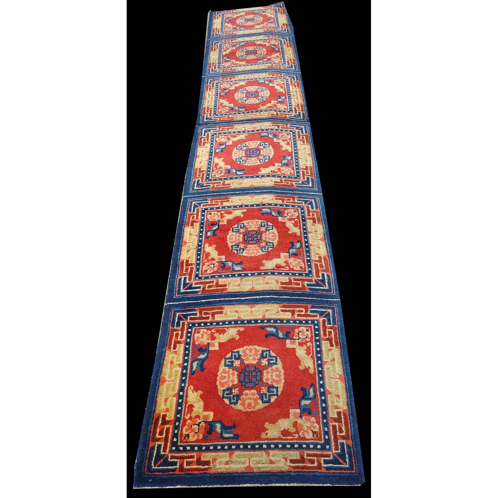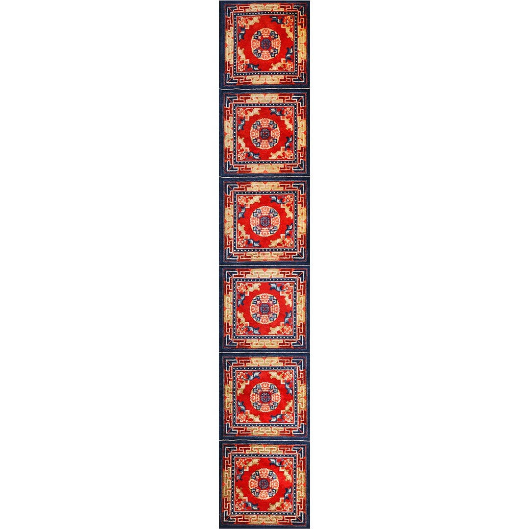 These six squares constitute what originally was a long narrow runner of seating squares made for Tibetan or Chinese monastery prayer halls. The bright red fields each display double dorje pattern with peony corners, within T-fret poly chrome borders. Although from c. 1920, the style goes well back into the 19th century. Often. these runners are divided into square sections for use on chair seats or made into pillows.