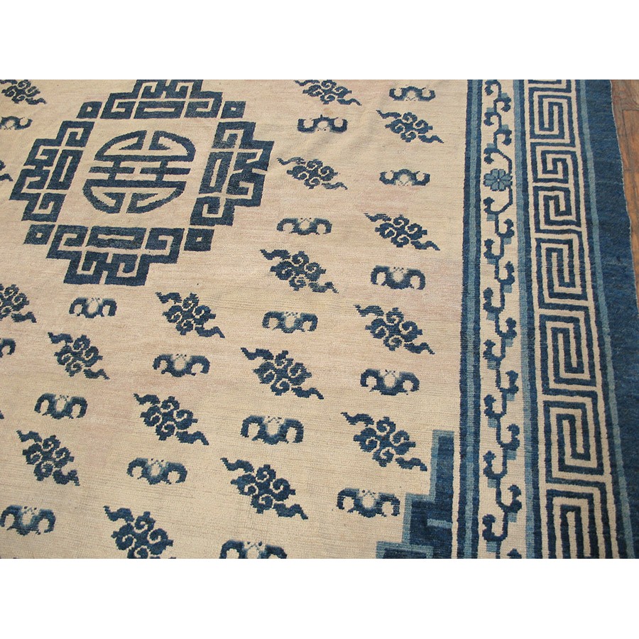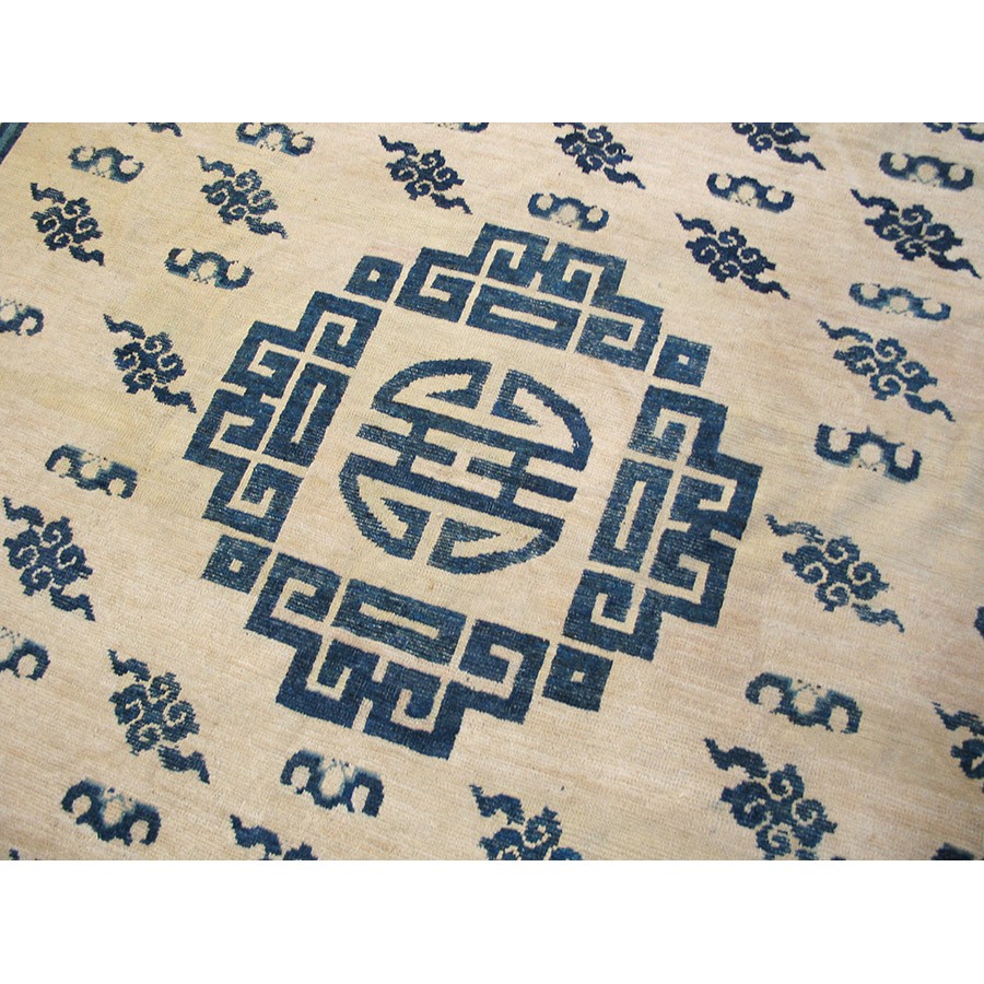 This carpet is a pair with 20411, both in the classically correct blue and white style. Frets are everywhere: the fret wave border, the thick deep blue fretwork corners, the bold “Shou” centered medallion with outlining fretwork sections. Clouds and bats are evenly distributed throughout the field. Of clearly northernmost Chinese origin, Mongolian carpets often simplify and enlarge traditional motives for extra impact.
