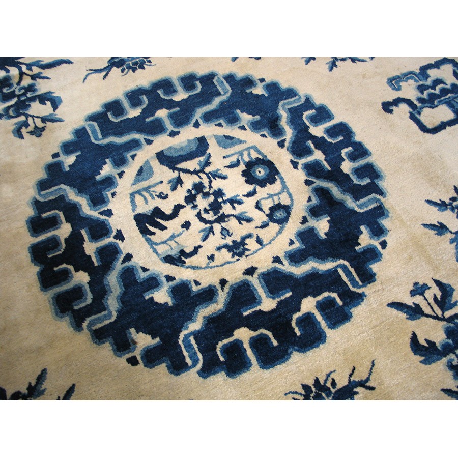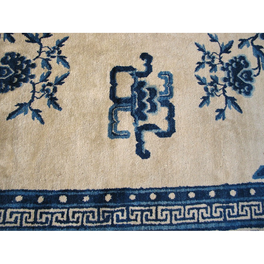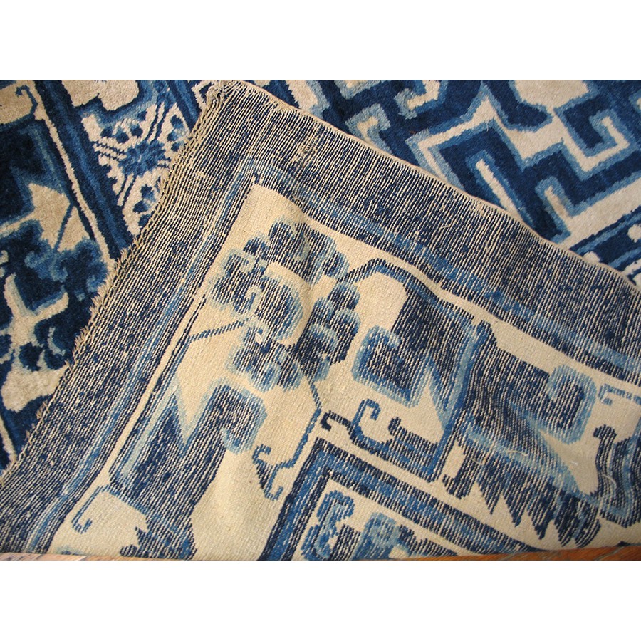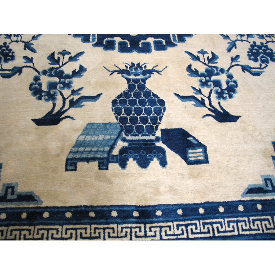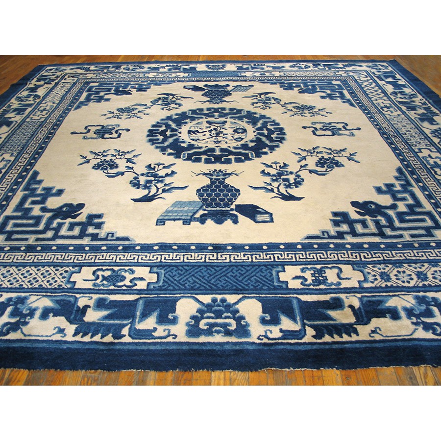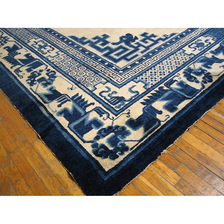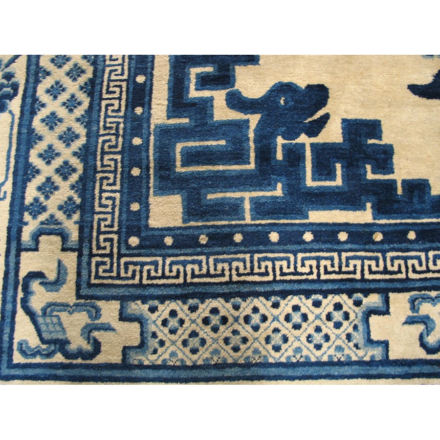 Mongolian carpets do not fit into the usual Chinese typology. Very often square, with limited palettes and of coarser wool, they seem to be woven by a separate craft tradition. This very attractive example has a Classic blue and white color scheme, dragon and fretwork corners, and Chinese objects (vases on dstands, Go boards, books), with a main paeony scroll border derived from Ningxia rugs. Regardless of exact origin, this circa 1880 carpet is totally authentic and impeccably Chinese in style.
