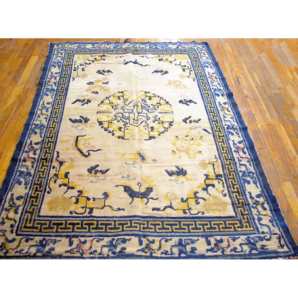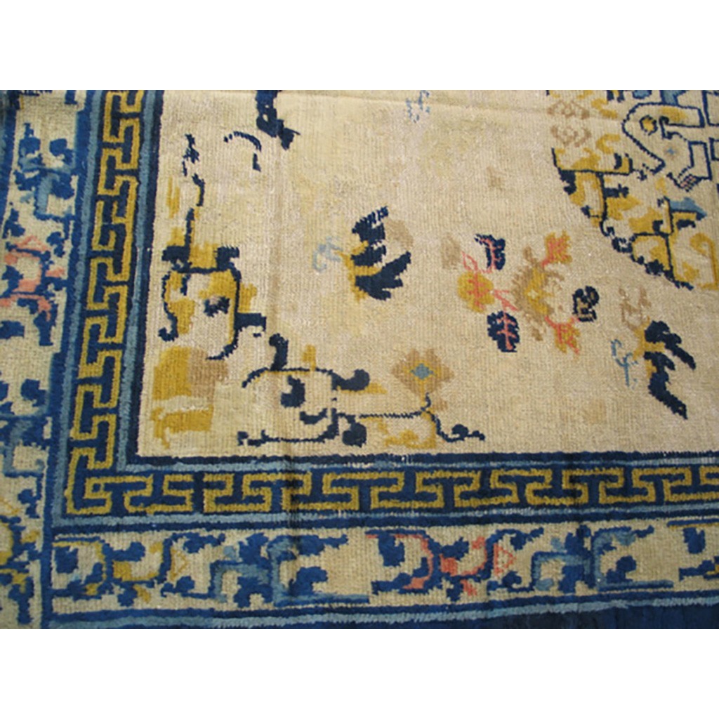 DescriptionChineseCarpets made in China proper. See entries Ningshia, Peking, Art Deco. Chinese - NingxiaThe western Chinese province of Ningshia has a mostly Muslim population and is the source of many of the oldest Chinese carpets of the modern (Ming Dynasty and later) era. The designs are typically Chinese: fretwork or Greek key boarders, pacony palmettes, bats, butterflies, Fu dogs, clouds, dragons, shou symbols, etc. Pollar carpets designed to wrap around monastery columns and displaying a dragon above waves are a specialty. The weave is coarse and soft, with several wefts between knot rows and a longish pile. Yellow golds, dark and light blues are common colors. The outer most plain border on pre 1800 examples is a corrosive brown. Formats include: large square throne carpets, paralleled meditation runners, chair seats and scalloped backs. | |