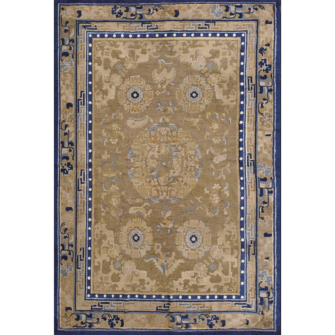 DescriptionChineseCarpets made in China proper. See entries Ningshia, Peking, Art Deco. Chinese - NingxiaThe western Chinese province of Ningshia has a mostly Muslim population and is the source of many of the oldest Chinese carpets of the modern (Ming Dynasty and later) era. The designs are typically Chinese: fretwork or Greek key boarders, pacony palmettes, bats, butterflies, Fu dogs, clouds, dragons, shou symbols, etc. Pollar carpets designed to wrap around monastery columns and displaying a dragon above waves are a specialty. The weave is coarse and soft, with several wefts between knot rows and a longish pile. Yellow golds, dark and light blues are common colors. The outer most plain border on pre 1800 examples is a corrosive brown. Formats include: large square throne carpets, paralleled meditation runners, chair seats and scalloped backs. | |