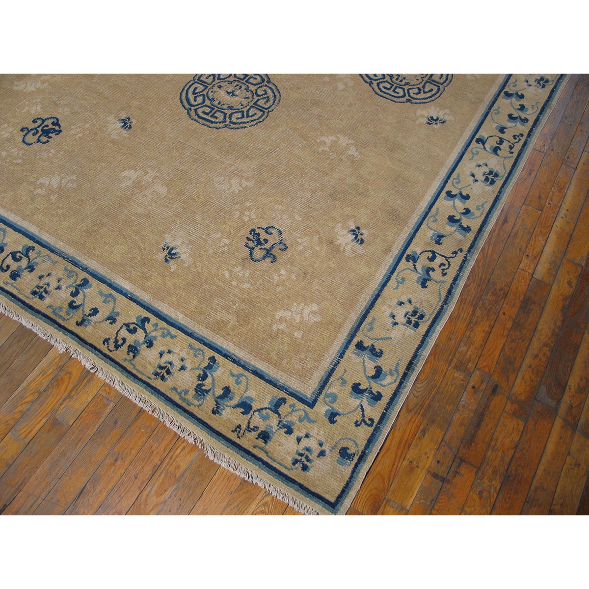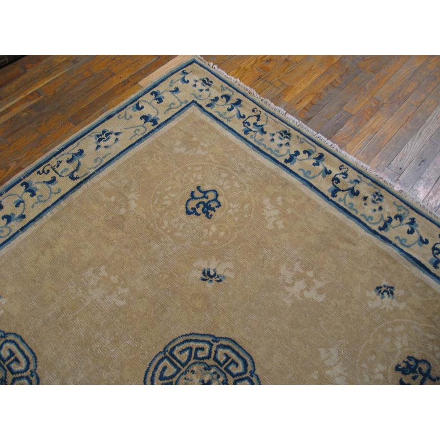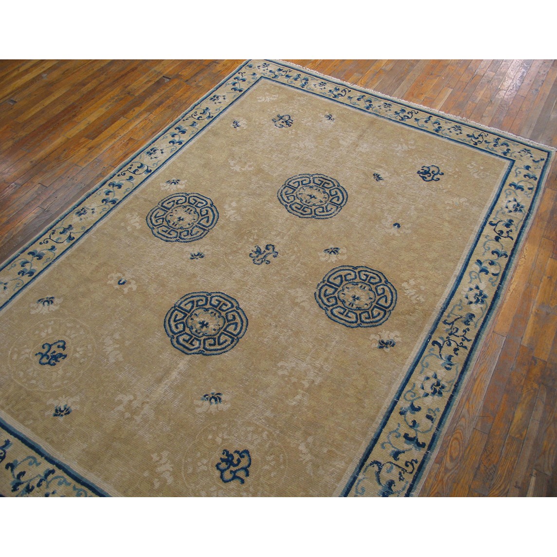 DescriptionChineseCarpets made in China proper. See entries Ningshia, Peking, Art Deco. Chinese - NingxiaThe western Chinese province of Ningshia has a mostly Muslim population and is the source of many of the oldest Chinese carpets of the modern (Ming Dynasty and later) era. The designs are typically Chinese: fretwork or Greek key boarders, pacony palmettes, bats, butterflies, Fu dogs, clouds, dragons, shou symbols, etc. Pollar carpets designed to wrap around monastery columns and displaying a dragon above waves are a specialty. The weave is coarse and soft, with several wefts between knot rows and a longish pile. Yellow golds, dark and light blues are common colors. The outer most plain border on pre 1800 examples is a corrosive brown. Formats include: large square throne carpets, paralleled meditation runners, chair seats and scalloped backs. | |