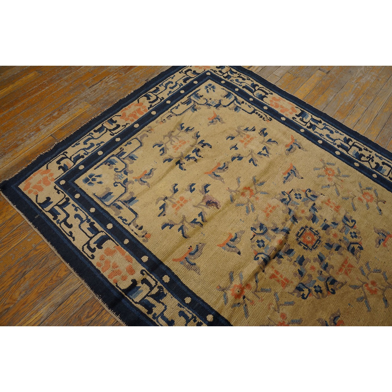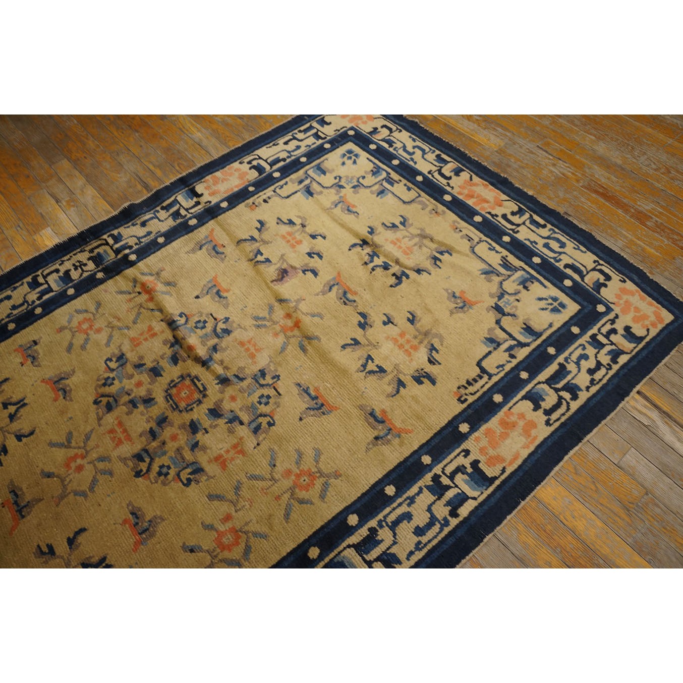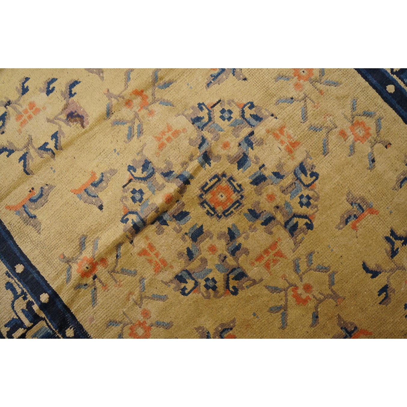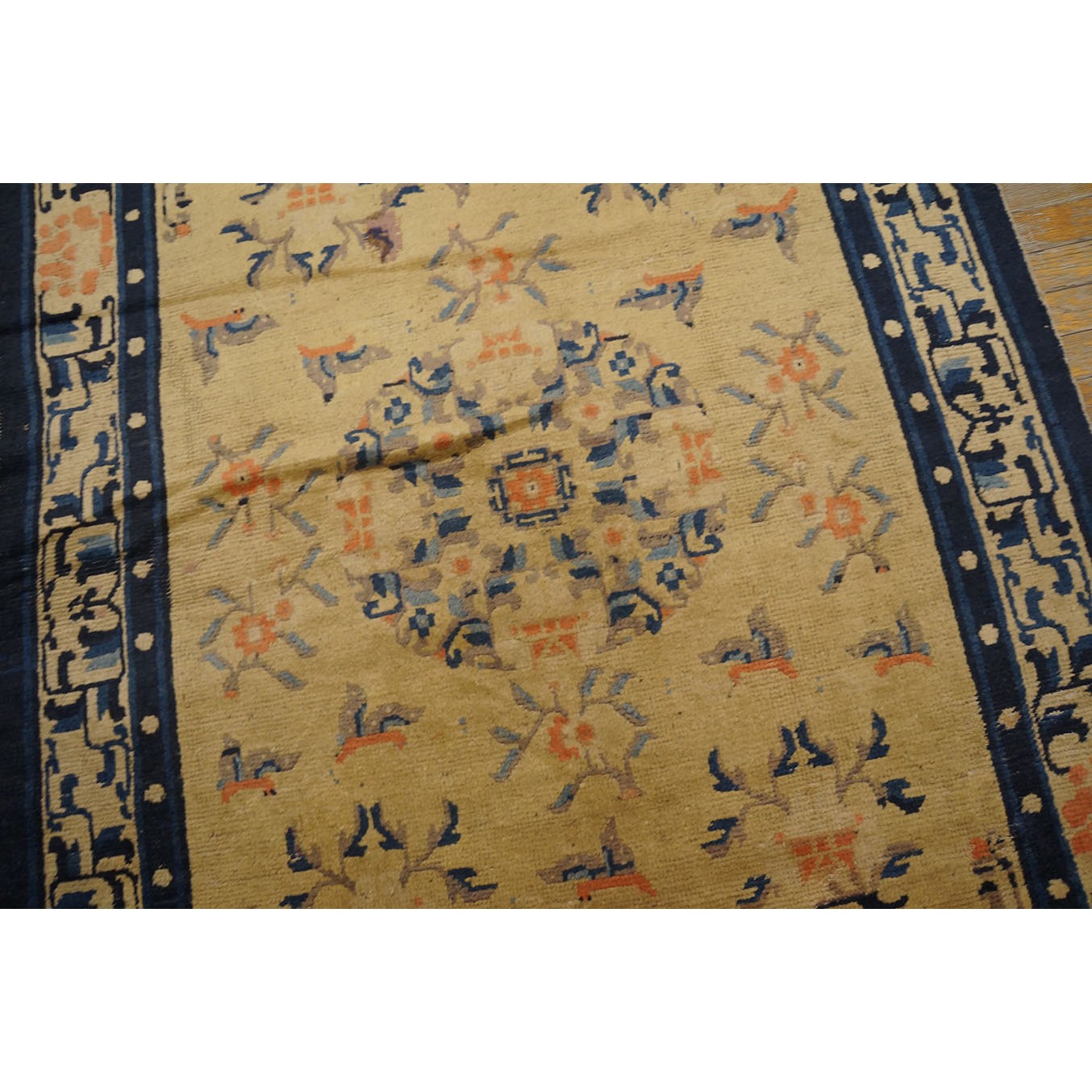 DescriptionChineseCarpets made in China proper. See entries Ningshia, Peking, Art Deco. Chinese - NingxiaThe western Chinese province of Ningshia has a mostly Muslim population and is the source of many of the oldest Chinese carpets of the modern (Ming Dynasty and later) era. The designs are typically Chinese: fretwork or Greek key boarders, pacony palmettes, bats, butterflies, Fu dogs, clouds, dragons, shou symbols, etc. Pollar carpets designed to wrap around monastery columns and displaying a dragon above waves are a specialty. The weave is coarse and soft, with several wefts between knot rows and a longish pile. Yellow golds, dark and light blues are common colors. The outer most plain border on pre 1800 examples is a corrosive brown. Formats include: large square throne carpets, paralleled meditation runners, chair seats and scalloped backs. | |