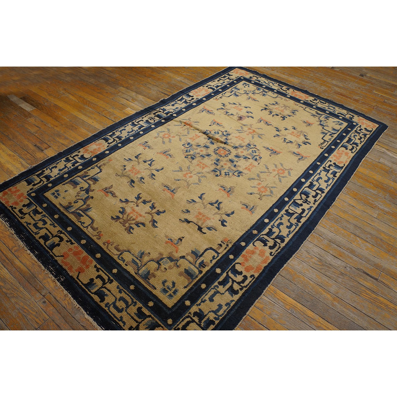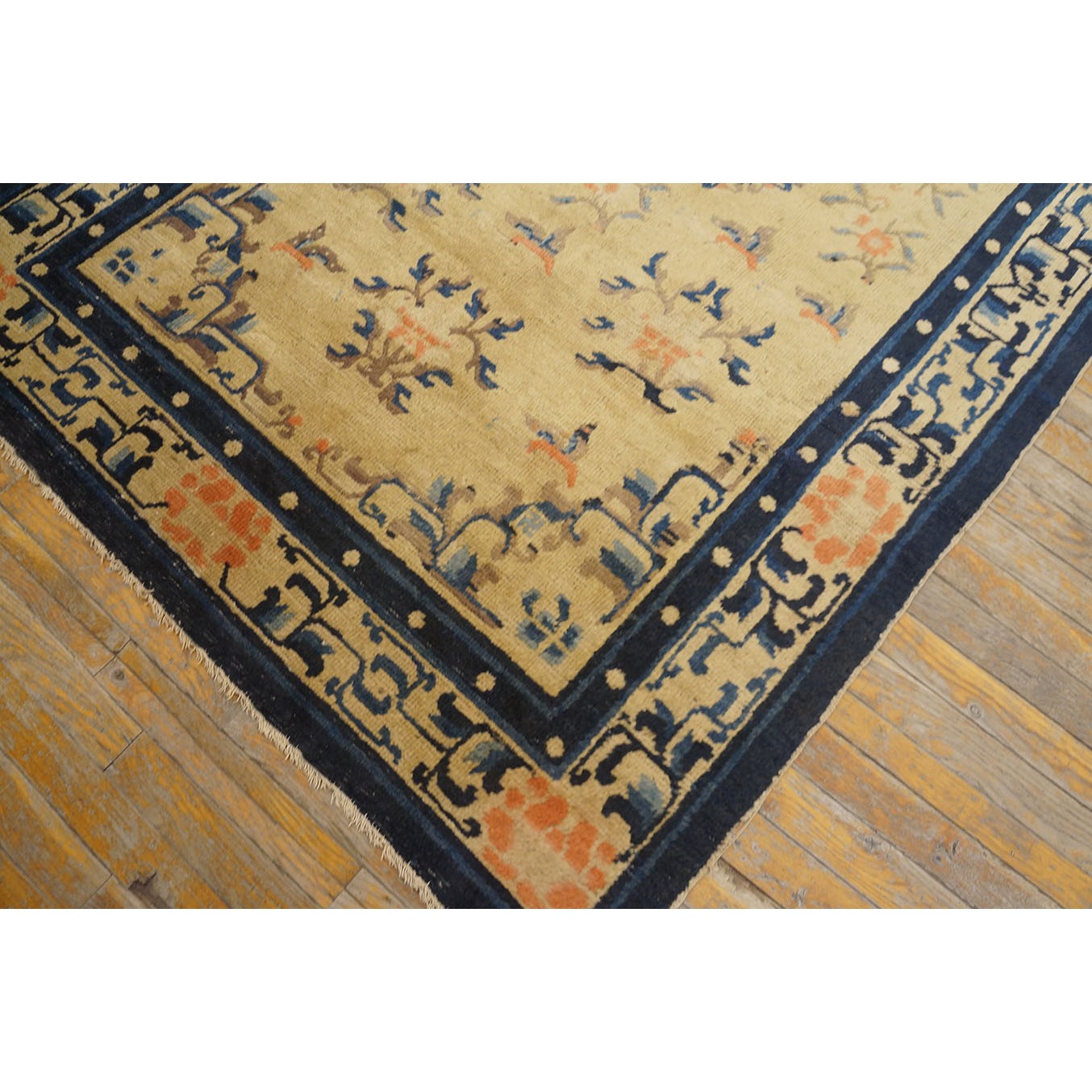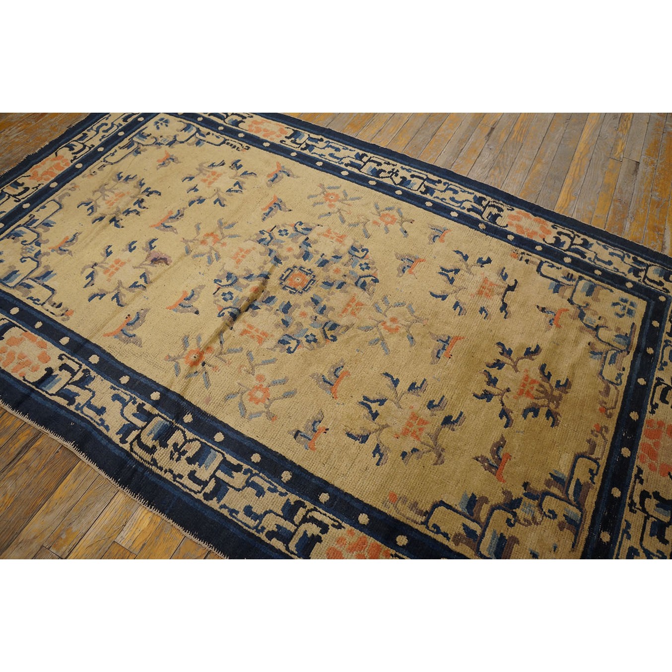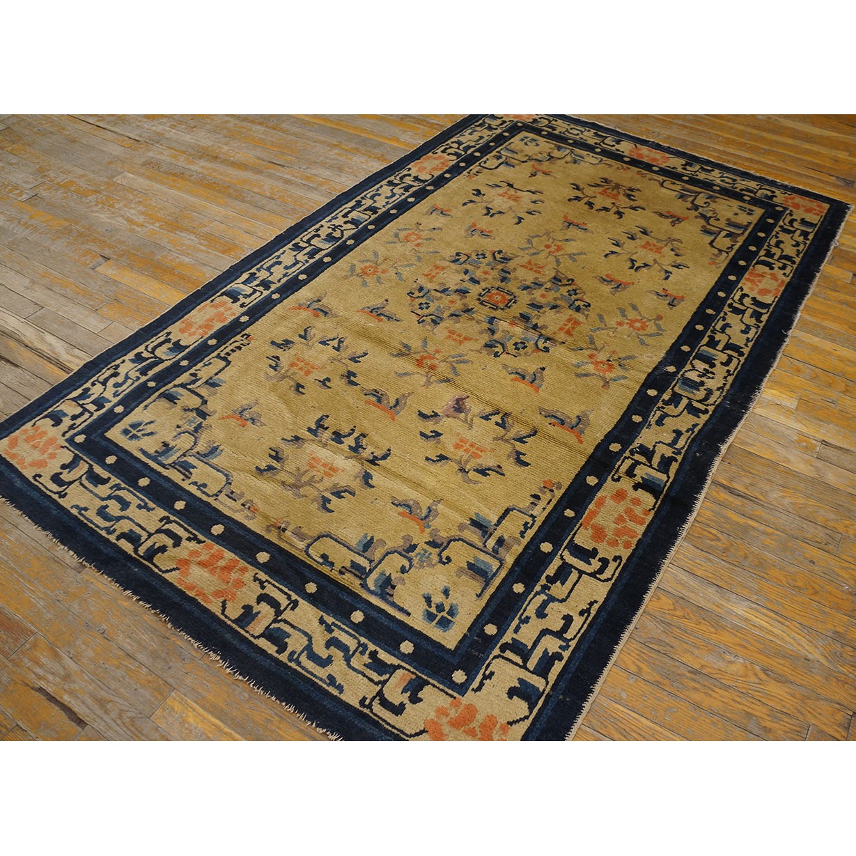 DescriptionChineseCarpets made in China proper. See entries Ningshia, Peking, Art Deco. Chinese - NingxiaThe western Chinese province of Ningshia has a mostly Muslim population and is the source of many of the oldest Chinese carpets of the modern (Ming Dynasty and later) era. The designs are typically Chinese: fretwork or Greek key boarders, pacony palmettes, bats, butterflies, Fu dogs, clouds, dragons, shou symbols, etc. Pollar carpets designed to wrap around monastery columns and displaying a dragon above waves are a specialty. The weave is coarse and soft, with several wefts between knot rows and a longish pile. Yellow golds, dark and light blues are common colors. The outer most plain border on pre 1800 examples is a corrosive brown. Formats include: large square throne carpets, paralleled meditation runners, chair seats and scalloped backs. | |