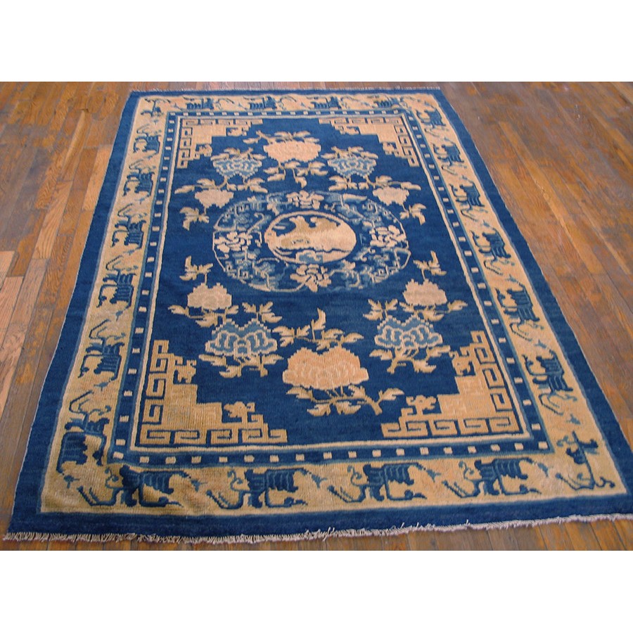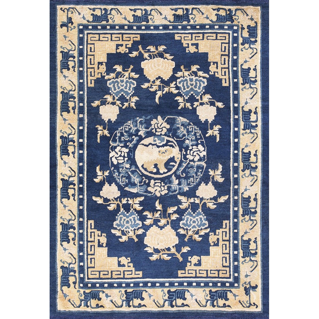 DescriptionChineseCarpets made in China proper. See entries Ningshia, Peking, Art Deco. Chinese - NingxiaThe western Chinese province of Ningshia has a mostly Muslim population and is the source of many of the oldest Chinese carpets of the modern (Ming Dynasty and later) era. The designs are typically Chinese: fretwork or Greek key boarders, pacony palmettes, bats, butterflies, Fu dogs, clouds, dragons, shou symbols, etc. Pollar carpets designed to wrap around monastery columns and displaying a dragon above waves are a specialty. The weave is coarse and soft, with several wefts between knot rows and a longish pile. Yellow golds, dark and light blues are common colors. The outer most plain border on pre 1800 examples is a corrosive brown. Formats include: large square throne carpets, paralleled meditation runners, chair seats and scalloped backs. | |