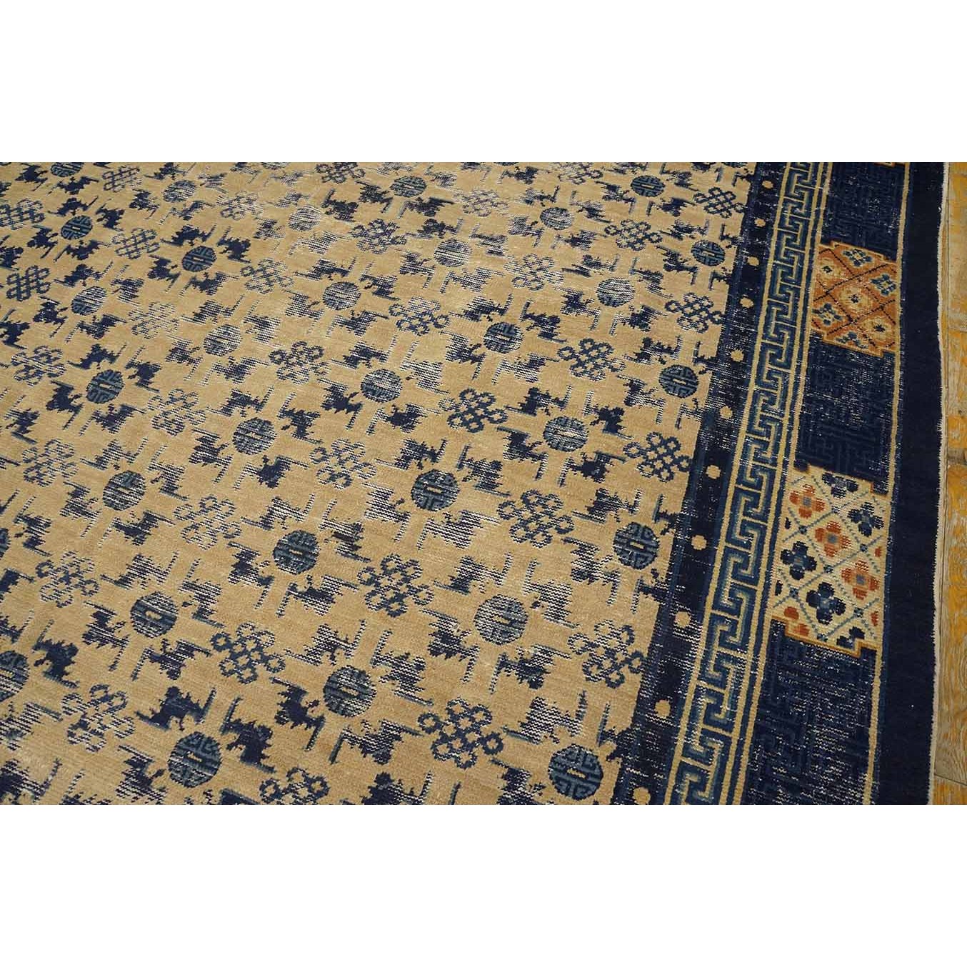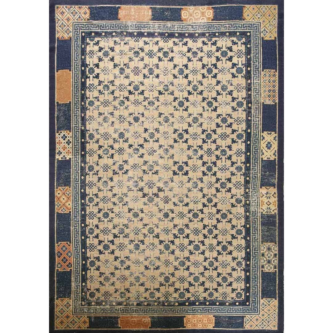 DescriptionChineseCarpets made in China proper. See entries Ningshia, Peking, Art Deco. Chinese - NingxiaThe western Chinese province of Ningshia has a mostly Muslim population and is the source of many of the oldest Chinese carpets of the modern (Ming Dynasty and later) era. The designs are typically Chinese: fretwork or Greek key boarders, pacony palmettes, bats, butterflies, Fu dogs, clouds, dragons, shou symbols, etc. Pollar carpets designed to wrap around monastery columns and displaying a dragon above waves are a specialty. The weave is coarse and soft, with several wefts between knot rows and a longish pile. Yellow golds, dark and light blues are common colors. The outer most plain border on pre 1800 examples is a corrosive brown. Formats include: large square throne carpets, paralleled meditation runners, chair seats and scalloped backs. | |