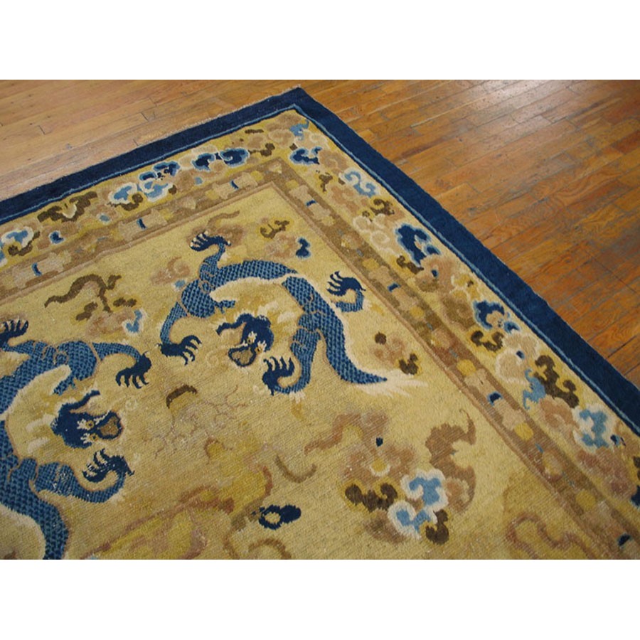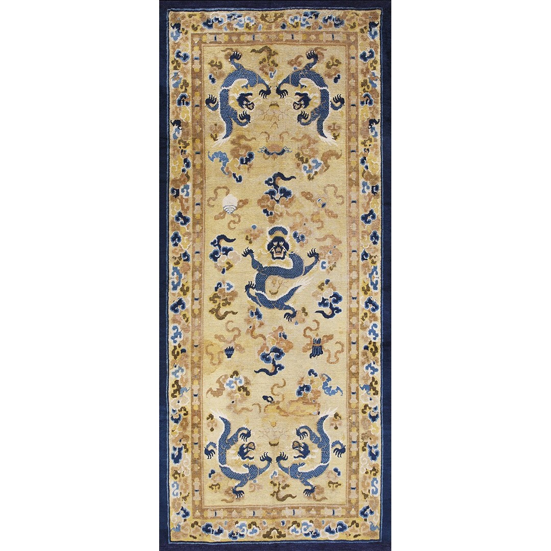Five dragons writhe and soar on a light yellow ground on this classically rendered long carpet from northern China, circa 1800. Flaming pearls, Buddhist symbols and cloud knots add exotic elements. The Airborne effect is further reinforced by the polychrome cloud main border.