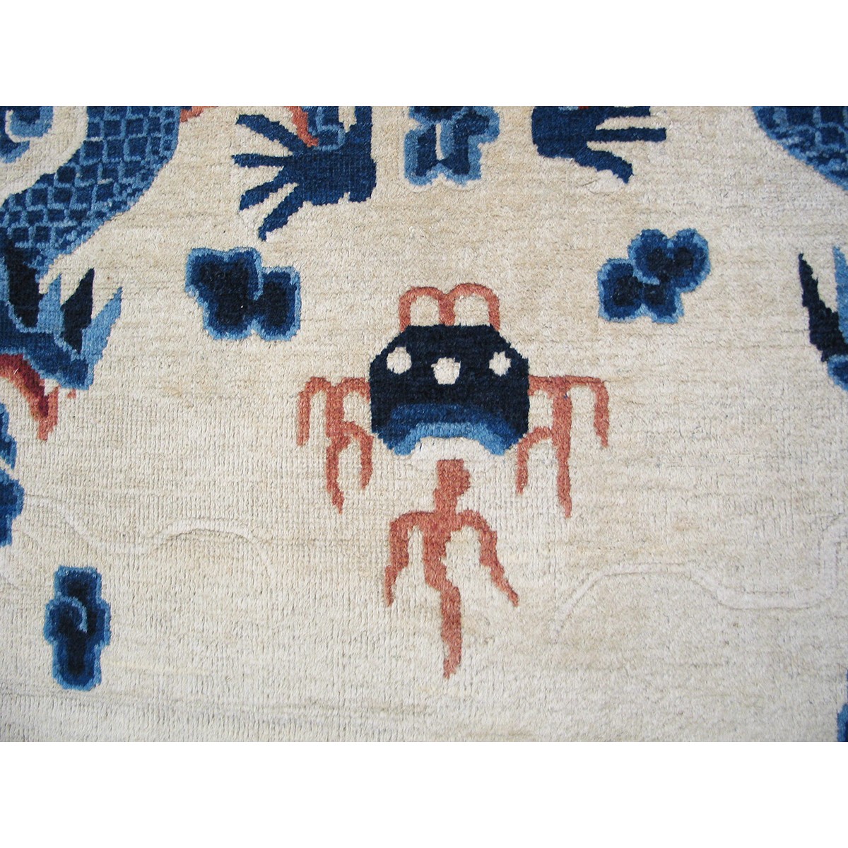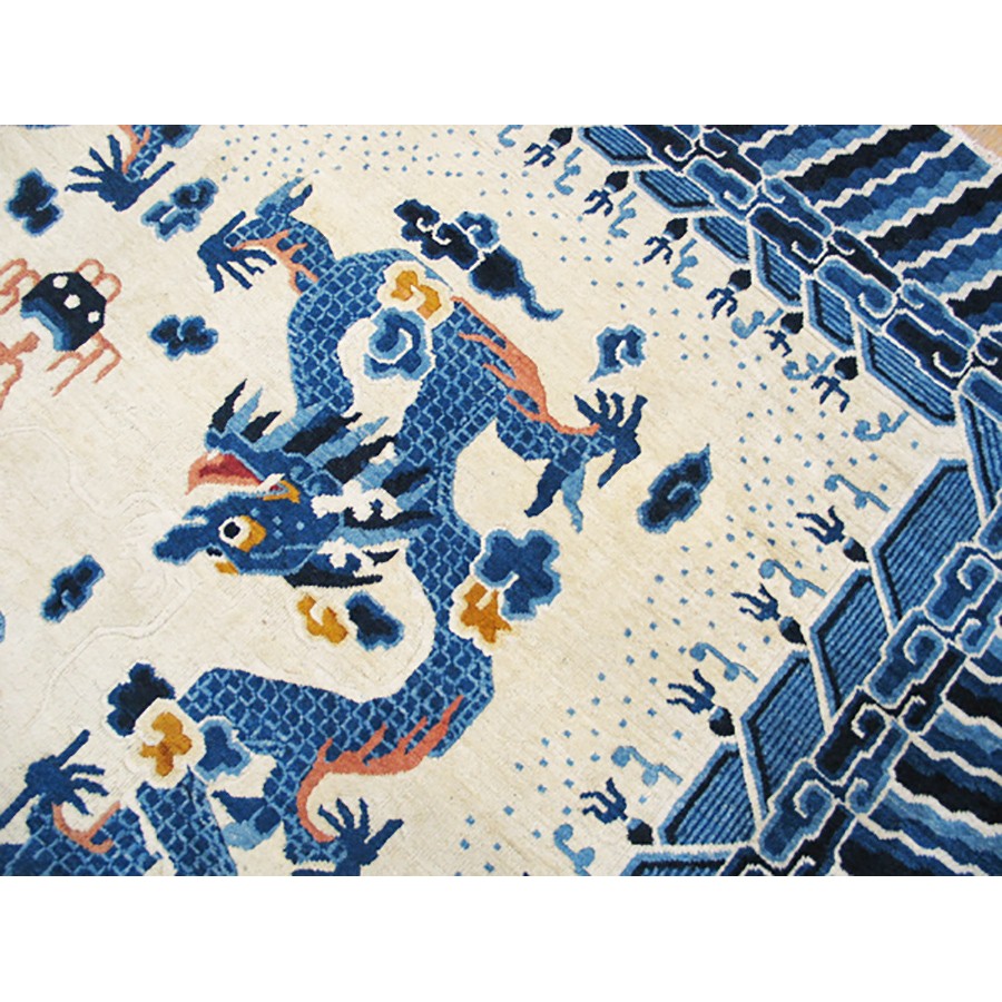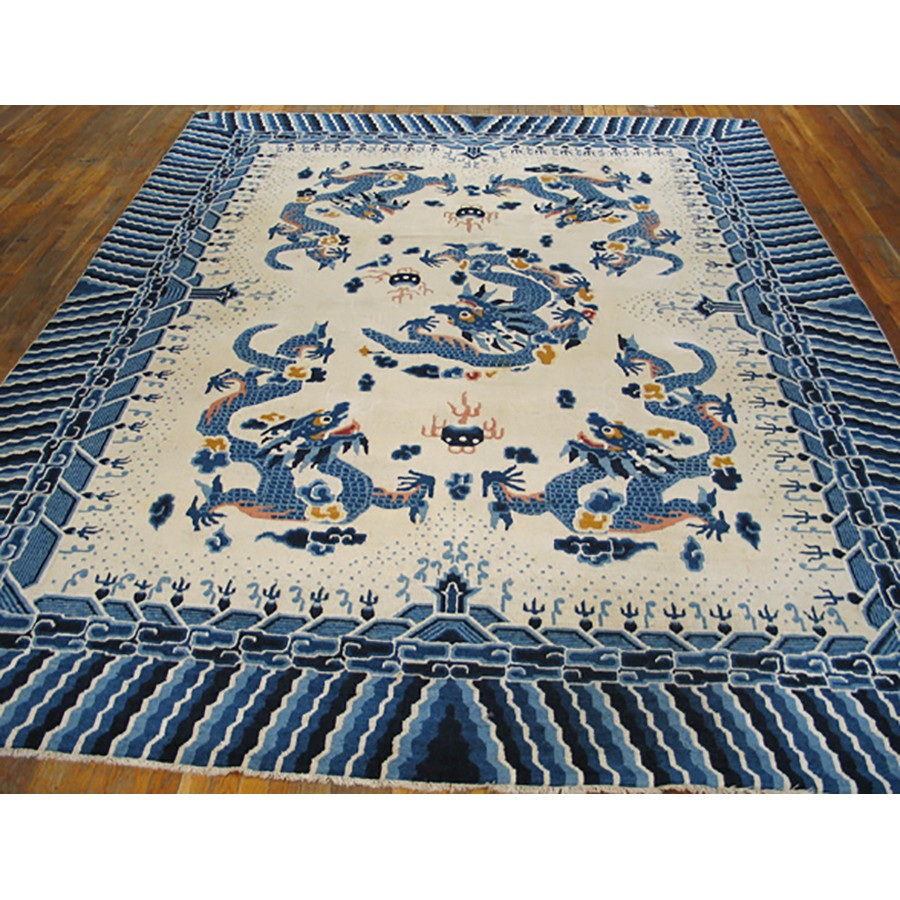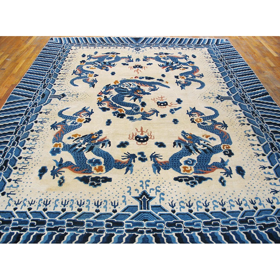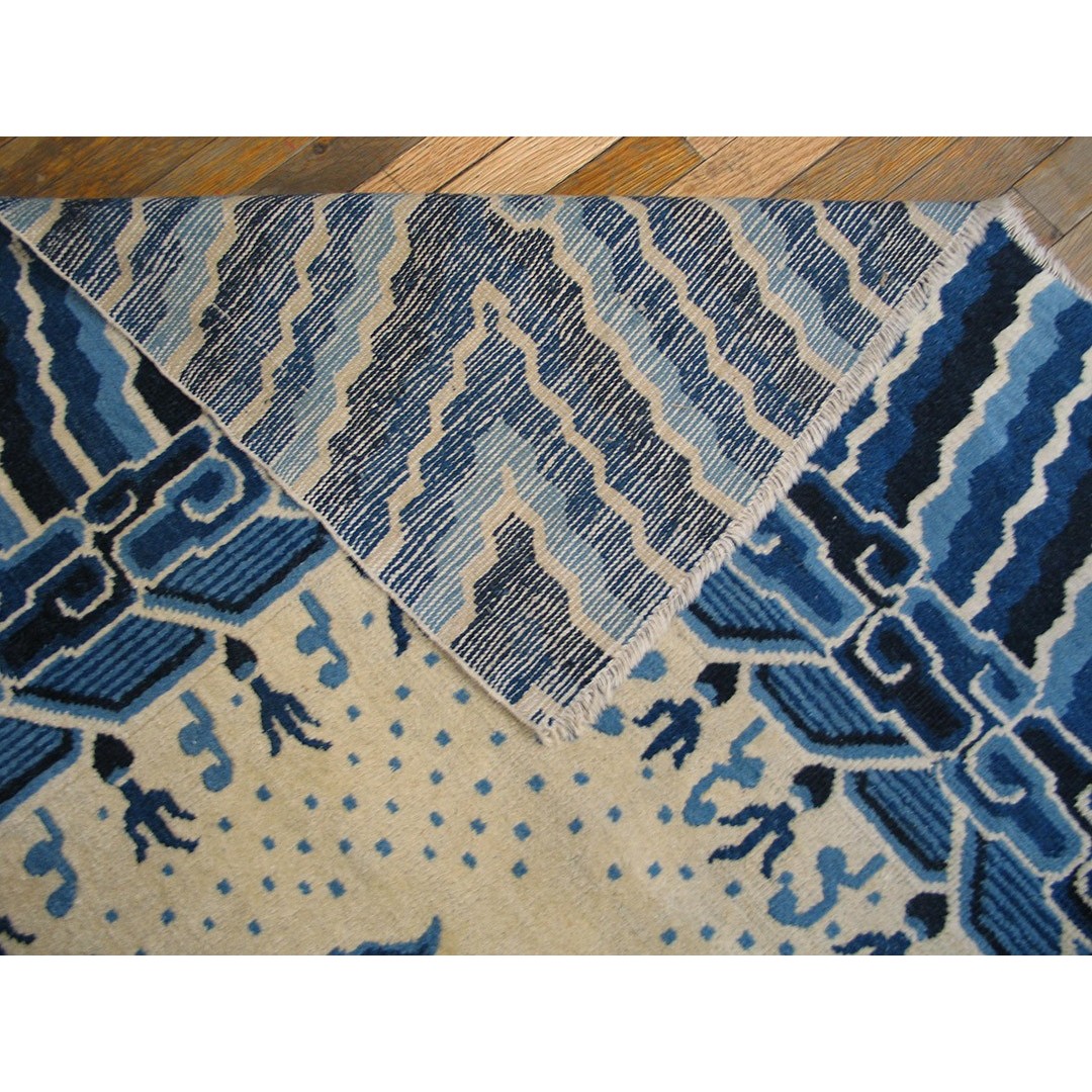 DescriptionChineseCarpets made in China proper. See entries Ningshia, Peking, Art Deco. Chinese - NingxiaThe western Chinese province of Ningshia has a mostly Muslim population and is the source of many of the oldest Chinese carpets of the modern (Ming Dynasty and later) era. The designs are typically Chinese: fretwork or Greek key boarders, pacony palmettes, bats, butterflies, Fu dogs, clouds, dragons, shou symbols, etc. Pollar carpets designed to wrap around monastery columns and displaying a dragon above waves are a specialty. The weave is coarse and soft, with several wefts between knot rows and a longish pile. Yellow golds, dark and light blues are common colors. The outer most plain border on pre 1800 examples is a corrosive brown. Formats include: large square throne carpets, paralleled meditation runners, chair seats and scalloped backs. | |
