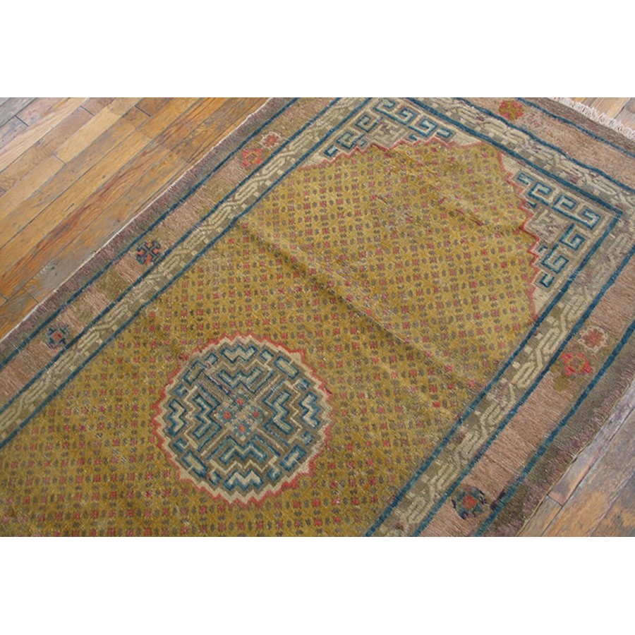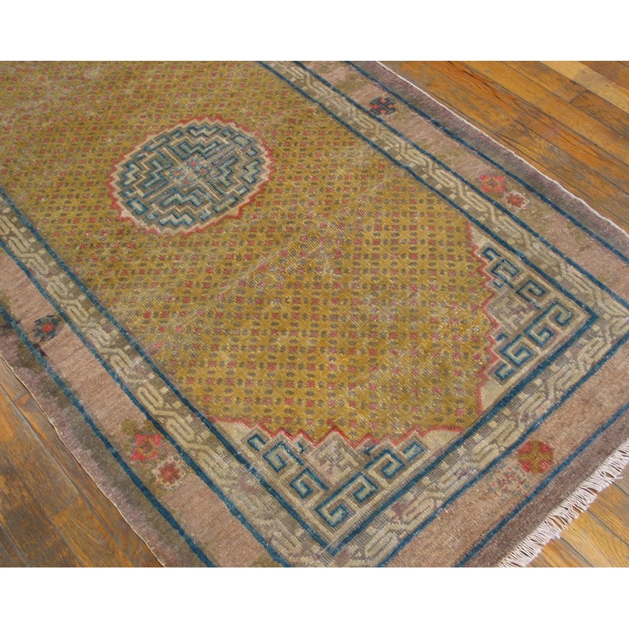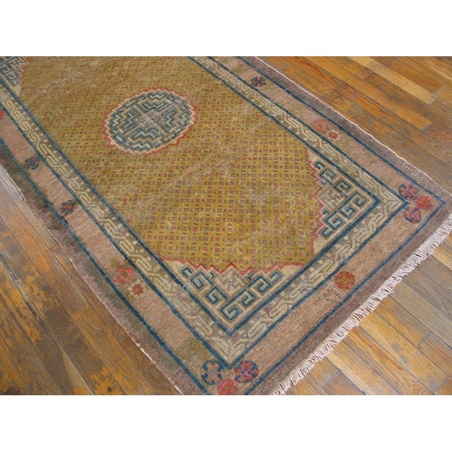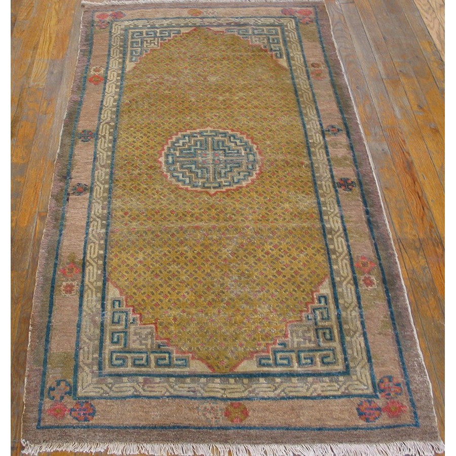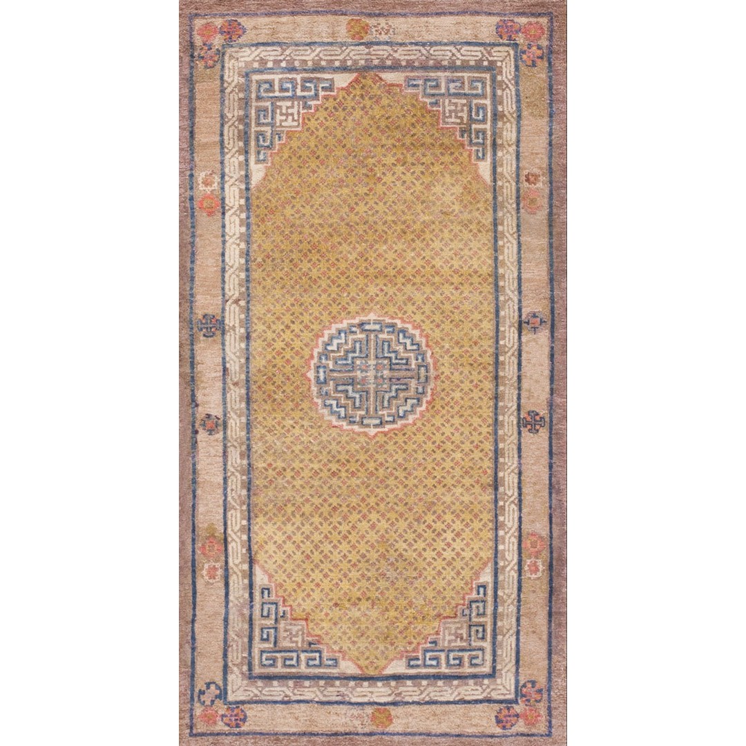 DescriptionChineseCarpets made in China proper. See entries Ningshia, Peking, Art Deco. Chinese - NingxiaThe western Chinese province of Ningshia has a mostly Muslim population and is the source of many of the oldest Chinese carpets of the modern (Ming Dynasty and later) era. The designs are typically Chinese: fretwork or Greek key boarders, pacony palmettes, bats, butterflies, Fu dogs, clouds, dragons, shou symbols, etc. Pollar carpets designed to wrap around monastery columns and displaying a dragon above waves are a specialty. The weave is coarse and soft, with several wefts between knot rows and a longish pile. Yellow golds, dark and light blues are common colors. The outer most plain border on pre 1800 examples is a corrosive brown. Formats include: large square throne carpets, paralleled meditation runners, chair seats and scalloped backs. | |
