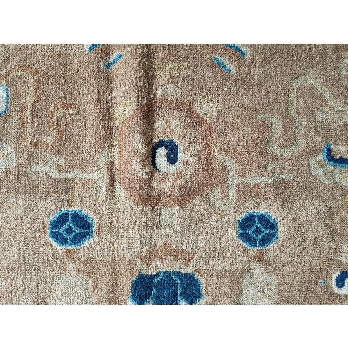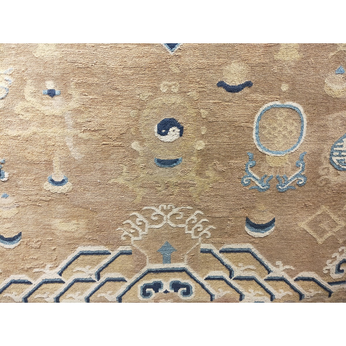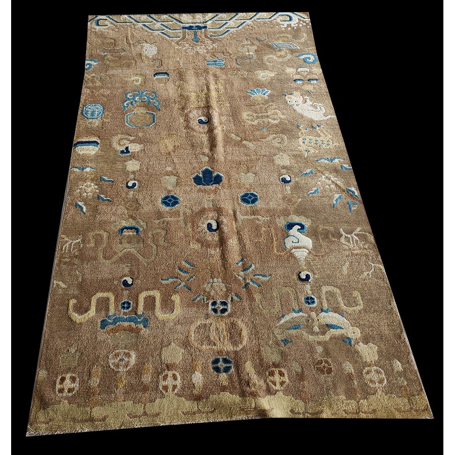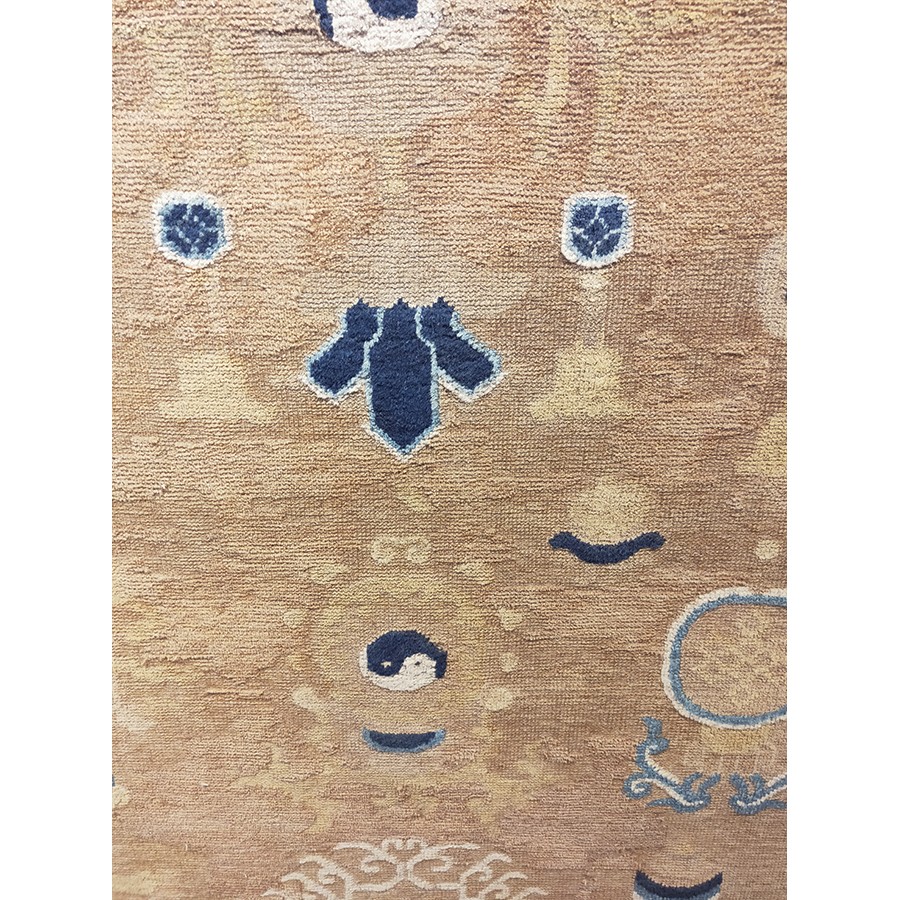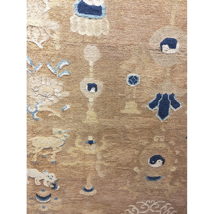 DescriptionChineseCarpets made in China proper. See entries Ningshia, Peking, Art Deco. Chinese - NingxiaThe western Chinese province of Ningshia has a mostly Muslim population and is the source of many of the oldest Chinese carpets of the modern (Ming Dynasty and later) era. The designs are typically Chinese: fretwork or Greek key boarders, pacony palmettes, bats, butterflies, Fu dogs, clouds, dragons, shou symbols, etc. Pollar carpets designed to wrap around monastery columns and displaying a dragon above waves are a specialty. The weave is coarse and soft, with several wefts between knot rows and a longish pile. Yellow golds, dark and light blues are common colors. The outer most plain border on pre 1800 examples is a corrosive brown. Formats include: large square throne carpets, paralleled meditation runners, chair seats and scalloped backs. | |