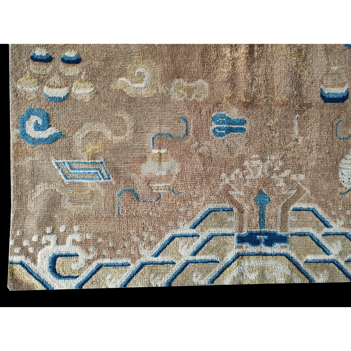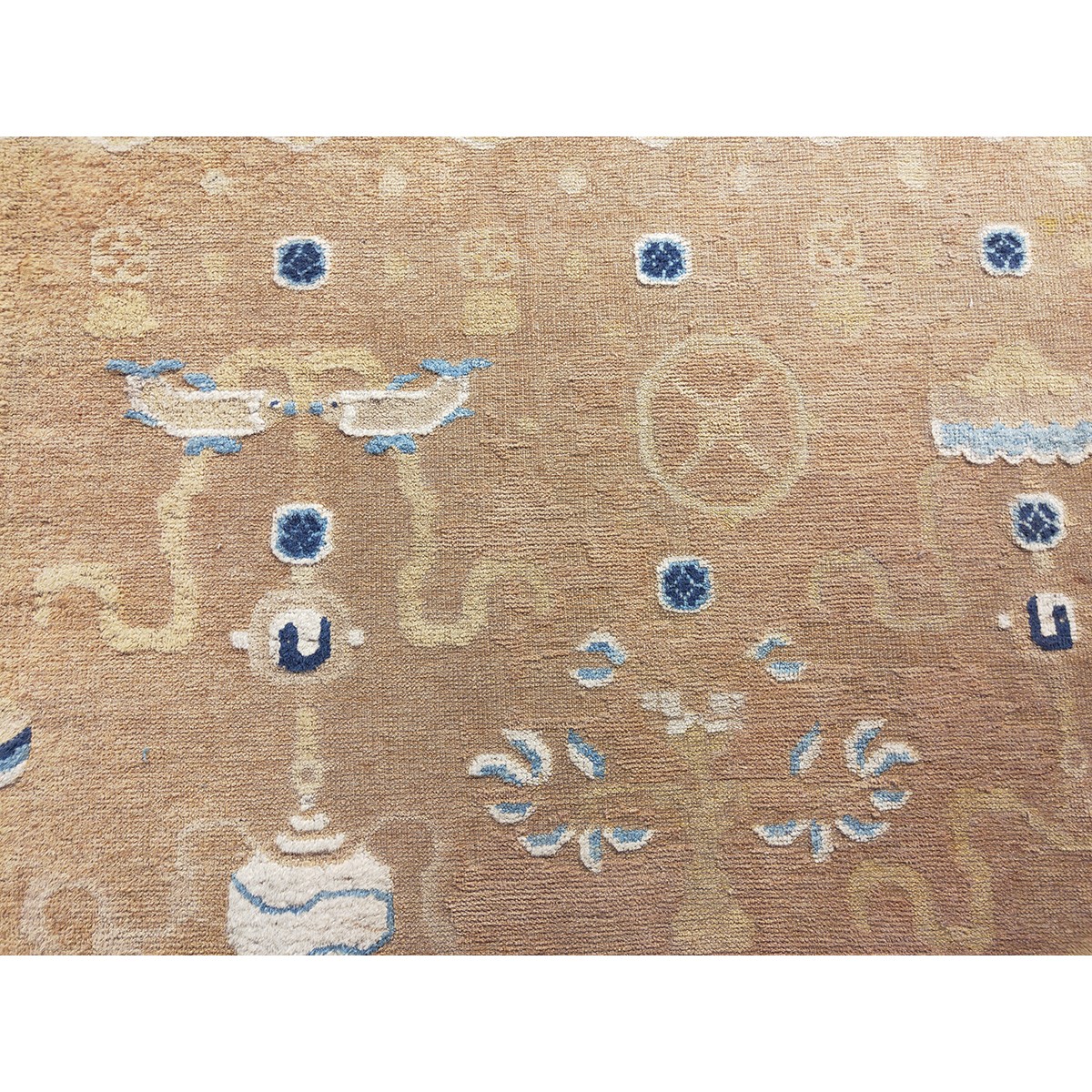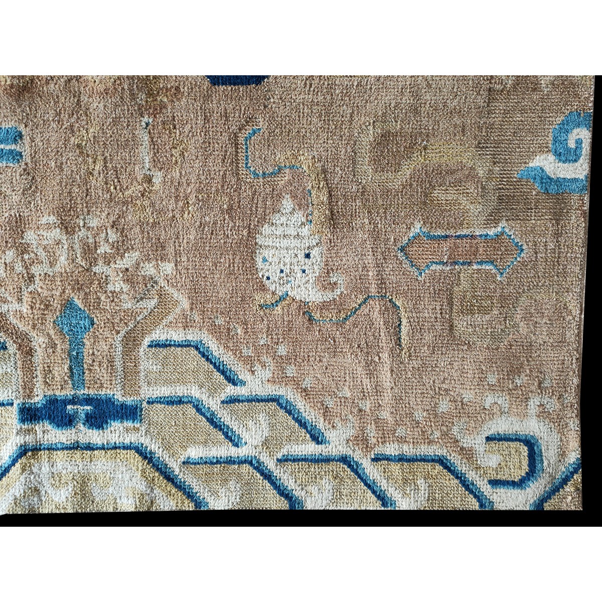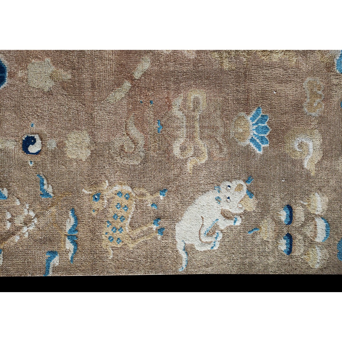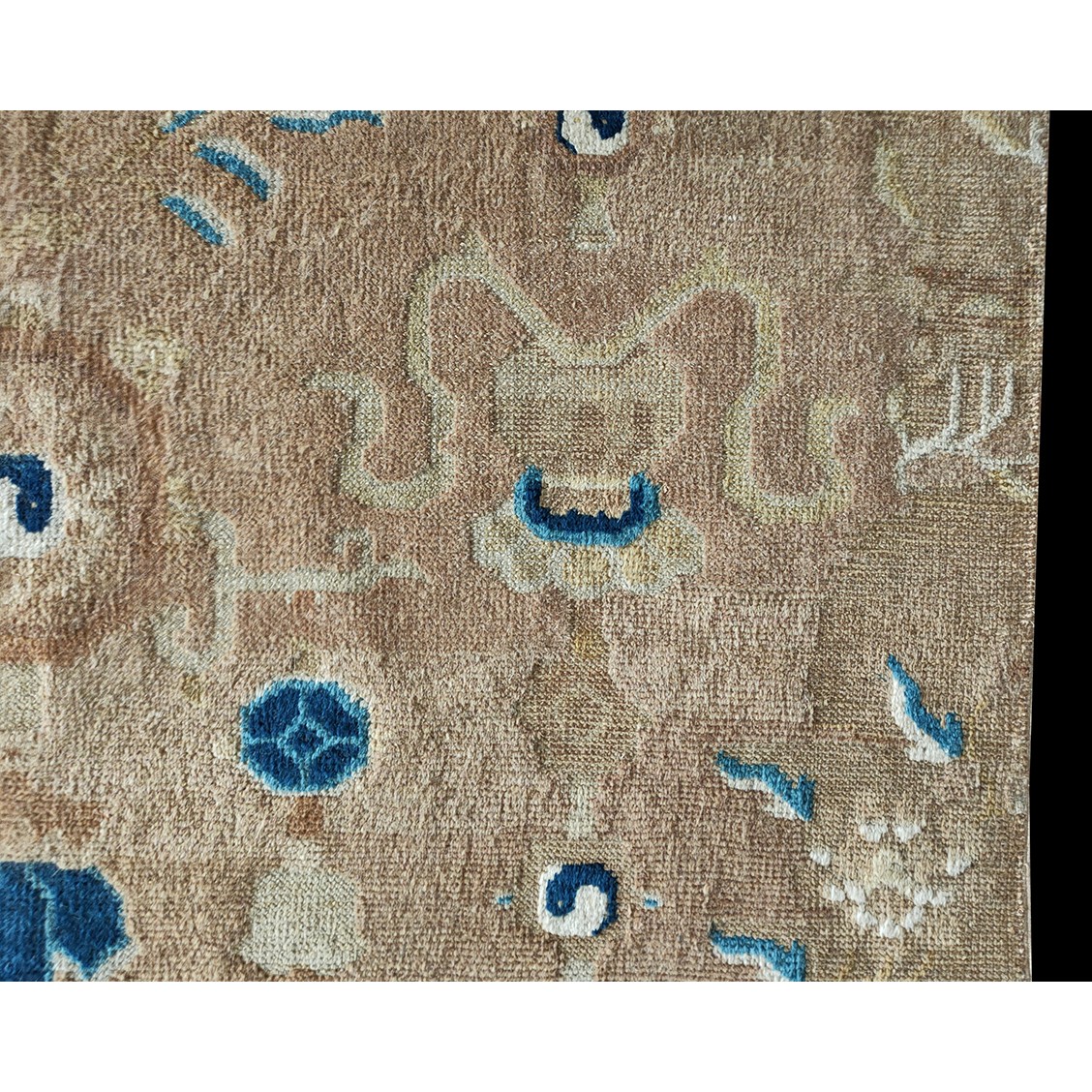 DescriptionChineseCarpets made in China proper. See entries Ningshia, Peking, Art Deco. Chinese - NingxiaThe western Chinese province of Ningshia has a mostly Muslim population and is the source of many of the oldest Chinese carpets of the modern (Ming Dynasty and later) era. The designs are typically Chinese: fretwork or Greek key boarders, pacony palmettes, bats, butterflies, Fu dogs, clouds, dragons, shou symbols, etc. Pollar carpets designed to wrap around monastery columns and displaying a dragon above waves are a specialty. The weave is coarse and soft, with several wefts between knot rows and a longish pile. Yellow golds, dark and light blues are common colors. The outer most plain border on pre 1800 examples is a corrosive brown. Formats include: large square throne carpets, paralleled meditation runners, chair seats and scalloped backs. | |