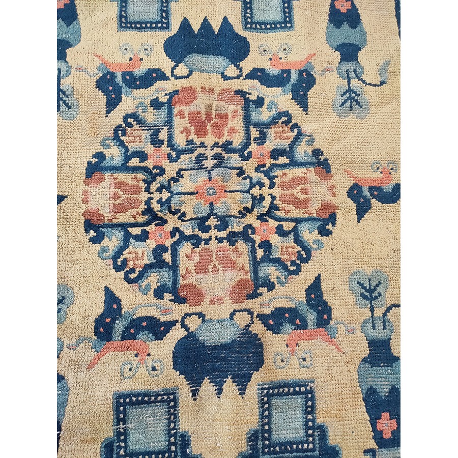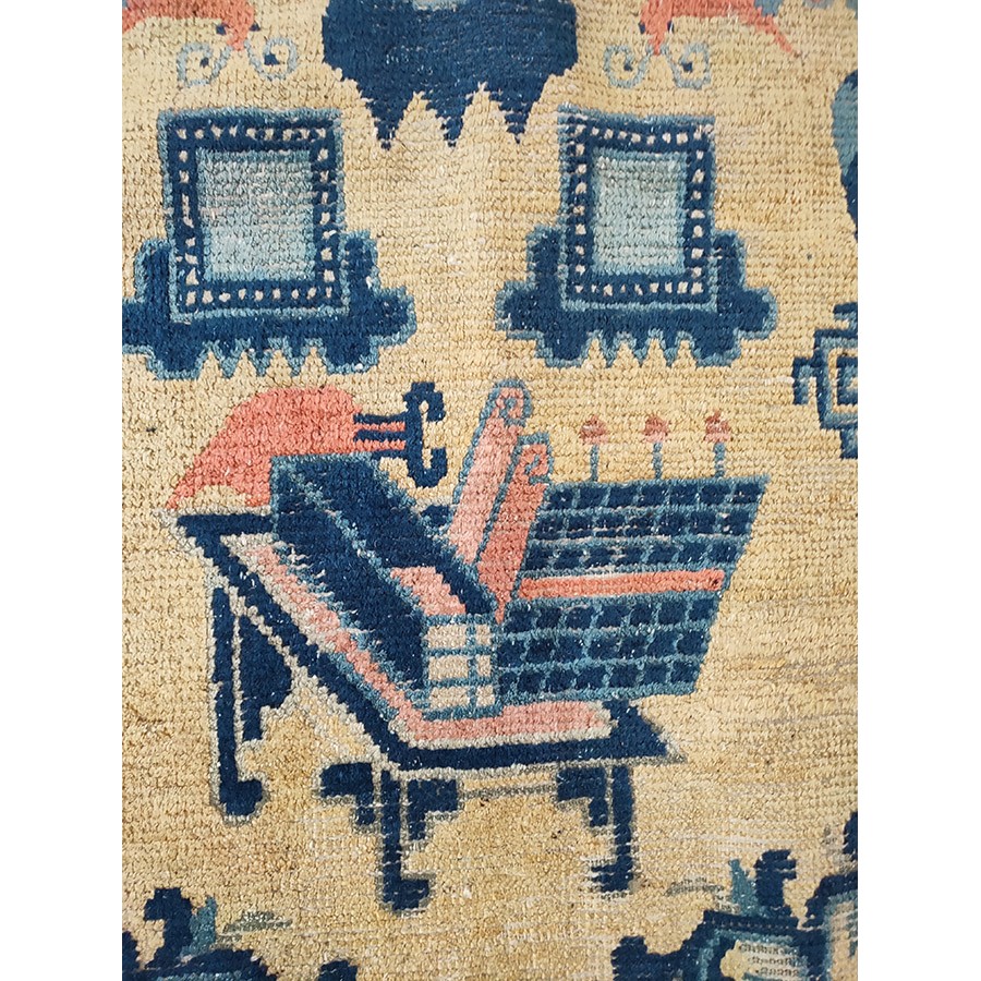DescriptionChineseCarpets made in China proper. See entries Ningshia, Peking, Art Deco. Chinese - NingxiaThe western Chinese province of Ningshia has a mostly Muslim population and is the source of many of the oldest Chinese carpets of the modern (Ming Dynasty and later) era. The designs are typically Chinese: fretwork or Greek key boarders, pacony palmettes, bats, butterflies, Fu dogs, clouds, dragons, shou symbols, etc. Pollar carpets designed to wrap around monastery columns and displaying a dragon above waves are a specialty. The weave is coarse and soft, with several wefts between knot rows and a longish pile. Yellow golds, dark and light blues are common colors. The outer most plain border on pre 1800 examples is a corrosive brown. Formats include: large square throne carpets, paralleled meditation runners, chair seats and scalloped backs. | |