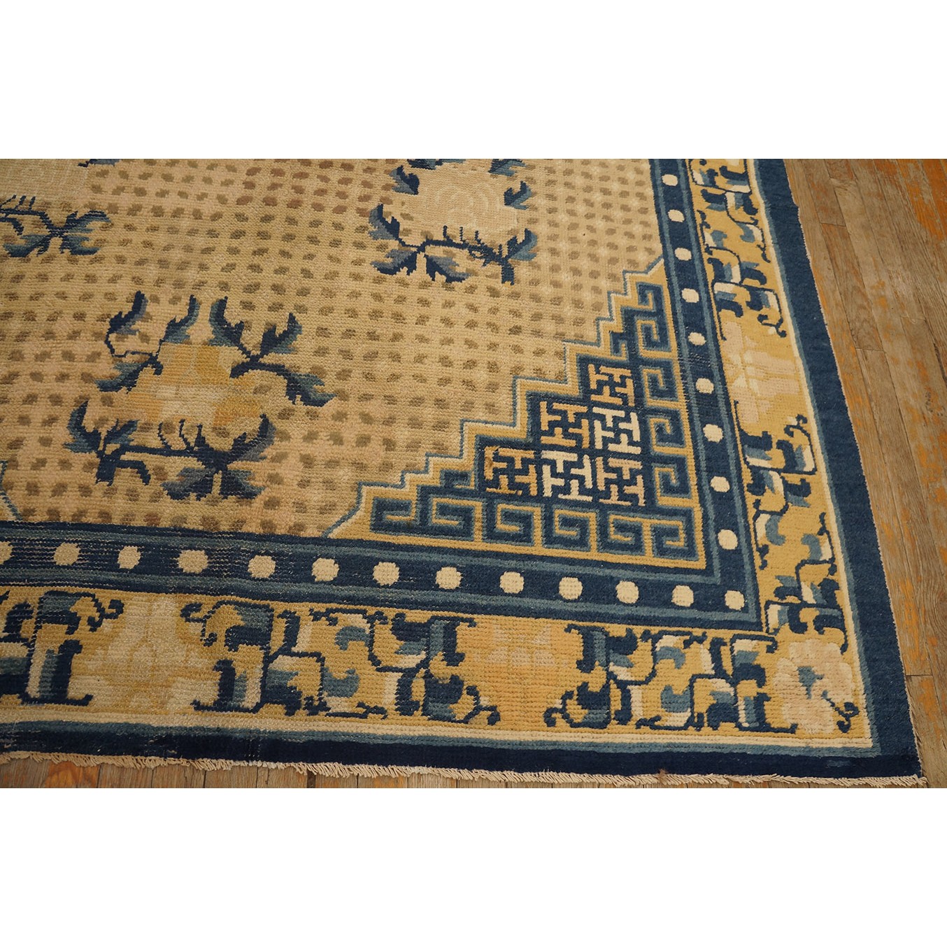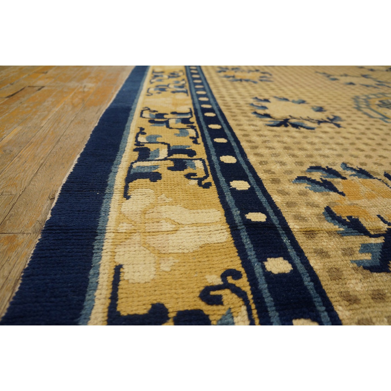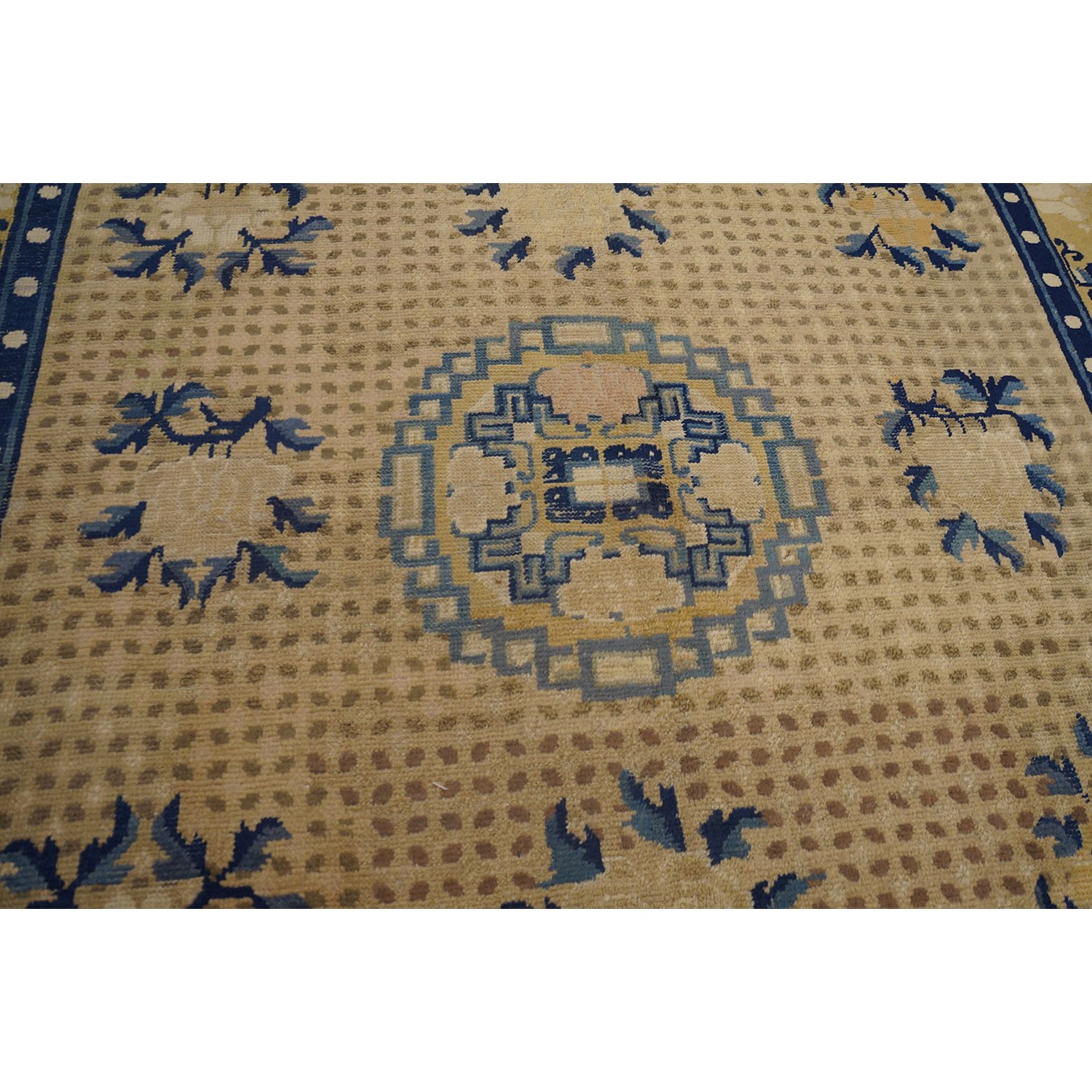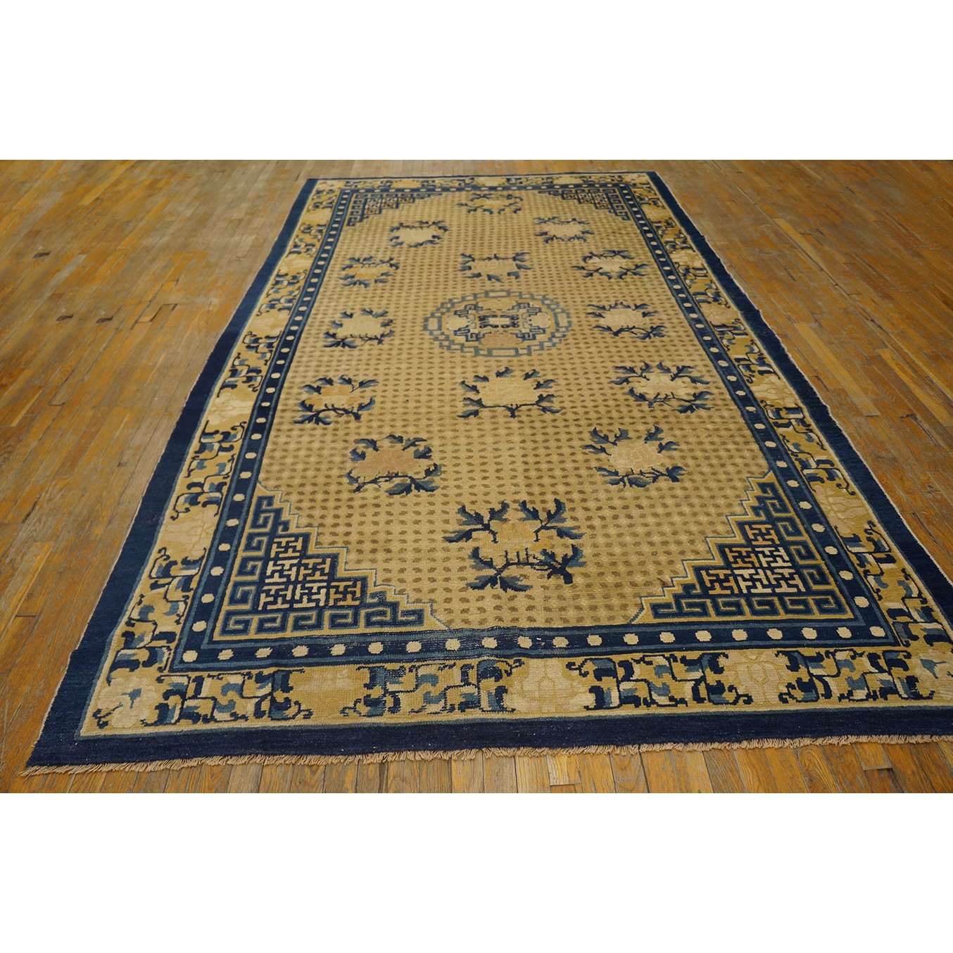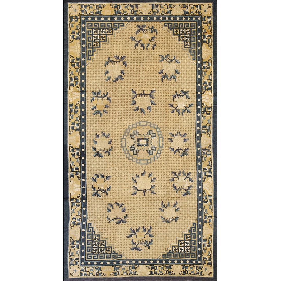 DescriptionChineseCarpets made in China proper. See entries Ningshia, Peking, Art Deco. Chinese - NingxiaThe western Chinese province of Ningshia has a mostly Muslim population and is the source of many of the oldest Chinese carpets of the modern (Ming Dynasty and later) era. The designs are typically Chinese: fretwork or Greek key boarders, pacony palmettes, bats, butterflies, Fu dogs, clouds, dragons, shou symbols, etc. Pollar carpets designed to wrap around monastery columns and displaying a dragon above waves are a specialty. The weave is coarse and soft, with several wefts between knot rows and a longish pile. Yellow golds, dark and light blues are common colors. The outer most plain border on pre 1800 examples is a corrosive brown. Formats include: large square throne carpets, paralleled meditation runners, chair seats and scalloped backs. | |