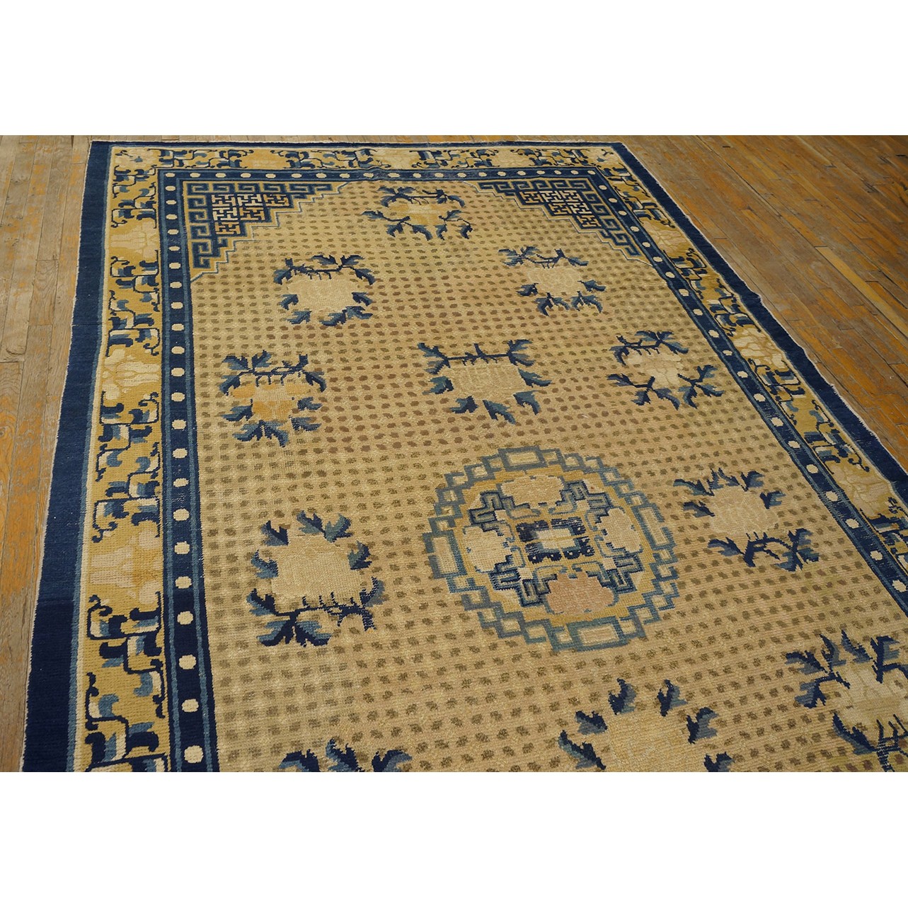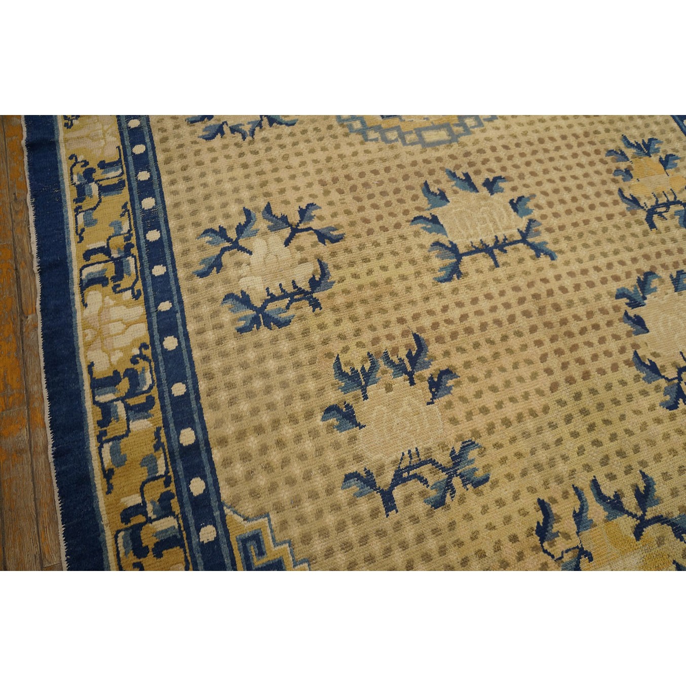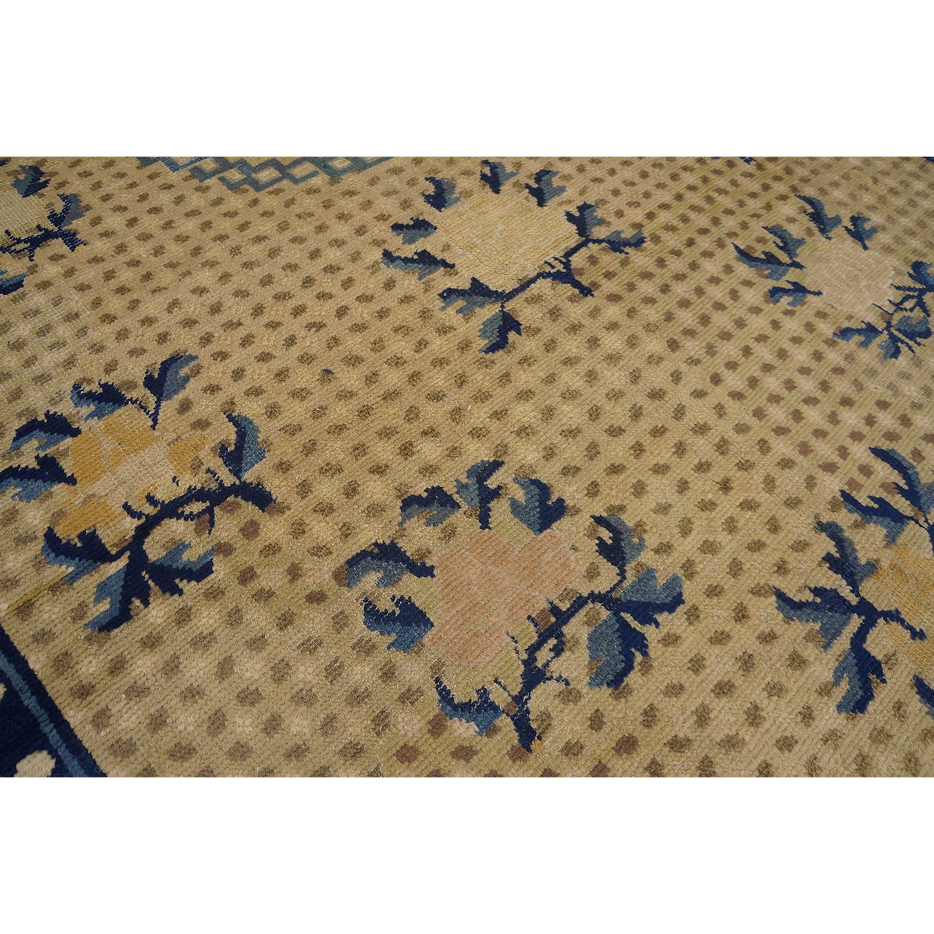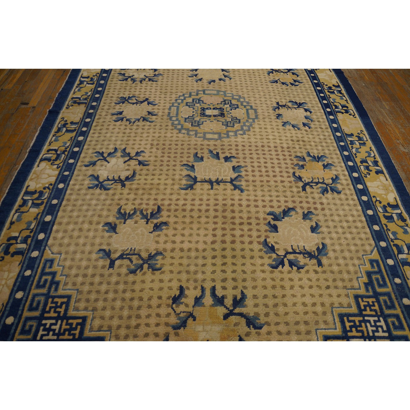 DescriptionChineseCarpets made in China proper. See entries Ningshia, Peking, Art Deco. Chinese - NingxiaThe western Chinese province of Ningshia has a mostly Muslim population and is the source of many of the oldest Chinese carpets of the modern (Ming Dynasty and later) era. The designs are typically Chinese: fretwork or Greek key boarders, pacony palmettes, bats, butterflies, Fu dogs, clouds, dragons, shou symbols, etc. Pollar carpets designed to wrap around monastery columns and displaying a dragon above waves are a specialty. The weave is coarse and soft, with several wefts between knot rows and a longish pile. Yellow golds, dark and light blues are common colors. The outer most plain border on pre 1800 examples is a corrosive brown. Formats include: large square throne carpets, paralleled meditation runners, chair seats and scalloped backs. | |